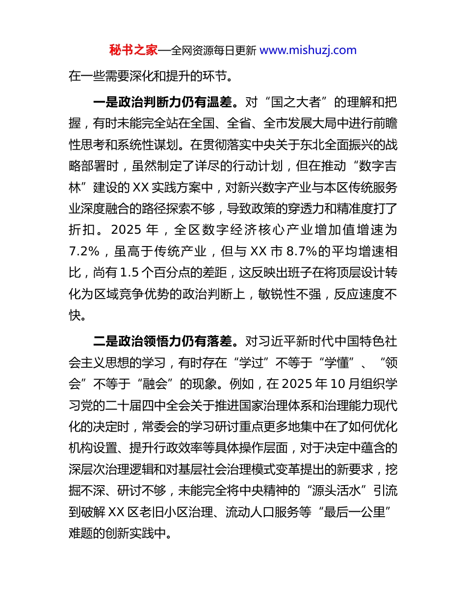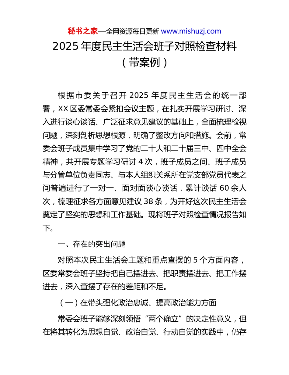 秘书之家—全网资源每日更新 www.mishuzj.com2025 年度民主生活会班子对照检查材料(带案例)根 据 市 委 关 于 召 开 2025 年 度 民 主 生 活 会 的 统 一 部署,XX 区委常委会紧扣会议主题,在扎实开展学习研讨、深入进行谈心谈话、广泛征求意见建议的基础上,全面梳理检视问题,深刻剖析思想根源,明确了整改方向和措施。会前,常委会班子成员集中学习了党的二十大和二十届三中、四中全会精神,共开展专题学习研讨 4 次,班子成员之间、班子成员与分管单位负责同志、与本人组织关系所在党支部党员代表之间普遍进行了一对一、面对面谈心谈话,累计谈话 60 余人次,梳理征求各方面意见建议 38 条,为开好这次民主生活会奠定了坚实的思想和工作基础。现将班子对照检查情况报告如下。一、存在的突出问题对照本次民主生活会主题和重点查摆的 5 个方面内容,区委常委会班子坚持把自己摆进去、把职责摆进去、把工作摆进去,深入查摆了存在的差距和不足。(一)在带头强化政治忠诚、提高政治能力方面常委会班子能够深刻领悟“两个确立”的决定性意义,但在将其转化为思想自觉、政治自觉、行动自觉的实践中,仍存秘书之家—全网资源每日更新 www.mishuzj.com在一些需要深化和提升的环节。一是政治判断力仍有温差。对“国之大者”的理解和把握,有时未能完全站在全国、全省、全市发展大局中进行前瞻性思考和系统性谋划。在贯彻落实中央关于东北全面振兴的战略部署时,虽然制定了详尽的行动计划,但在推动“数字吉林”建设的 XX 实践方案中,对新兴数字产业与本区传统服务业深度融合的路径探索不够,导致政策的穿透力和精准度打了折 扣 。 2025 年 , 全 区 数 字 经 济 核 心 产 业 增 加 值 增 速 为7.2%,虽高于传统产业,但与 XX 市 8.7%的平均增速相比,尚有 1.5 个百分点的差距,这反映出班子在将顶层设计转化为区域竞争优势的政治判断上,敏锐性不强,反应速度不快。二是政治领悟力仍有落差。对习近平新时代中国特色社会主义思想的学习,有时存在“学过”不等于“学懂”、“领会”不等于“融会”的现象。例如,在 2025 年 10 月组织学习党的二十届四中全会关于推进国家治理体系和治理能力现代化的决定时,常委会的学习研讨重点更多地集中在了如何优化机构设置、提升行政效率等具体操作层面,对于决定中蕴含的深层次治理逻辑和对基层社会治理模式变革提出的新要求,挖掘不深、研讨不够,未能完全将中央精神的“源头活水”引流到破解 XX 区老旧小区治理、流动人口服务等“最后一公里”难题的创新实践中。秘书之家—全网资源每日更新 www.mishuzj.com三是政治执行力仍有偏差。在执行党中央决策部署和省市委工作要求上,虽然做到了令行禁止、不打折扣,但有时存在机械执行、效果导向不鲜明的问题。2025 年上半年,在推动一项优化营商环境的改革举措时,虽然按时完成了文件转发、会议部署等“规定动作”,但在后续督导检查中发现,有3 个街道和 2 个区直部门仅仅是“照葫芦画瓢”,没有结合自身实际出台配套细则,导致政策在基层“悬空”,企业和群众的获得感不强。常委会对此问题的跟踪问效不彻底,未能及时纠偏,体现了在抓落实上“一竿子插到底”的韧劲不足,政治执行的闭环管理不严。(二)在带头固本培元、增强党性方面常委会班子注重用党的创新理论凝心铸魂,但对照更高标准,党性锤炼的自觉性和彻底性仍有提升空间。一是理论武装的转化效果不佳。班子成员虽然能够坚持个人自学和集中学习,但将学习成果转化为坚定理想信念、提升党性修养的内在动力不足。在学习贯彻习近平总书记关于作风建设的重要论述时,多数同志能够谈认识、谈体会,但对照检视自身在纠治“四风”隐形变异问题上的具体差距时,往往谈工作多、谈思想少,触及灵魂深处的自我革命精神不强。2025 年开展的党纪学习教育中,虽然组织了条例的逐章逐条学习,但在警示教育环节,少数班子成员未能真正把自己秘书之家—全网资源每日更新 www.mishuzj.com摆进去,认为案例中的人离自己很远、事与自己无关,党性修养的“防火墙”筑得不牢。二是精...