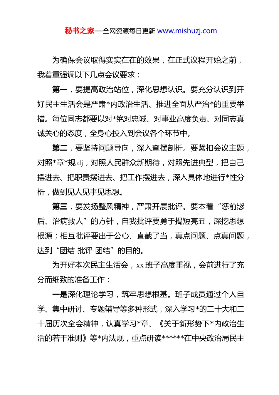 秘书之家—全网资源每日更新 www.mishuzj.com(23 篇)2025 年度民主生活会主持词汇编2025 年度民主生活会主持词同志们:现在正式开会。根据市委统一部署安排,并报经市委批准和督导组审核同意,今天我们隆重召开 2025 年度民主生活会。本次会议的主题是:这次民主生活会的主题是:深入学习贯彻**************思想,全面贯彻落实*的二十届三中、四中全会精神,深入贯彻落实******重要讲话和****批示精神,以打攻坚战、持久战的决心和恒心,锲而不舍落实中央八项规定精神,推进作风建设常态化长效化,以优良作风凝心聚力、真抓实干,聚焦高质量发展首要任务,扎实推进中国式现代化,为实现“十五五”良好开局奠定坚实基础。市委对本次民主生活会给予高度重视和亲切指导,市委常委、市委、市纪委同志亲临会议指导。让我们以最热烈的掌声,对各位领导在百忙之中莅临指导表示最诚挚的欢迎和最衷心的感谢!出席今天会议的有班子成员全体同志。同时,我们特别邀请了基层*组织的*员代表、群众代表和中层干部列席会议。这种安排既体现了*内民主,也有利于更好地听取各方面意见建议。秘书之家—全网资源每日更新 www.mishuzj.com为确保会议取得实实在在的效果,在正式议程开始之前,我着重强调以下几点会议要求:第一,要提高政治站位,深化思想认识。要充分认识到开好民主生活会是严肃*内政治生活、推进全面从严治*的重要举措。每位同志都要以对*绝对忠诚、对事业高度负责、对同志真诚关心的态度,全身心投入到会议各个环节中。第二,要坚持问题导向,深入查摆剖析。要紧扣会议主题,对照*章*规 dj,对照人民群众新期待,对照先进典型,把自己摆进去、把职责摆进去、把工作摆进去,深入具体地进行*性分析,做到见人见事见思想。第三,要发扬整风精神,严肃开展批评。要本着“惩前毖后、治病救人”的方针,自我批评要勇于揭短亮丑,深挖思想根源;相互批评要出于公心、直截了当,真点问题、点真问题,达到“团结-批评-团结”的目的。为开好本次民主生活会,xx 班子高度重视,会前进行了充分而细致的准备工作:一是深化理论学习,筑牢思想根基。班子成员通过个人自学、集中研讨、专题辅导等多种形式,深入学习*的二十大和二十届历次全会精神,认真学习*章、《关于新形势下*内政治生活的若干准则》等*内法规,重点研读******在中央政治局民主秘书之家—全网资源每日更新 www.mishuzj.com生活会上的重要讲话精神、******在二十届中纪委五次全会重要讲话精神以及关于全面从严治*、加强作风建设的重要论述。通过学习,进一步深化了认识、统一了思想,为开好民主生活会奠定了坚实的思想基础。二是广泛征求意见,倾听群众呼声。我们坚持开门搞活动,通过发放征求意见函、设置意见箱、召开座谈会、个别访谈、新媒体平台留言等多种渠道,广泛征求了各乡镇(街道)、市直各部门、部分“两代表一委员”、离退休老同志、基层*员干部和群众代表的意见建议。征集到原始意见建议,经梳理归纳,形成对班子的意见建议,对班子成员的个人意见建议。所有意见建议均已原汁原味反馈给班子和每位成员。三是深入谈心谈话,增进思想交流。严格落实“四必谈”要求,我与班子成员之间、班子成员相互之间、班子成员与分管单位主要负责同志、与本人组织关系所在*支部*员代表都开展了面对面、一对一的谈心谈话。大家敞开心扉、交流思想,既谈了工作也谈了思想,既肯定了成绩也指出了不足,增进了理解,消除了隔阂,凝聚了共识。四是认真撰写材料,深刻对照检查。在深入学习、广泛征求意见、深入谈心谈话的基础上,我主持起草了班子对照检查材料,班子成员都认真撰写了个人发言提纲。大家紧扣主题,秘书之家—全网资源每日更新 www.mishuzj.com重点围绕五个带头方面,深入查找突出问题,深刻剖析问题根源,明确了努力方向和整改措施。本次会议共有五项议程:第一项,由我通报班子上一年度民主生活会整改措施落实情况和本次民主生活会征求意见情况;第二项,由我代表班子作对照检查;第三项,班子成员逐一进行个人对照检查,并相互开展批评;第四项,请市委督导组领导讲话;第五项,由我代表班子作会议总结和表态...