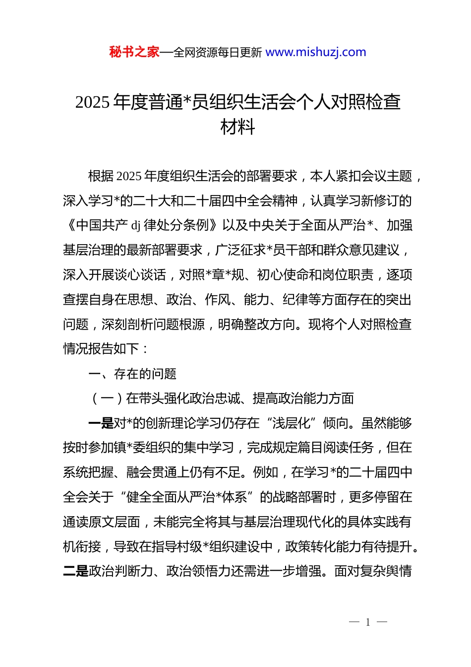秘书之家—全网资源每日更新 www.mishuzj.com2025 年度普通*员组织生活会个人对照检查材料根据 2025 年度组织生活会的部署要求,本人紧扣会议主题,深入学习*的二十大和二十届四中全会精神,认真学习新修订的《中国共产 dj 律处分条例》以及中央关于全面从严治*、加强基层治理的最新部署要求,广泛征求*员干部和群众意见建议,深入开展谈心谈话,对照*章*规、初心使命和岗位职责,逐项查摆自身在思想、政治、作风、能力、纪律等方面存在的突出问题,深刻剖析问题根源,明确整改方向。现将个人对照检查情况报告如下:一、存在的问题(一)在带头强化政治忠诚、提高政治能力方面一是对*的创新理论学习仍存在“浅层化”倾向。虽然能够按时参加镇*委组织的集中学习,完成规定篇目阅读任务,但在系统把握、融会贯通上仍有不足。例如,在学习*的二十届四中全会关于“健全全面从严治*体系”的战略部署时,更多停留在通读原文层面,未能完全将其与基层治理现代化的具体实践有机衔接,导致在指导村级*组织建设中,政策转化能力有待提升。二是政治判断力、政治领悟力还需进一步增强。面对复杂舆情— 1 —秘书之家—全网资源每日更新 www.mishuzj.com和社会思潮时,有时缺乏第一时间从政治高度辨析问题本质的敏锐性。比如在去年村集体资产清查过程中,个别群众通过网络平台发表不实言论,起初仅将其视为普通信访问题处理,未及时意识到背后可能存在的意识形态风险,后续虽经引导化解,但也暴露出自身政治警觉性的短板。三是贯彻落实上级决策部署存在“温差”。在推进乡村振兴重点任务中,对产业振兴与生态宜居协同推进的理解不够深入,曾出现重项目落地速度、轻群众参与意愿的现象,个别自然村人居环境整治方案因前期调研不充分,引发部分村民质疑,反映出政治执行力还需向末端延伸。(二)在带头固本培元、增强*性方面一是理想信念的根基扎得不够牢固。随着基层事务性工作增多,有时不自觉地将精力集中于应付检查、完成指标,忽视了常态化*性锻炼的重要性。参加主题*日活动时,虽然全程出席,但主动发言少,思想交锋不足,存在“走过场”现象。特别是在*史学习教育常态化推进中,未能有效将红色资源转化为坚定信仰的精神滋养,到本地烈士故居开展现场教学后,缺少后续的研讨深化和行动转化。二是宗旨意识有所弱化。作为镇班子成员联系村制度的责任人,每月下村走访已形成机制,但“走心”程度不够。三是批评和自我批评武器运用不到位。在— 2 —秘书之家—全网资源每日更新 www.mishuzj.com班子内部开展相互批评时,顾虑较多,怕影响团结、伤了和气,多以“建议式”表达代替直截了当地指出问题。如在一次项目调度会上,对某同志推进进度滞后的问题,仅用“希望加快节奏”一带而过,没有点明具体症结,削弱了*内政治生活的战斗性。(三)在带头敬畏人民、敬畏组织、敬畏法纪方面一是群众立场站得不够稳。在推动征地拆迁工作中,虽然依法依规履行程序,但在政策解释环节,习惯使用术语化表达,未能充分考虑老年群体理解能力,导致个别农户产生误解,一度引发抵触情绪。事后反思,这反映出心中虽有群众,但换位思考不够,服务方式仍显生硬。二是执行组织程序存在松懈现象。在干部推荐考察工作中,曾因时间紧迫,简化了个别谈话了解环节,仅通过电话沟通代替实地走访,影响了考察全面性。尽管最终人选符合岗位要求,但程序正义不容折扣,这一行为违背了民主集中制原则的基本要求。三是纪律规矩的“高压线”意识需持续强化。对《中国共产 dj 律处分条例》的学习多为阶段性集中学习,日常自学坚持不够。在公务接待中,虽未发生超标接待情况,但对于非实质性陪同人员的精简控制不够严格,存在“人情惯性”,距离“时时处处守纪律”的高标准尚有差距。— 3 —秘书之家—全网资源每日更新 www.mishuzj.com(四)在带头干事创业、担当作为方面一是攻坚克难的锐气有所减退。面对历史遗留的宅基地纠纷问题,存在“求稳怕乱”心态,倾向于采取调解缓释而非依法裁决的方式处理,致使两起案件拖延超过一年未能彻底化解,群众反复上访,影响了基层治理公信力。分析原因,在于怕触动既得利益...