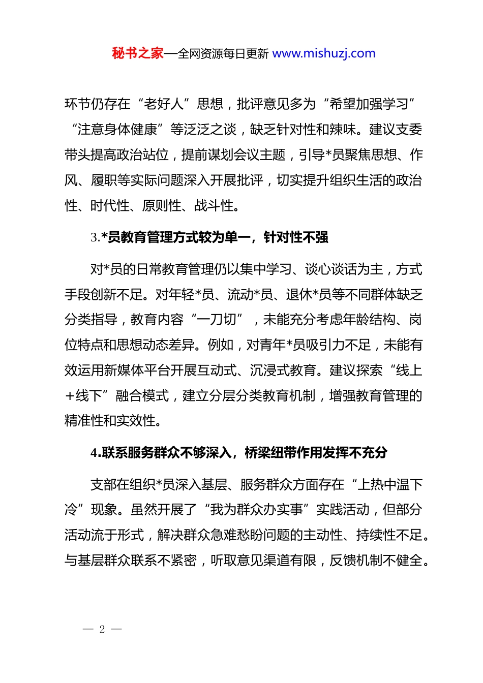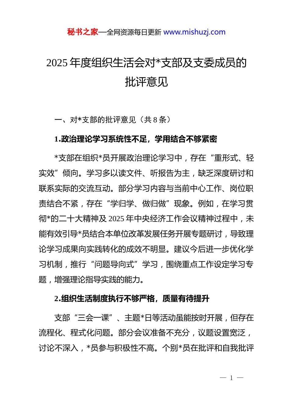 秘书之家—全网资源每日更新 www.mishuzj.com2025 年度组织生活会对*支部及支委成员的批评意见一、对*支部的批评意见(共 8 条)1.政治理论学习系统性不足,学用结合不够紧密*支部在组织*员开展政治理论学习中,存在“重形式、轻实效”倾向。学习多以读文件、听报告为主,缺乏深度研讨和联系实际的交流互动。部分学习内容与当前中心工作、岗位职责结合不紧,存在“学归学、做归做”现象。例如,在学习贯彻*的二十大精神及 2025 年中央经济工作会议精神过程中,未能有效引导*员结合本单位改革发展任务开展专题研讨,导致理论学习成果向实践转化的成效不明显。建议今后进一步优化学习机制,推行“问题导向式”学习,围绕重点工作设定学习专题,增强理论指导实践的能力。2.组织生活制度执行不够严格,质量有待提升支部“三会一课”、主题*日等活动虽能按时开展,但存在流程化、程式化问题。部分会议准备不充分,议题设置宽泛,讨论不深入,*员参与积极性不高。个别*员在批评和自我批评— 1 —秘书之家—全网资源每日更新 www.mishuzj.com环节仍存在“老好人”思想,批评意见多为“希望加强学习”“注意身体健康”等泛泛之谈,缺乏针对性和辣味。建议支委带头提高政治站位,提前谋划会议主题,引导*员聚焦思想、作风、履职等实际问题深入开展批评,切实提升组织生活的政治性、时代性、原则性、战斗性。3.*员教育管理方式较为单一,针对性不强对*员的日常教育管理仍以集中学习、谈心谈话为主,方式手段创新不足。对年轻*员、流动*员、退休*员等不同群体缺乏分类指导,教育内容“一刀切”,未能充分考虑年龄结构、岗位特点和思想动态差异。例如,对青年*员吸引力不足,未能有效运用新媒体平台开展互动式、沉浸式教育。建议探索“线上+线下”融合模式,建立分层分类教育机制,增强教育管理的精准性和实效性。4.联系服务群众不够深入,桥梁纽带作用发挥不充分支部在组织*员深入基层、服务群众方面存在“上热中温下冷”现象。虽然开展了“我为群众办实事”实践活动,但部分活动流于形式,解决群众急难愁盼问题的主动性、持续性不足。与基层群众联系不紧密,听取意见渠道有限,反馈机制不健全。— 2 —秘书之家—全网资源每日更新 www.mishuzj.com例如,在某次惠民政策宣传中,仅停留在张贴海报、发放传单层面,未组织*员入户走访、答疑解惑,导致政策知晓率不高。建议健全*员联系群众制度,推动*员常态化下沉一线,真正把工作做到群众心坎上。5.推动 dj 与业务融合力度不足,存在“两张皮”现象dj 工作与业务工作同谋划、同部署、同落实的机制不健全。支委在研究支部工作时,对如何围绕中心任务发挥 dj 引领作用思考不多、举措不多。部分*员认为 dj 工作是“额外负担”,参与积极性不高。例如,在推进某重点项目过程中,未及时设立*员先锋岗、划分责任区,未能有效激发*员在攻坚任务中的先锋模范作用。建议支委强化融合意识,将 dj 工作嵌入业务链条,在重点任务中设立 dj 项目,实现互促共进。6.*员先锋模范作用发挥不均衡,示范引领效应不强支部内*员作用发挥存在“两极分化”现象,部分骨干*员作用突出,但个别*员身份意识淡薄,参加组织活动不积极,完成分配任务打折扣。在急难险重任务面前,主动请缨、冲锋在前的氛围不够浓厚。先进典型选树宣传力度不足,未能形成学先进、赶先进的良好风尚。建议建立健全*员量化考评机制,强— 3 —秘书之家—全网资源每日更新 www.mishuzj.com化结果运用,加大典型宣传力度,激发全体*员创先争优的内生动力。7.意识形态工作责任制落实不够到位,风险防范意识需加强支部对意识形态领域风险的敏感性不足,对*员思想动态掌握不全面。在应对网络舆情、防范错误思潮渗透方面缺乏预案和有效手段。组织生活会、谈心谈话中对意识形态问题提醒不多、要求不严。例如,在某次网络热点事件中,未及时组织*员开展正向引导,存在一定的风险隐患。建议支委定期分析研判意识形态形势,加强对*员的网络行为规范教育,守好思想阵地。8.支部自身建设有待加强,支委履职能力需提升支委班子在统筹谋划、组织协调、推动落实等方面能力存在短板。...