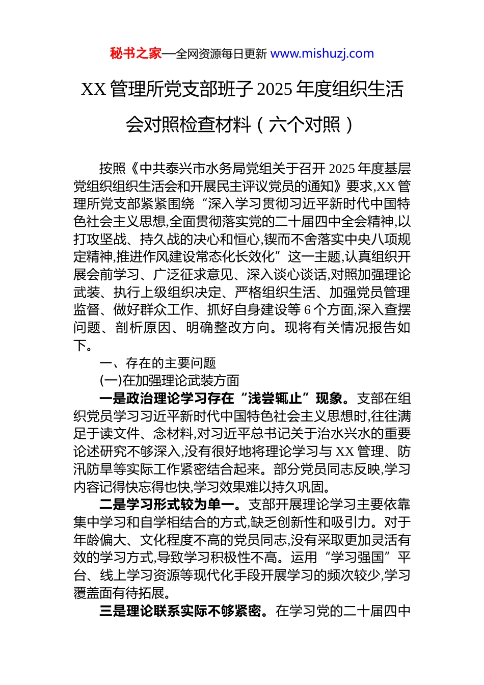 秘书之家—全网资源每日更新 www.mishuzj.comXX 管理所党支部班子 2025 年度组织生活会对照检查材料(六个对照)按照《中共泰兴市水务局党组关于召开 2025 年度基层党组织组织生活会和开展民主评议党员的通知》要求,XX 管理所党支部紧紧围绕“深入学习贯彻习近平新时代中国特色社会主义思想,全面贯彻落实党的二十届四中全会精神,以打攻坚战、持久战的决心和恒心,锲而不舍落实中央八项规定精神,推进作风建设常态化长效化”这一主题,认真组织开展会前学习、广泛征求意见、深入谈心谈话,对照加强理论武装、执行上级组织决定、严格组织生活、加强党员管理监督、做好群众工作、抓好自身建设等 6 个方面,深入查摆问题、剖析原因、明确整改方向。现将有关情况报告如下。一、存在的主要问题(一)在加强理论武装方面一是政治理论学习存在“浅尝辄止”现象。支部在组织党员学习习近平新时代中国特色社会主义思想时,往往满足于读文件、念材料,对习近平总书记关于治水兴水的重要论述研究不够深入,没有很好地将理论学习与 XX 管理、防汛防旱等实际工作紧密结合起来。部分党员同志反映,学习内容记得快忘得也快,学习效果难以持久巩固。二是学习形式较为单一。支部开展理论学习主要依靠集中学习和自学相结合的方式,缺乏创新性和吸引力。对于年龄偏大、文化程度不高的党员同志,没有采取更加灵活有效的学习方式,导致学习积极性不高。运用“学习强国”平台、线上学习资源等现代化手段开展学习的频次较少,学习覆盖面有待拓展。三是理论联系实际不够紧密。在学习党的二十届四中秘书之家—全网资源每日更新 www.mishuzj.com全会精神和中央八项规定精神学习教育过程中,存在就学习谈学习的倾向,没有很好地把学习成果转化为推动 XX 安全运行、提升过闸服务质量的具体举措。对如何将新发展理念贯穿到防汛防旱、引排水调度等具体业务工作中,思考和实践都不够深入。(二)在执行上级组织决定方面一是贯彻落实上级决策部署存在“中梗阻”。对于局党组部署的重点工作任务,有时存在等待观望、被动应付的情况,没有做到雷厉风行、立说立行。在执行过程中,偶尔出现打折扣、搞变通的现象,影响了工作落实的时效性和完整性。二是请示报告制度执行不够严格。在遇到重大事项、突发情况时,个别同志存在先斩后奏或事后补报的情况,请示报告的及时性和规范性有待加强。对于 XX 设备故障、汛期调度等专业性较强的事项,有时因担心上级不了解具体情况而自行决定,未能严格按程序请示。三是工作标准存在就低不就高现象。在落实局党组安排的创建任务、迎检工作时,有时满足于“过得去”,缺乏争先创优的进取意识。对标先进找差距的主动性不强,工作中存在按部就班、因循守旧的惯性思维。(三)在严格组织生活方面一是“三会一课”质量有待提升。支部党员大会、支委会、党小组会和党课的召开虽然能够按时完成,但会议质量参差不齐。部分会议存在议题不够聚焦、讨论不够深入、决议执行跟踪不够到位等问题。党课内容与 XX 管理实际结合不够紧密,对党员的教育引导作用发挥不够充分。二是主题党日活动形式不够丰富。支部开展主题党日活动时,形式相对单一,主要以学习文件、观看视频为主,缺乏实践性、体验性强的活动载体。与兄弟单位联合开展活动、深入一线岗位开展志愿服务等活动较少,党员参与积极性不够高。秘书之家—全网资源每日更新 www.mishuzj.com三是批评与自我批评开展不够深入。在组织生活会上,存在“好人主义”倾向,批评意见大多停留在工作层面,触及思想根源的少;自我批评多讲客观困难,少讲主观不足;相互批评怕伤和气、怕得罪人,辣味不足、红脸出汗不够。(四)在加强党员管理监督方面一是党员日常教育管理存在薄弱环节。对于在一线值班、轮班作业的党员同志,日常教育管理覆盖不够全面,存在管理盲区。个别党员同志组织纪律观念有所松懈,迟到早退、工作时间处理私事等现象时有发生,支部发现问题、纠正偏差的能力需要加强。二是党员先锋模范作用发挥不够充分。在急难险重任务面前,党员冲在前、干在先的意识还需进一步强化。在防汛抢险、设备抢修等关键时刻,个别党员与普通职工相比没有体现出明显的先进性,“一名党员一面旗...