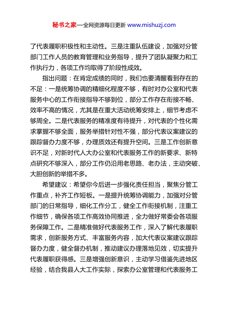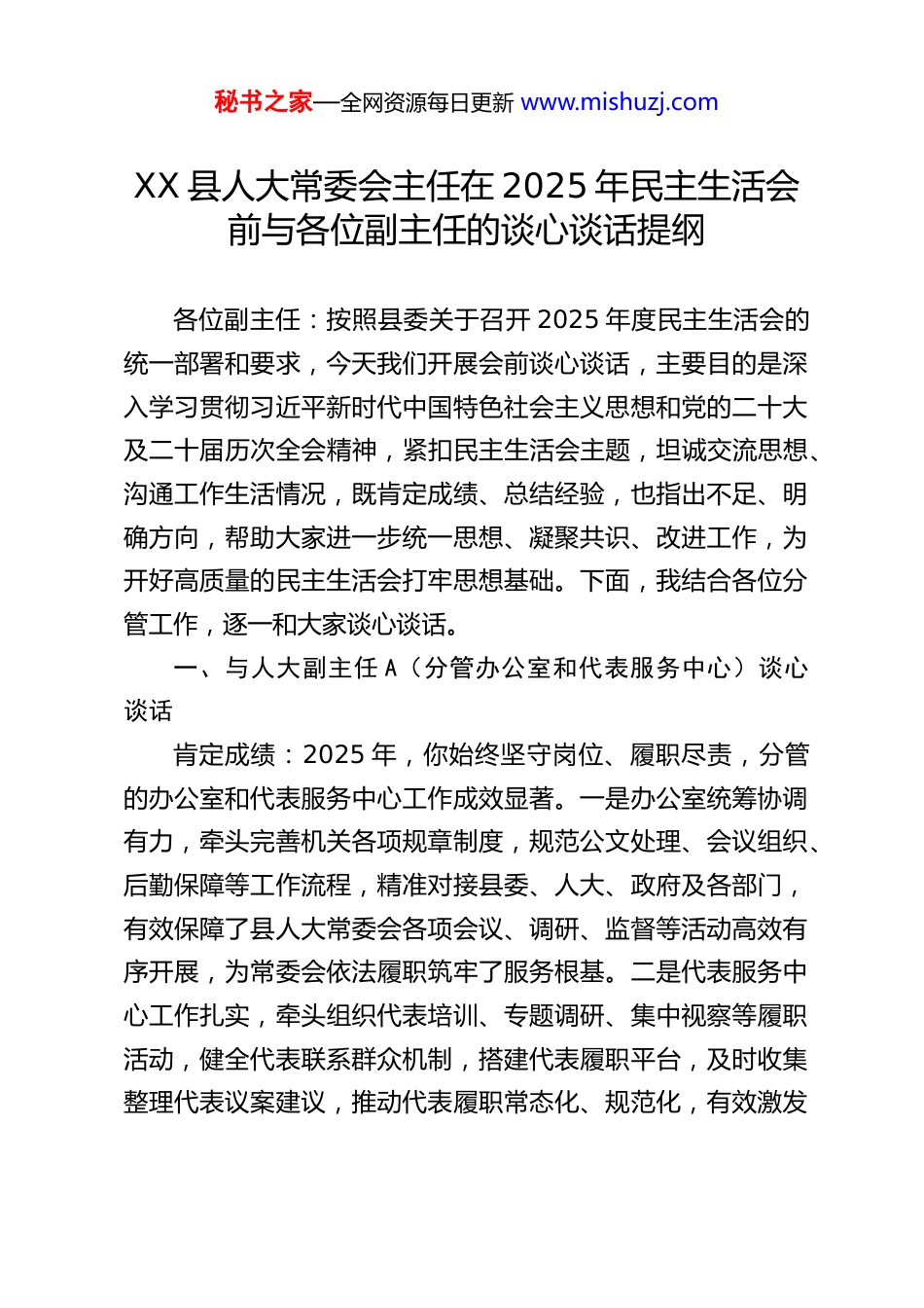 秘书之家—全网资源每日更新 www.mishuzj.comXX 县人大常委会主任在 2025 年民主生活会前与各位副主任的谈心谈话提纲各位副主任:按照县委关于召开 2025 年度民主生活会的统一部署和要求,今天我们开展会前谈心谈话,主要目的是深入学习贯彻习近平新时代中国特色社会主义思想和党的二十大及二十届历次全会精神,紧扣民主生活会主题,坦诚交流思想、沟通工作生活情况,既肯定成绩、总结经验,也指出不足、明确方向,帮助大家进一步统一思想、凝聚共识、改进工作,为开好高质量的民主生活会打牢思想基础。下面,我结合各位分管工作,逐一和大家谈心谈话。一、与人大副主任 A(分管办公室和代表服务中心)谈心谈话肯定成绩:2025 年,你始终坚守岗位、履职尽责,分管的办公室和代表服务中心工作成效显著。一是办公室统筹协调有力,牵头完善机关各项规章制度,规范公文处理、会议组织、后勤保障等工作流程,精准对接县委、人大、政府及各部门,有效保障了县人大常委会各项会议、调研、监督等活动高效有序开展,为常委会依法履职筑牢了服务根基。二是代表服务中心工作扎实,牵头组织代表培训、专题调研、集中视察等履职活动,健全代表联系群众机制,搭建代表履职平台,及时收集整理代表议案建议,推动代表履职常态化、规范化,有效激发秘书之家—全网资源每日更新 www.mishuzj.com了代表履职积极性和主动性。三是注重队伍建设,加强对分管部门工作人员的教育管理和业务指导,提升了团队凝聚力和工作执行力,各项工作均取得了阶段性成效。指出问题:在肯定成绩的同时,我们也要清醒看到存在的不足:一是统筹协调的精细化程度不够,有时对办公室和代表服务中心的工作衔接指导不够到位,部分工作存在衔接不畅、效率不高的情况,尤其是在重大活动统筹安排上,细节考虑不够周全。二是代表服务的精准度有待提升,对代表的个性化需求掌握不够全面,服务举措针对性不强,部分代表议案建议的跟踪督办力度不够,办理质效还有提升空间。三是工作创新意识不足,对新时代人大办公室和代表服务工作的新要求、新特点研究不够深入,部分工作仍沿用老思路、老办法,主动突破、大胆创新的举措不多。希望建议:希望你今后进一步强化责任担当,聚焦分管工作重点,补齐工作短板。一是提升统筹协调能力,加强对分管部门的日常指导,细化工作分工,健全工作衔接机制,注重工作细节,确保各项工作高效协同推进,全力做好常委会各项服务保障工作。二是精准做好代表服务工作,深入了解代表履职需求,创新服务方式、丰富服务内容,加大代表议案建议跟踪督办力度,健全督办机制,推动建议办理落地见效,切实提升代表履职获得感。三是增强创新意识,主动学习借鉴先进地区经验,结合我县人大工作实际,探索办公室管理和代表服务工秘书之家—全网资源每日更新 www.mishuzj.com作的新思路、新举措,不断提升工作质效,为常委会依法履职提供更有力的支撑。二、与人大副主任 B(分管法制工委)谈心谈话肯定成绩:2025 年,你立足法制工委分管职责,坚守法治底线,主动担当作为,各项工作成效突出。一是法治监督工作扎实有效,牵头开展法治政府建设监督、执法检查、规范性文件备案审查等工作,重点围绕群众关心的热点难点问题,加大对行政执法部门的监督力度,推动依法行政、公正司法,切实维护了宪法法律权威。二是法治宣传教育深入推进,牵头组织开展宪法宣传周、法治讲座等活动,创新宣传方式,拓宽宣传渠道,提升了干部群众的法治意识和法治素养,营造了良好的法治氛围。三是工委自身建设不断加强,注重加强法制工委工作人员的业务培训,提升专业能力,规范工作流程,确保各项工作有序开展、落到实处。指出问题:对照新时代人大法治工作要求,仍存在一些不足:一是执法检查的深度和力度不够,有时存在“重检查、轻整改”的情况,对检查中发现的问题,跟踪督办不够到位,部分问题整改不彻底、不长效。二是规范性文件备案审查工作精准度有待提升,对备案文件的合法性、合理性审查不够细致,审查方式较为单一,对一些隐性问题发现不够及时,审查质效还有提升空间。三是法治宣传教育形式不够丰富,针对性和实效...