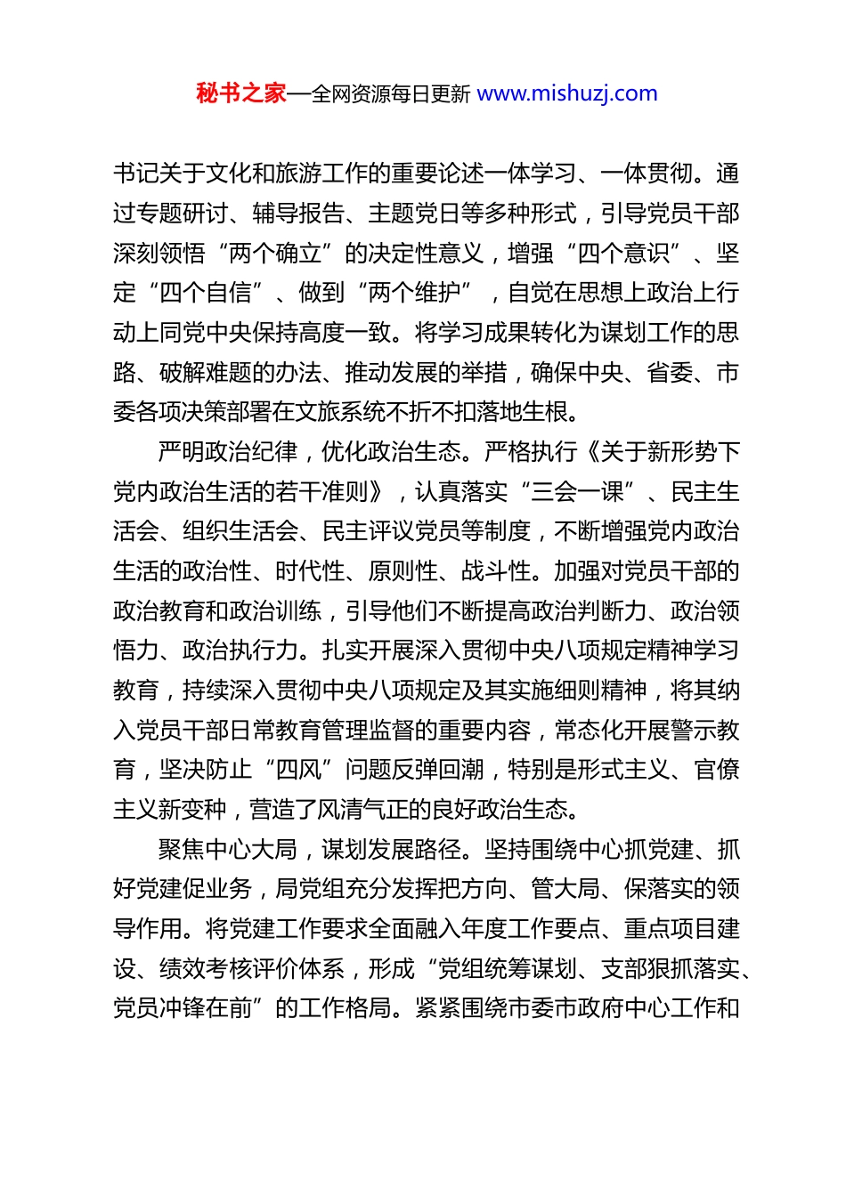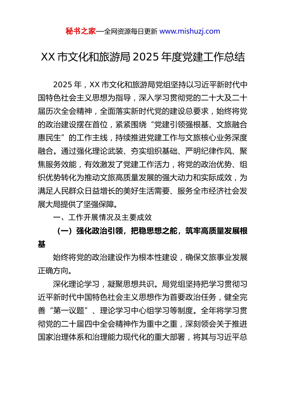 秘书之家—全网资源每日更新 www.mishuzj.comXX 市文化和旅游局 2025 年度党建工作总结2025 年,XX 市文化和旅游局党组坚持以习近平新时代中国特色社会主义思想为指导,深入学习贯彻党的二十大及二十届历次全会精神,全面落实新时代党的建设总要求,始终将党的政治建设摆在首位,紧紧围绕“党建引领强根基、文旅融合惠民生”的工作主线,持续推进党建工作与文旅核心业务深度融合。通过强化理论武装、夯实组织基础、严明纪律作风、聚焦服务效能,有效激发了党建工作活力,将党的政治优势、组织优势转化为推动文旅高质量发展的强大动力和实际成效,为满足人民群众日益增长的美好生活需要、服务全市经济社会发展大局提供了坚强保障。一、工作开展情况及主要成效(一)强化政治引领,把稳思想之舵,筑牢高质量发展根基始终将党的政治建设作为根本性建设,确保文旅事业发展正确方向。深化理论学习,凝聚思想共识。局党组坚持把学习贯彻习近平新时代中国特色社会主义思想作为首要政治任务,健全完善“第一议题”、理论学习中心组学习等制度。全年将学习贯彻党的二十届四中全会精神作为重中之重,深刻领会关于推进国家治理体系和治理能力现代化的重大部署,将其与习近平总秘书之家—全网资源每日更新 www.mishuzj.com书记关于文化和旅游工作的重要论述一体学习、一体贯彻。通过专题研讨、辅导报告、主题党日等多种形式,引导党员干部深刻领悟“两个确立”的决定性意义,增强“四个意识”、坚定“四个自信”、做到“两个维护”,自觉在思想上政治上行动上同党中央保持高度一致。将学习成果转化为谋划工作的思路、破解难题的办法、推动发展的举措,确保中央、省委、市委各项决策部署在文旅系统不折不扣落地生根。严明政治纪律,优化政治生态。严格执行《关于新形势下党内政治生活的若干准则》,认真落实“三会一课”、民主生活会、组织生活会、民主评议党员等制度,不断增强党内政治生活的政治性、时代性、原则性、战斗性。加强对党员干部的政治教育和政治训练,引导他们不断提高政治判断力、政治领悟力、政治执行力。扎实开展深入贯彻中央八项规定精神学习教育,持续深入贯彻中央八项规定及其实施细则精神,将其纳入党员干部日常教育管理监督的重要内容,常态化开展警示教育,坚决防止“四风”问题反弹回潮,特别是形式主义、官僚主义新变种,营造了风清气正的良好政治生态。聚焦中心大局,谋划发展路径。坚持围绕中心抓党建、抓好党建促业务,局党组充分发挥把方向、管大局、保落实的领导作用。将党建工作要求全面融入年度工作要点、重点项目建设、绩效考核评价体系,形成“党组统筹谋划、支部狠抓落实、党员冲锋在前”的工作格局。紧紧围绕市委市政府中心工作和秘书之家—全网资源每日更新 www.mishuzj.com人民群众对高品质文旅生活的新期待,将党建引领贯穿于文化惠民、遗产保护、文旅融合、产业升级、市场治理等各领域全过程,以高质量党建引领保障文旅事业产业高质量发展。(二)夯实组织基础,建强战斗堡垒,激发干事创业活力牢固树立大抓基层的鲜明导向,着力增强基层党组织的政治功能和组织功能。建强支部堡垒。深入推进党支部标准化规范化建设,选优配强支部班子,严格落实各项组织生活制度。围绕文旅重点工作、重大项目、急难险重任务,设立“党员先锋岗”、划定“党员责任区”、组建“党员突击队”,引导各党支部在服务群众、推动发展、攻坚克难中发挥战斗堡垒作用。例如,在“城乡 15 分钟品质文化生活圈”建设、重点文旅项目推进、重大节庆活动保障等工作中,相关支部党员带头冲锋、连续作战,确保了各项任务高效完成。发挥党员作用。加强党员教育管理监督,严把党员入口关提升党员队伍质量。注重在业务一线、服务前沿、项目攻坚中锻炼和考验党员,引导广大党员立足岗位作贡献,成为政策宣传的“讲解员”、文化惠民的“服务员”、文旅融合的“实践员”。全年组织党员志愿服务队深入乡村、社区、校园开展常态化服务,党员干部在“一村一年一场戏”、四季文旅品牌活动、非遗保护传承等工作中主动担当策划者、组织者和保障者,先锋模范作用得到充分彰显。秘书之家—全...