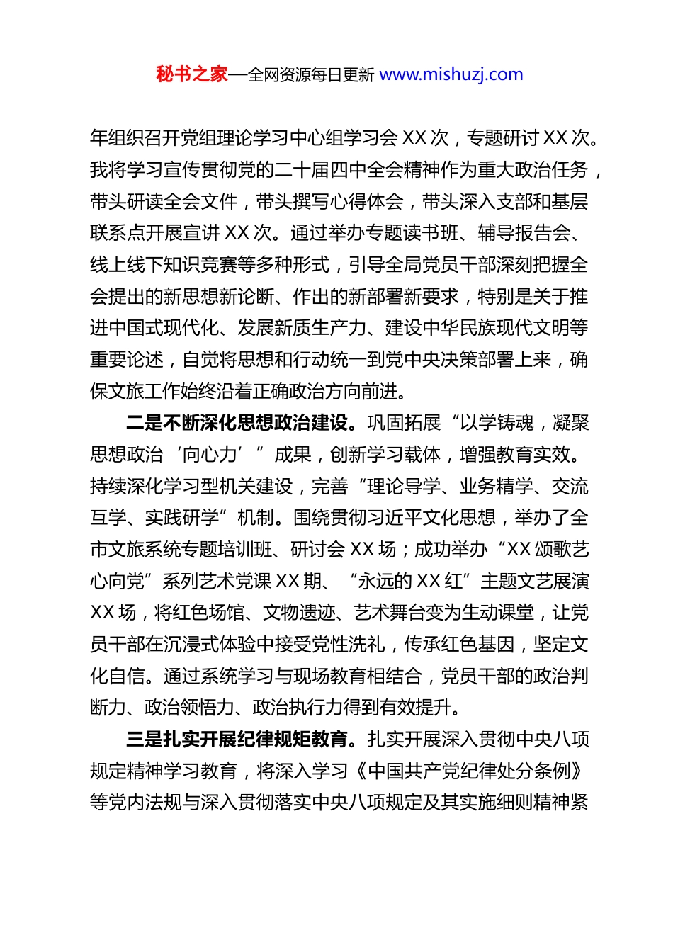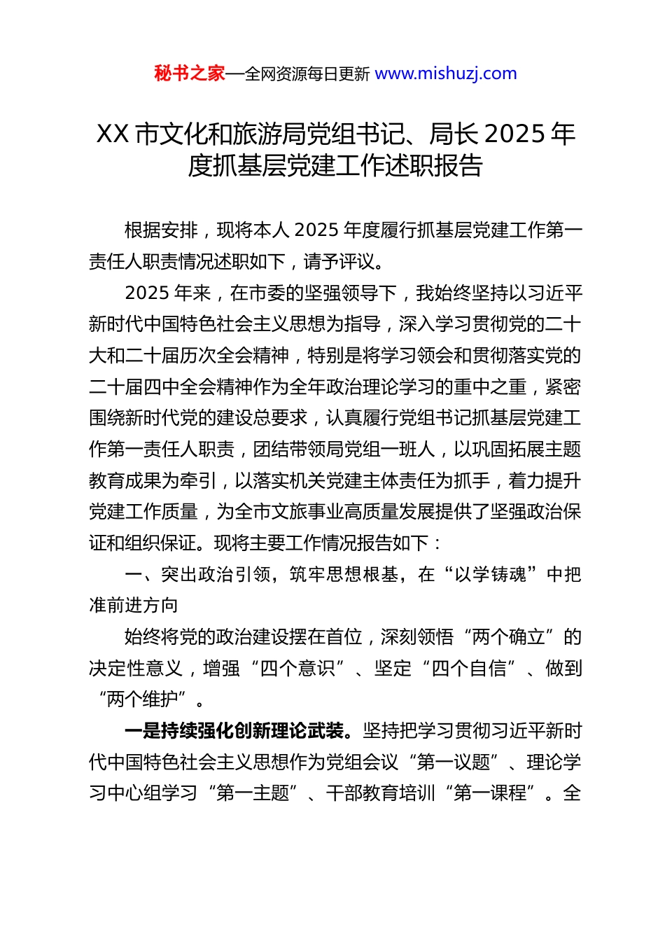 秘书之家—全网资源每日更新 www.mishuzj.comXX 市文化和旅游局党组书记、局长 2025 年度抓基层党建工作述职报告根据安排,现将本人 2025 年度履行抓基层党建工作第一责任人职责情况述职如下,请予评议。2025 年来,在市委的坚强领导下,我始终坚持以习近平新时代中国特色社会主义思想为指导,深入学习贯彻党的二十大和二十届历次全会精神,特别是将学习领会和贯彻落实党的二十届四中全会精神作为全年政治理论学习的重中之重,紧密围绕新时代党的建设总要求,认真履行党组书记抓基层党建工作第一责任人职责,团结带领局党组一班人,以巩固拓展主题教育成果为牵引,以落实机关党建主体责任为抓手,着力提升党建工作质量,为全市文旅事业高质量发展提供了坚强政治保证和组织保证。现将主要工作情况报告如下:一、突出政治引领,筑牢思想根基,在“以学铸魂”中把准前进方向始终将党的政治建设摆在首位,深刻领悟“两个确立”的决定性意义,增强“四个意识”、坚定“四个自信”、做到“两个维护”。一是持续强化创新理论武装。坚持把学习贯彻习近平新时代中国特色社会主义思想作为党组会议“第一议题”、理论学习中心组学习“第一主题”、干部教育培训“第一课程”。全秘书之家—全网资源每日更新 www.mishuzj.com年组织召开党组理论学习中心组学习会 XX 次,专题研讨 XX 次。我将学习宣传贯彻党的二十届四中全会精神作为重大政治任务,带头研读全会文件,带头撰写心得体会,带头深入支部和基层联系点开展宣讲 XX 次。通过举办专题读书班、辅导报告会、线上线下知识竞赛等多种形式,引导全局党员干部深刻把握全会提出的新思想新论断、作出的新部署新要求,特别是关于推进中国式现代化、发展新质生产力、建设中华民族现代文明等重要论述,自觉将思想和行动统一到党中央决策部署上来,确保文旅工作始终沿着正确政治方向前进。二是不断深化思想政治建设。巩固拓展“以学铸魂,凝聚思想政治‘向心力’”成果,创新学习载体,增强教育实效。持续深化学习型机关建设,完善“理论导学、业务精学、交流互学、实践研学”机制。围绕贯彻习近平文化思想,举办了全市文旅系统专题培训班、研讨会 XX 场;成功举办“XX 颂歌艺心向党”系列艺术党课 XX 期、“永远的 XX 红”主题文艺展演XX 场,将红色场馆、文物遗迹、艺术舞台变为生动课堂,让党员干部在沉浸式体验中接受党性洗礼,传承红色基因,坚定文化自信。通过系统学习与现场教育相结合,党员干部的政治判断力、政治领悟力、政治执行力得到有效提升。三是扎实开展纪律规矩教育。扎实开展深入贯彻中央八项规定精神学习教育,将深入学习《中国共产党纪律处分条例》等党内法规与深入贯彻落实中央八项规定及其实施细则精神紧秘书之家—全网资源每日更新 www.mishuzj.com密结合。在党组会议、中心组学习、支部“三会一课”中,反复强调中央八项规定精神的长期性和艰巨性,组织党员干部对照反思,绷紧纪律之弦。结合文旅行业特点,聚焦经费使用、公务接待、差旅管理、节庆活动举办等关键环节,开展专题学习教育和廉政风险排查。通过典型案例通报、观看警示教育片、参观廉政教育基地等形式,用身边事教育身边人,引导党员干部知敬畏、存戒惧、守底线,不断净化机关政治生态。二、压实责任链条,健全制度机制,在“明责担责”中推动落地见效牢固树立“抓好党建是最大政绩”的理念,坚决扛起全面从严治党主体责任和第一责任人职责。一是健全责任落实体系。坚持和完善“党组包保抓、班子成员联系抓、机关党委跟踪抓”的“三抓”机制,推动形成党组负总责、书记带头抓、班子成员“一岗双责”、机关党委协调推进、党支部具体落实的党建工作格局。主持修订完善了《局党组落实全面从严治党主体责任清单》,细化了 XX 项年度重点任务,将责任分解到岗、具体到人。严格执行“月提醒、季评比、年述职”制度,全年下发党建工作提醒单 XX 期,召开季度党建推进会 XX 次。二是带头履行第一责任。坚持党建工作与业务工作同谋划、同部署、同推进、同考核。全年主持召开党组会议专题研究全面从严治党和党建工作 XX 次,听取机关党委和...