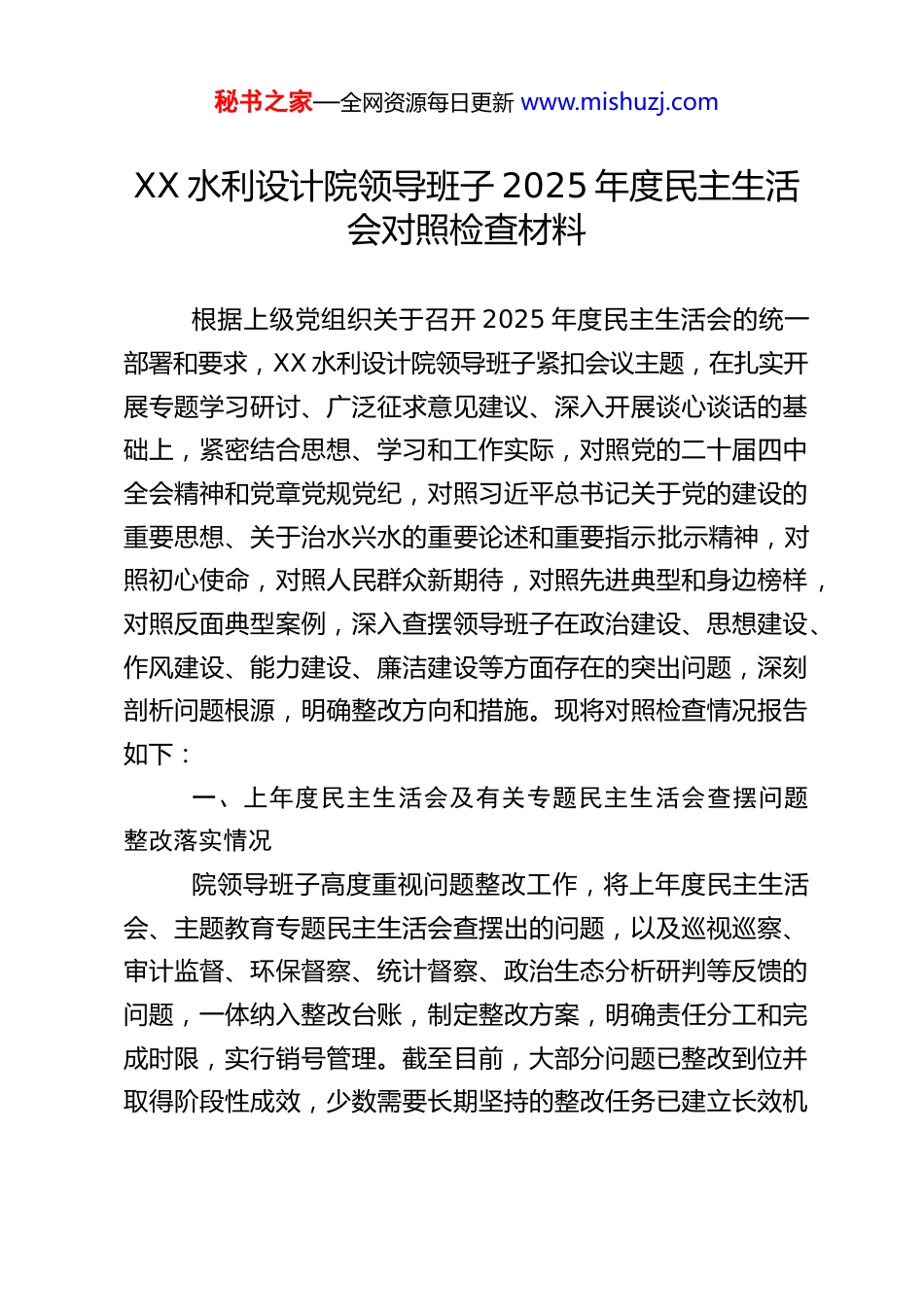 秘书之家—全网资源每日更新 www.mishuzj.comXX 水利设计院领导班子 2025 年度民主生活会对照检查材料根据上级党组织关于召开 2025 年度民主生活会的统一部署和要求,XX 水利设计院领导班子紧扣会议主题,在扎实开展专题学习研讨、广泛征求意见建议、深入开展谈心谈话的基础上,紧密结合思想、学习和工作实际,对照党的二十届四中全会精神和党章党规党纪,对照习近平总书记关于党的建设的重要思想、关于治水兴水的重要论述和重要指示批示精神,对照初心使命,对照人民群众新期待,对照先进典型和身边榜样,对照反面典型案例,深入查摆领导班子在政治建设、思想建设、作风建设、能力建设、廉洁建设等方面存在的突出问题,深刻剖析问题根源,明确整改方向和措施。现将对照检查情况报告如下:一、上年度民主生活会及有关专题民主生活会查摆问题整改落实情况院领导班子高度重视问题整改工作,将上年度民主生活会、主题教育专题民主生活会查摆出的问题,以及巡视巡察、审计监督、环保督察、统计督察、政治生态分析研判等反馈的问题,一体纳入整改台账,制定整改方案,明确责任分工和完成时限,实行销号管理。截至目前,大部分问题已整改到位并取得阶段性成效,少数需要长期坚持的整改任务已建立长效机秘书之家—全网资源每日更新 www.mishuzj.com制持续推进。(一)2024 年度民主生活会查摆问题整改情况针对上年度查摆出的“学习贯彻党的创新理论深度不够、学用结合不紧密”“担当作为、攻坚克难劲头有待加强”“联系服务基层和职工群众不够深入”“全面从严治党压力传导存在层层递减现象”等 4 个方面 12 项具体问题,班子制定了 28条整改措施。在强化理论武装方面:坚持把学习习近平新时代中国特色社会主义思想作为首要政治任务,完善并严格执行“第一议题”制度、理论学习中心组学习制度。全年组织中心组学习 XX次,专题研讨 XX 次,班子成员带头讲授党课 XX 次。重点加强了对习近平经济思想、生态文明思想以及关于科技、人才、水利工作重要论述的学习研讨,努力做到知其言更知其义、知其然更知其所以然。通过学习,班子对“两个确立”决定性意义的领悟更加深刻,“四个意识”更加牢固,“四个自信”更加坚定,“两个维护”更加自觉。但对照“学思用贯通、知信行统一”的高标准,在将党的创新理论转化为谋划水利设计事业高质量发展、破解技术与管理难题的具体思路和有效举措上,还需持续深化。在激励担当作为方面:修订完善了《院绩效考核与激励办法》《重大项目攻坚奖励办法》,树立了重实干、重实绩的用人导向。班子成员带头领题攻关,在 XX 重大水利工程前期秘书之家—全网资源每日更新 www.mishuzj.com设计、XX 流域防洪规划修编、智慧水利关键技术研发等急难险重任务中靠前指挥、亲力亲为。院内技术创新氛围有所增强,申报专利 XX 项,获得省部级以上设计奖项 XX 个。但在激发全院干部职工特别是青年技术骨干的创新创造活力方面,措施还不够系统;面对水利投融资体制改革、生态环保要求趋严等新形势,班子前瞻性研究和应对策略储备尚显不足。在密切联系群众方面:严格落实班子成员基层联系点制度,每位班子成员定点联系 1-2 个生产所(室)或分院,每年深入基层调研不少于 60 天。通过设立院长信箱、召开青年职工座谈会、离退休老同志通报会等形式,畅通民意渠道。着力解决了职工反映的食堂餐饮质量、办公环境改善、部分专业软件更新等一批具体问题。但在主动倾听一线设计人员对技术管理、质量管控、职业发展等方面的深层次诉求,并转化为制度性改进方面,还可以做得更细更实;深入工程现场、项目所在地听取业主、参建单位和当地群众意见的频次和深度有待加强。在压实管党治党责任方面:制定并落实《院党委落实全面从严治党主体责任清单》,定期专题研究全面从严治党工作。加强对各党支部落实“三会一课”、组织生活会等制度的监督检查。开展了廉政风险点排查防控,聚焦设计变更、项目分包、设备采购、选人用人等关键环节,完善内控制度 XX 项。严肃执纪问责,运用“第一种形态”批评教育帮助 XX 人次。但党风廉政教育的形式创新和针对性有...