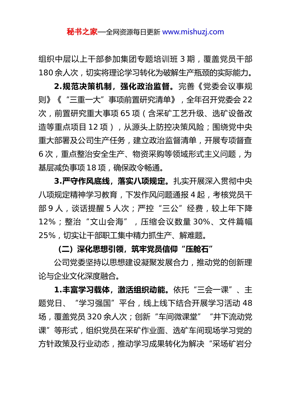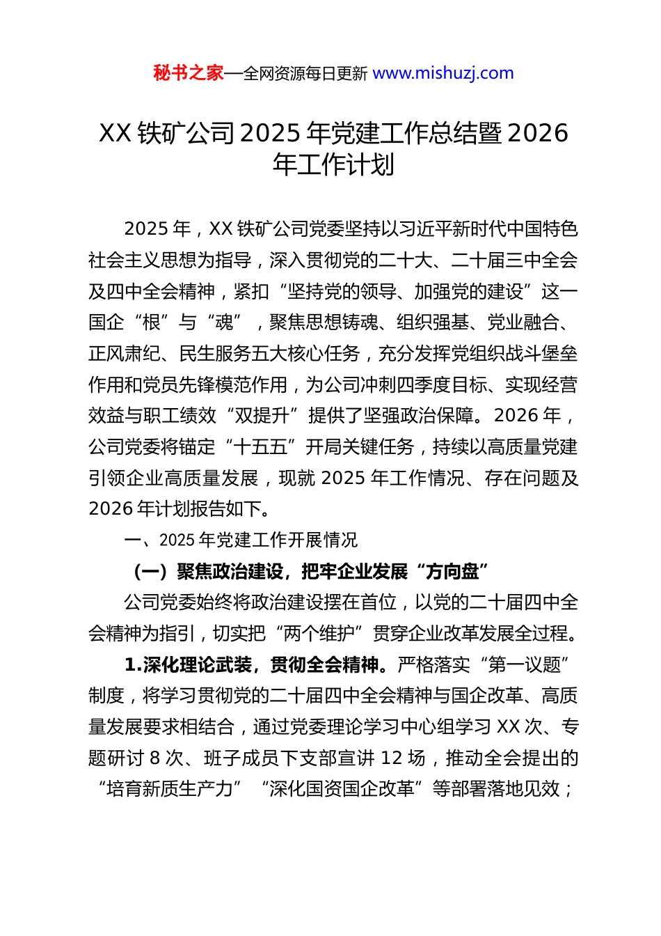秘书之家—全网资源每日更新 www.mishuzj.comXX 铁矿公司 2025 年党建工作总结暨 2026年工作计划2025 年,XX 铁矿公司党委坚持以习近平新时代中国特色社会主义思想为指导,深入贯彻党的二十大、二十届三中全会及四中全会精神,紧扣“坚持党的领导、加强党的建设”这一国企“根”与“魂”,聚焦思想铸魂、组织强基、党业融合、正风肃纪、民生服务五大核心任务,充分发挥党组织战斗堡垒作用和党员先锋模范作用,为公司冲刺四季度目标、实现经营效益与职工绩效“双提升”提供了坚强政治保障。2026 年,公司党委将锚定“十五五”开局关键任务,持续以高质量党建引领企业高质量发展,现就 2025 年工作情况、存在问题及2026 年计划报告如下。一、2025 年党建工作开展情况(一)聚焦政治建设,把牢企业发展“方向盘”公司党委始终将政治建设摆在首位,以党的二十届四中全会精神为指引,切实把“两个维护”贯穿企业改革发展全过程。1.深化理论武装,贯彻全会精神。严格落实“第一议题”制度,将学习贯彻党的二十届四中全会精神与国企改革、高质量发展要求相结合,通过党委理论学习中心组学习 XX 次、专题研讨 8 次、班子成员下支部宣讲 12 场,推动全会提出的“培育新质生产力”“深化国资国企改革”等部署落地见效;秘书之家—全网资源每日更新 www.mishuzj.com组织中层以上干部参加集团专题培训班 3 期,覆盖党员干部180 余人次,切实将理论学习转化为破解生产瓶颈的实际能力。2.规范决策机制,强化政治监督。完善《党委会议事规则》《“三重一大”事项前置研究清单》,全年召开党委会 22次,前置研究重大事项 65 项(含采矿工艺升级、选矿设备改造等重点项目 12 项),从源头上防控决策风险;围绕党中央重大部署及公司生产任务,建立政治监督清单,开展专项督查6 次,重点整治安全生产、物资采购等领域形式主义问题,为基层减负事项 18 项,确保政令畅通。3.严守作风底线,落实八项规定。扎实开展深入贯彻中央八项规定精神学习教育,下发作风问题通报 4 起,考核党员干部 9 人,谈话提醒 5 人次;严控“三公”经费,较上年下降12%;整治“文山会海”,压缩会议数量 30%、文件篇幅25%,切实让干部职工集中精力抓生产、解难题。(二)深化思想引领,筑牢党员信仰“压舱石”公司党委坚持以思想建设凝聚发展合力,推动党的创新理论与企业文化深度融合。1.丰富学习载体,激活组织动能。依托“三会一课”、主题党日、“学习强国”平台,线上线下结合开展学习活动 48场,覆盖党员 320 余人次;创新“车间微课堂”“井下流动党课”等形式,组织党员在采矿作业面、选矿车间现场学习党的方针政策及行业动态,推动学习成果转化为解决“采场矿岩分秘书之家—全网资源每日更新 www.mishuzj.com布优化”“球磨机台效提升”等实际问题的方案 15 个。2.强化意识形态,守好舆论阵地。严格落实意识形态工作责任制,召开专题研究会 4 次,排查意识形态风险点 8 个;加强宣传阵地建设,在公司官网、微信公众号刊发党建与生产融合稿件 130 篇,其中《党员突击队攻坚大倾角采场》等 12 篇稿件获集团及地方媒体转载;打造矿区文化墙 6 处、井下安全文化长廊 3 条,弘扬矿山精神、劳模精神,增强职工归属感。3.开展纪律教育,筑牢思想防线。结合全年党风廉政建设重点,组织党纪学习教育活动 10 场,邀请纪委专家作专题辅导 3 次;将《中国共产党纪律处分条例》纳入支部日常学习,通过典型案例剖析、廉洁警示教育片观看等形式,覆盖党员290 余人次,切实增强党员干部“知纪、明纪、守纪”意识。(三)夯实组织基础,建强基层战斗“桥头堡”公司党委以党支部标准化建设为核心,推动组织优势转化为发展优势。1.优化组织架构,选优配强队伍。完成 8 个基层党支部换届选举,通过“三定”选拔党支部书记(副书记)6 人,调整4 人,确定后备人选 12 人;推行“党支部书记专职化”,目前专职率达 90%;配齐专兼职组织员 10 人,开展党务工作培训4 期,覆盖 120 余人次,提升基层党务工作专业化水平。2.规范组织生活,提升支部效能。严格执行《...