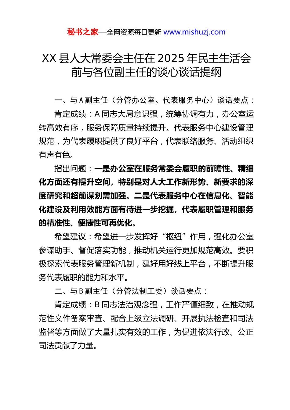 秘书之家—全网资源每日更新 www.mishuzj.comXX 县人大常委会主任在 2025 年民主生活会前与各位副主任的谈心谈话提纲一、与 A 副主任(分管办公室、代表服务中心)谈话要点:肯定成绩:A 同志大局意识强,统筹协调有力,办公室运转高效有序,服务保障质量持续提升。代表服务中心建设管理规范,为代表履职提供了良好平台,代表联络服务、活动组织有声有色。指出问题:一是办公室在服务常委会履职的前瞻性、精细化方面还有提升空间,特别是对人大工作新形势、新要求的深度研究和超前谋划需加强。二是代表服务中心在信息化、智能化建设及利用效能方面有待进一步挖掘,代表履职管理和服务的精准性、便捷性可再优化。希望建议:希望进一步发挥好“枢纽”作用,强化办公室参谋助手、督促落实功能,推动机关运行更加规范高效。要积极探索代表服务管理新机制,建好用好线上平台,不断提升服务代表履职的能力和水平。二、与 B 副主任(分管法制工委)谈话要点:肯定成绩:B 同志法治观念强,工作严谨细致,在推动规范性文件备案审查、配合上级立法调研、开展执法检查和司法监督等方面做了大量扎实有效的工作,为促进依法行政、公正司法贡献了力量。秘书之家—全网资源每日更新 www.mishuzj.com指出问题:一是对规范性文件的主动审查和审查深度有待加强,审查意见的刚性约束力有待进一步彰显。二是执法检查、司法监督的选题精准性、方式创新性和跟踪问效力度可以进一步强化。希望建议:希望继续深化法治实践,在提高备案审查质量增强监督实效上下功夫。要围绕全县中心工作和群众关切,精选监督议题,创新监督方式,推动相关法律法规在我县得到更有效实施。三、与 C 副主任(分管预算工委)谈话要点:肯定成绩:C 同志责任心强,业务熟悉,在深化预算审查监督、加强国有资产管理监督等方面扎实推进,预算联网监督系统得到有效运用,推动了财政资金使用绩效的提升和政府债务风险防控的加强。指出问题:一是全口径预算审查监督的深度和广度有待拓展,对重点支出、重大投资项目、转移支付等的审查监督可以更深入。二是审计查出问题整改的跟踪监督力度有待加强,整改问责的长效机制需进一步完善。希望建议:希望进一步聚焦财政资金和国有资产“家底”深化拓展预算审查监督重点,强化全过程监督。要加强对审计整改的跟踪问效,推动健全整改长效机制,切实管好人民的“钱袋子”。四、与 D 副主任(分管代表工委)谈话要点:秘书之家—全网资源每日更新 www.mishuzj.com肯定成绩:D 同志代表工作经验丰富,密切联系代表和群众,在代表履职服务保障、活动组织、建议督办等方面成效明显,代表主体作用得到较好发挥,建议办理质量和满意度稳步提升。指出问题:一是代表履职能力建设的方式方法有待创新,培训的针对性和实效性需增强。二是代表建议的提出质量和办理实效的均衡性有待提高,对建议办理全过程的跟踪协调可更紧密。希望建议:希望进一步创新代表工作思路,加强代表履职能力培训和履职管理,激发代表履职活力。要完善建议提出、交办、督办、反馈机制,在提高建议质量和办理质量上双向发力,推动解决实际问题。五、与 E 副主任(分管农业农村和环境资源保护工委)谈话要点:肯定成绩:E 同志作风务实,熟悉“三农”和环保工作,围绕乡村振兴战略实施、生态环境保护等开展了一系列卓有成效的调研和监督活动,有力推动了相关法律法规和政策在我县的落实。指出问题:一是监督工作的系统性、持续性有待加强,对一些重点难点问题的跟踪问效需要久久为功。二是调查研究的深度和成果转化运用有待提升,提出的意见建议针对性、操作性可进一步增强。秘书之家—全网资源每日更新 www.mishuzj.com希望建议:希望继续围绕乡村振兴和生态文明建设两大主题,选准小切口,做深大文章。要深入开展调查研究,提出高质量、可操作的审议意见和工作建议,并强化监督闭环管理,推动突出问题有效解决。六、与 F 副主任(分管科学教育文化体育工委)谈话要点:肯定成绩:F 同志工作有热情,思路开阔,在推动教科文卫领域法律法规实施、促进社会事业发展方面积极作为,相关领域执法检查、专题调...