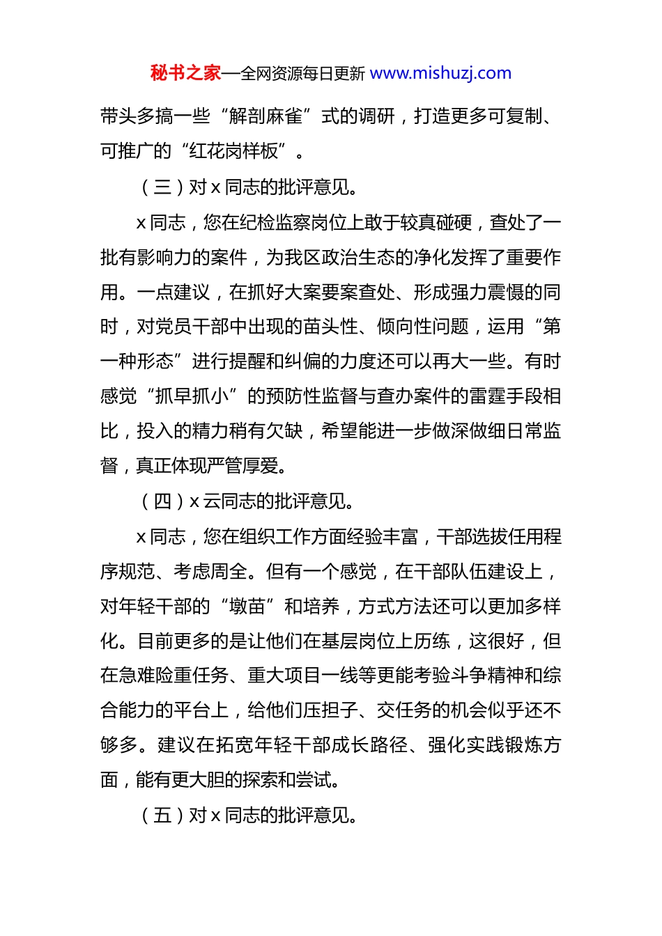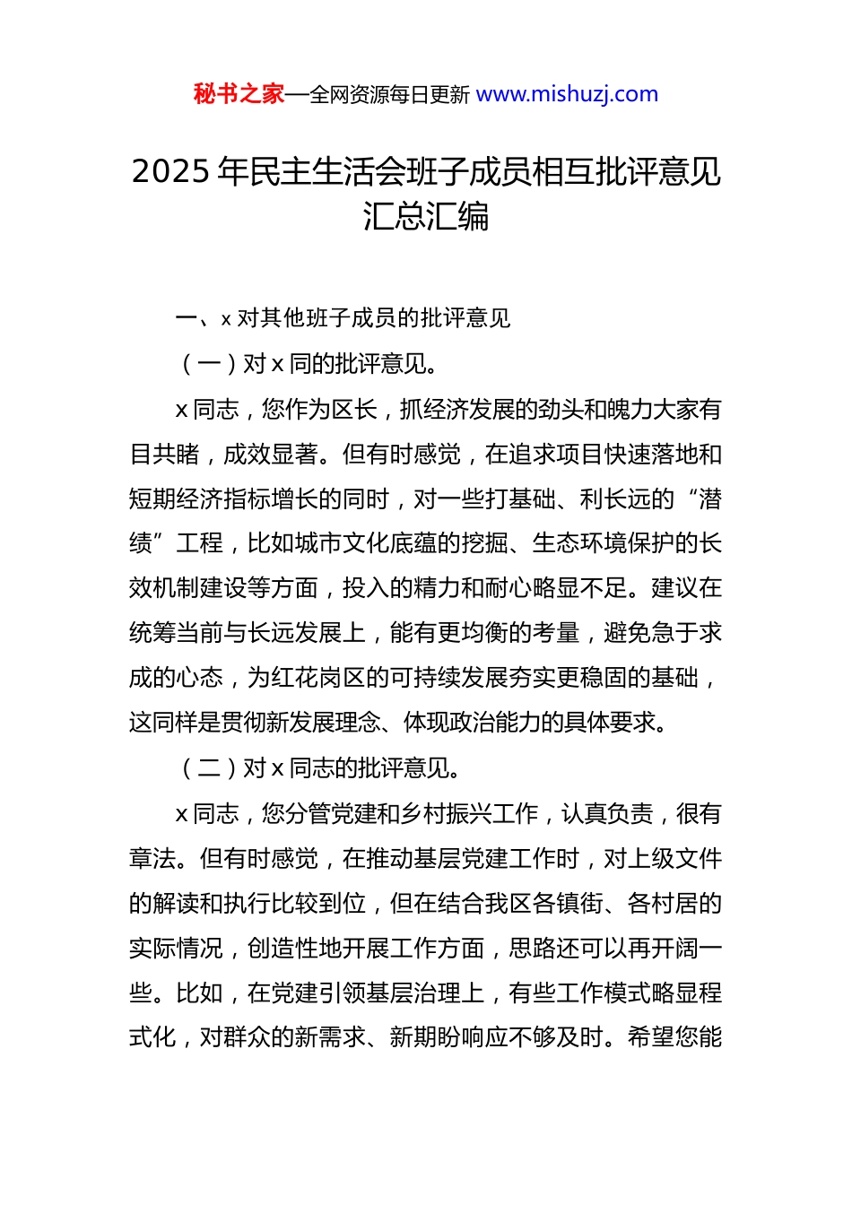 秘书之家—全网资源每日更新 www.mishuzj.com2025 年民主生活会班子成员相互批评意见汇总汇编一、x 对其他班子成员的批评意见(一)对 x 同的批评意见。x 同志,您作为区长,抓经济发展的劲头和魄力大家有目共睹,成效显著。但有时感觉,在追求项目快速落地和短期经济指标增长的同时,对一些打基础、利长远的“潜绩”工程,比如城市文化底蕴的挖掘、生态环境保护的长效机制建设等方面,投入的精力和耐心略显不足。建议在统筹当前与长远发展上,能有更均衡的考量,避免急于求成的心态,为红花岗区的可持续发展夯实更稳固的基础,这同样是贯彻新发展理念、体现政治能力的具体要求。(二)对 x 同志的批评意见。x 同志,您分管党建和乡村振兴工作,认真负责,很有章法。但有时感觉,在推动基层党建工作时,对上级文件的解读和执行比较到位,但在结合我区各镇街、各村居的实际情况,创造性地开展工作方面,思路还可以再开阔一些。比如,在党建引领基层治理上,有些工作模式略显程式化,对群众的新需求、新期盼响应不够及时。希望您能秘书之家—全网资源每日更新 www.mishuzj.com带头多搞一些“解剖麻雀”式的调研,打造更多可复制、可推广的“红花岗样板”。(三)对 x 同志的批评意见。x 同志,您在纪检监察岗位上敢于较真碰硬,查处了一批有影响力的案件,为我区政治生态的净化发挥了重要作用。一点建议,在抓好大案要案查处、形成强力震慑的同时,对党员干部中出现的苗头性、倾向性问题,运用“第一种形态”进行提醒和纠偏的力度还可以再大一些。有时感觉“抓早抓小”的预防性监督与查办案件的雷霆手段相比,投入的精力稍有欠缺,希望能进一步做深做细日常监督,真正体现严管厚爱。(四)x 云同志的批评意见。x 同志,您在组织工作方面经验丰富,干部选拔任用程序规范、考虑周全。但有一个感觉,在干部队伍建设上,对年轻干部的“墩苗”和培养,方式方法还可以更加多样化。目前更多的是让他们在基层岗位上历练,这很好,但在急难险重任务、重大项目一线等更能考验斗争精神和综合能力的平台上,给他们压担子、交任务的机会似乎还不够多。建议在拓宽年轻干部成长路径、强化实践锻炼方面,能有更大胆的探索和尝试。(五)对 x 同志的批评意见。秘书之家—全网资源每日更新 www.mishuzj.comx 同志,您在宣传思想战线上主动作为,围绕区委中心工作营造了良好的舆论氛围。但有时感觉,在舆情应对和引导方面,敏锐性还有待进一步提高。面对一些网络上的负面声音或不实信息,我们的反应速度和引导策略有时略显滞后,未能第一时间抢占话语权,容易陷入被动。希望您能牵头建立更加灵敏高效的舆情监测和响应机制,在提升政治判断力、政治领悟力、政治执行力上,尤其是在网络意识形态斗争中,展现更强的担当。(六)对 x 同志的批评意见。x 同志,您在维护全区社会稳定方面,做了大量艰苦细致的工作,成绩是主要的。但有时发现,您在处理一些历史遗留的信访积案时,存在一定的畏难情绪,攻坚克难的劲头有所减弱。对于一些“骨头案”“钉子案”,有时满足于向上级报告情况、寻求支持,但在主动下访、带案下访,创造性地寻找解决方案上,魄力还稍显不足。希望您能进一步发扬斗争精神,以“时时放心不下”的责任感,啃下更多硬骨头,切实维护好群众利益。(七)对 x 同志的批评意见。x 同志,您作为常务副区长,工作千头万绪,但总能处理得井井有条,展现了很强的综合协调能力。我感觉,您在推动分管领域的重点工作时,亲力亲为抓落实的多,但秘书之家—全网资源每日更新 www.mishuzj.com在调动部门积极性、压实责任链条方面,力度还可以加强。有时一些工作部署下去后,跟踪问效、一抓到底的韧劲有所欠缺,导致个别工作出现了“上热下冷”的现象。建议在强化督查督办、形成工作闭环方面,投入更多精力,确保区委区政府的决策部署不折不扣落到实处。(八)对 x 同志的批评意见。x 同志,您在团结各方力量、凝聚发展共识方面,做了很多有益的工作。但有时感觉,您对新经济组织、新社会组织等统战工作新领域的关注和研究还不够深入。工作思路和方法上,沿用传统模式较多...