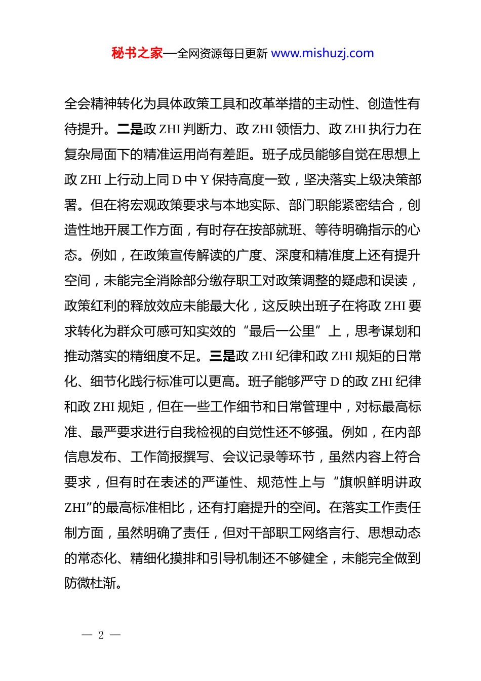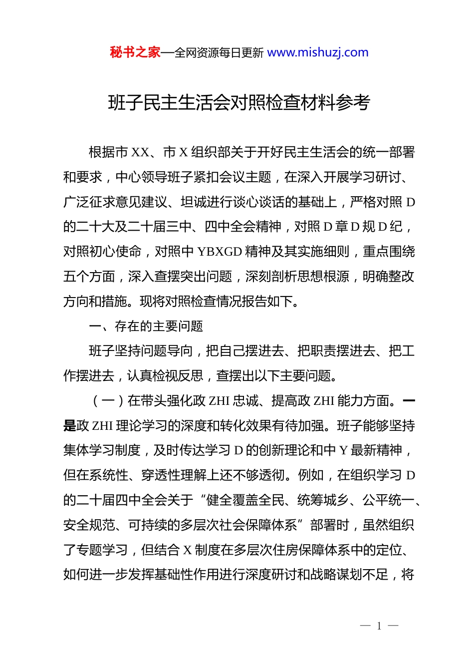秘书之家—全网资源每日更新 www.mishuzj.com班子民主生活会对照检查材料参考根据市 XX、市 X 组织部关于开好民主生活会的统一部署和要求,中心领导班子紧扣会议主题,在深入开展学习研讨、广泛征求意见建议、坦诚进行谈心谈话的基础上,严格对照 D的二十大及二十届三中、四中全会精神,对照 D 章 D 规 D 纪,对照初心使命,对照中 YBXGD 精神及其实施细则,重点围绕五个方面,深入查摆突出问题,深刻剖析思想根源,明确整改方向和措施。现将对照检查情况报告如下。一、存在的主要问题班子坚持问题导向,把自己摆进去、把职责摆进去、把工作摆进去,认真检视反思,查摆出以下主要问题。(一)在带头强化政 ZHI 忠诚、提高政 ZHI 能力方面。一是政 ZHI 理论学习的深度和转化效果有待加强。班子能够坚持集体学习制度,及时传达学习 D 的创新理论和中 Y 最新精神,但在系统性、穿透性理解上还不够透彻。例如,在组织学习 D的二十届四中全会关于“健全覆盖全民、统筹城乡、公平统一、安全规范、可持续的多层次社会保障体系”部署时,虽然组织了专题学习,但结合 X 制度在多层次住房保障体系中的定位、如何进一步发挥基础性作用进行深度研讨和战略谋划不足,将— 1 —秘书之家—全网资源每日更新 www.mishuzj.com全会精神转化为具体政策工具和改革举措的主动性、创造性有待提升。二是政 ZHI 判断力、政 ZHI 领悟力、政 ZHI 执行力在复杂局面下的精准运用尚有差距。班子成员能够自觉在思想上政 ZHI 上行动上同 D 中 Y 保持高度一致,坚决落实上级决策部署。但在将宏观政策要求与本地实际、部门职能紧密结合,创造性地开展工作方面,有时存在按部就班、等待明确指示的心态。例如,在政策宣传解读的广度、深度和精准度上还有提升空间,未能完全消除部分缴存职工对政策调整的疑虑和误读,政策红利的释放效应未能最大化,这反映出班子在将政 ZHI 要求转化为群众可感可知实效的“最后一公里”上,思考谋划和推动落实的精细度不足。三是政 ZHI 纪律和政 ZHI 规矩的日常化、细节化践行标准可以更高。班子能够严守 D 的政 ZHI 纪律和政 ZHI 规矩,但在一些工作细节和日常管理中,对标最高标准、最严要求进行自我检视的自觉性还不够强。例如,在内部信息发布、工作简报撰写、会议记录等环节,虽然内容上符合要求,但有时在表述的严谨性、规范性上与“旗帜鲜明讲政ZHI”的最高标准相比,还有打磨提升的空间。在落实工作责任制方面,虽然明确了责任,但对干部职工网络言行、思想动态的常态化、精细化摸排和引导机制还不够健全,未能完全做到防微杜渐。— 2 —秘书之家—全网资源每日更新 www.mishuzj.com(二)在带头固本培元、增强 D 性方面。一是运用 D 的创新理论改造主观世界的自觉性、主动性有待增强。班子能够坚持学习新时代中国特色社会主义思想,但有时满足于完成“规定动作”,将其作为改造世界观、人生观、价值观的强大思想武器的意识不够强烈。例如,在理论学习中心组学习中,安排学习原著原文、传达上级精神较多,但紧密结合班子成员思想实际,开展触及灵魂的 D 性分析、运用理论武器解决思想困惑的深度交流相对较少。面对 X 事业改革发展中遇到的新矛盾新问题,有时习惯于从业务层面找对策,自觉运用贯穿 D 的创新理论中的立场观点方法去分析本质、探寻规律做得还不够到位。二是 D 性修养的常态化锤炼机制不够完善。班子成员能够参加组织生活,遵守 D 章 D 规,但在严肃 D 内政 ZHI 生活、用好批评和自我批评武器方面,有时存在“和风细雨”多、“红脸出汗”少的情况。例如,在之前的组织生活会上,相互批评多是提工作建议,从 D 性原则、作风表现等方面进行深刻剖析和尖锐批评的力度不足。班子成员以普通 D 员身份深入所在 D 支部,与基层 D 员开展经常性、深入性的思想交流,听取他们对班子及个人在 D 性修养方面的意见建议,主动性和频次还可以进一步提高。三是理想信念教育融入日常管理、浸润干部职工的方式方法有待创新。班子重视干部职工的思想教育,但教育形式— 3 —秘书之家—全网...