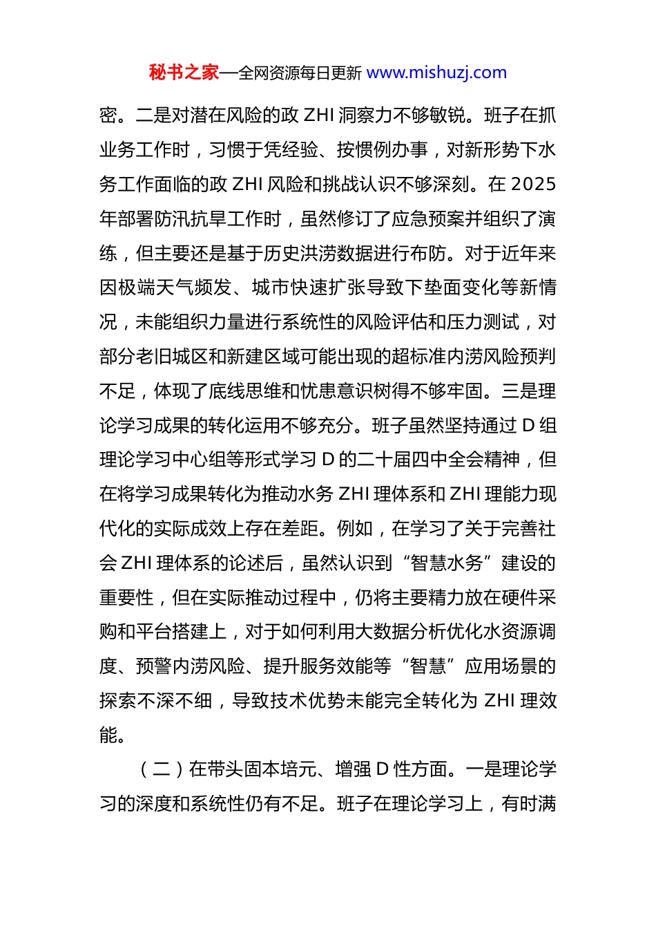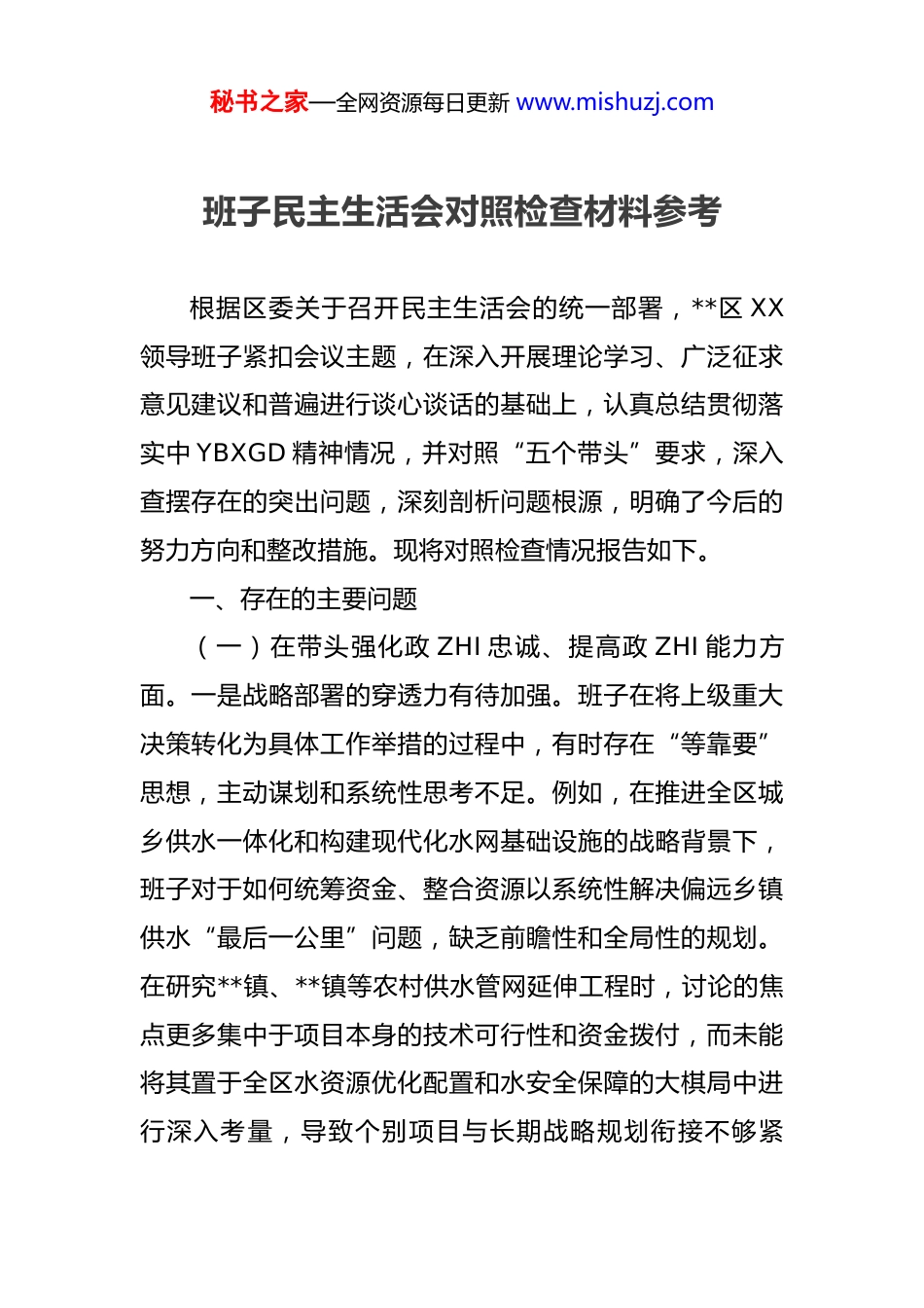 秘书之家—全网资源每日更新 www.mishuzj.com班子民主生活会对照检查材料参考根据区委关于召开民主生活会的统一部署,**区 XX领导班子紧扣会议主题,在深入开展理论学习、广泛征求意见建议和普遍进行谈心谈话的基础上,认真总结贯彻落实中 YBXGD 精神情况,并对照“五个带头”要求,深入查摆存在的突出问题,深刻剖析问题根源,明确了今后的努力方向和整改措施。现将对照检查情况报告如下。一、存在的主要问题(一)在带头强化政 ZHI 忠诚、提高政 ZHI 能力方面。一是战略部署的穿透力有待加强。班子在将上级重大决策转化为具体工作举措的过程中,有时存在“等靠要”思想,主动谋划和系统性思考不足。例如,在推进全区城乡供水一体化和构建现代化水网基础设施的战略背景下,班子对于如何统筹资金、整合资源以系统性解决偏远乡镇供水“最后一公里”问题,缺乏前瞻性和全局性的规划。在研究**镇、**镇等农村供水管网延伸工程时,讨论的焦点更多集中于项目本身的技术可行性和资金拨付,而未能将其置于全区水资源优化配置和水安全保障的大棋局中进行深入考量,导致个别项目与长期战略规划衔接不够紧秘书之家—全网资源每日更新 www.mishuzj.com密。二是对潜在风险的政 ZHI 洞察力不够敏锐。班子在抓业务工作时,习惯于凭经验、按惯例办事,对新形势下水务工作面临的政 ZHI 风险和挑战认识不够深刻。在 2025年部署防汛抗旱工作时,虽然修订了应急预案并组织了演练,但主要还是基于历史洪涝数据进行布防。对于近年来因极端天气频发、城市快速扩张导致下垫面变化等新情况,未能组织力量进行系统性的风险评估和压力测试,对部分老旧城区和新建区域可能出现的超标准内涝风险预判不足,体现了底线思维和忧患意识树得不够牢固。三是理论学习成果的转化运用不够充分。班子虽然坚持通过 D 组理论学习中心组等形式学习 D 的二十届四中全会精神,但在将学习成果转化为推动水务 ZHI 理体系和 ZHI 理能力现代化的实际成效上存在差距。例如,在学习了关于完善社会 ZHI 理体系的论述后,虽然认识到“智慧水务”建设的重要性,但在实际推动过程中,仍将主要精力放在硬件采购和平台搭建上,对于如何利用大数据分析优化水资源调度、预警内涝风险、提升服务效能等“智慧”应用场景的探索不深不细,导致技术优势未能完全转化为 ZHI 理效能。(二)在带头固本培元、增强 D 性方面。一是理论学习的深度和系统性仍有不足。班子在理论学习上,有时满秘书之家—全网资源每日更新 www.mishuzj.com足于完成“规定动作”,读原著、学原文的多,但联系水务工作实际进行深入研讨、辨析症结的少。在 D 组理论学习中心组学习研讨过程中,有时存在以工作交流代替 D 性分析的现象,围绕如何运用关于 ZHI 水的重要论述破解当前水资源管理难题的讨论不够深入,未能真正做到学思用贯通、知信行统一,导致在面对复杂问题时,理论指导实践的功力尚有欠缺。二是攻坚克难的 D 性锤炼尚有差距。面对水务改革发展中的一些“硬骨头”,班子有时存在畏难情绪和求稳心态。三是理想信念的现实检验不够严格。在日常工作中,对共产 D 人精神追求的坚守未能时时处处体现。比如,在干部选拔任用和日常管理中,班子更注重考察干部的业务能力和工作实绩,但在政 ZHI 素质、廉洁自律和为民情怀等方面的常态化、近距离考察机制尚不完善。有时对一些干部出现的苗头性、倾向性问题,满足于常规的谈话提醒,未能从锤炼 D 性的高度进行严肃的批评教育,导致严管厚爱的氛围不够浓厚。(三)在带头敬畏人民、敬畏组织、敬畏法纪方面。一是服务群众的“最后一公里”仍有堵点。班子在践行新时代 D 的群众路线上,还存在服务意识和工作效率的问题。虽然建立了畅通的信访投诉渠道,但对一些群众反映的非紧急、非重点的“急难愁盼”问题,处理流程偏长、秘书之家—全网资源每日更新 www.mishuzj.com反馈不够及时。二是民主集中制的执行质量有待提高。班子议事决策程序规范,能够严格执行“三重一大”集体决策制度,但在决策过程中,有时存在会前酝酿不够充分、会上讨论不够深入的问题。三是依法行政的刚性约...
