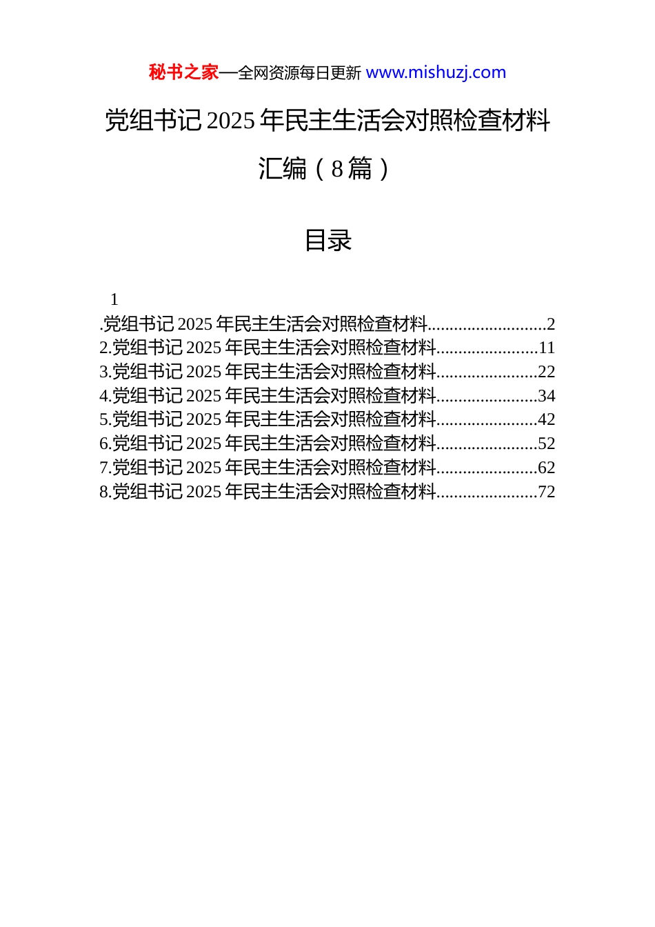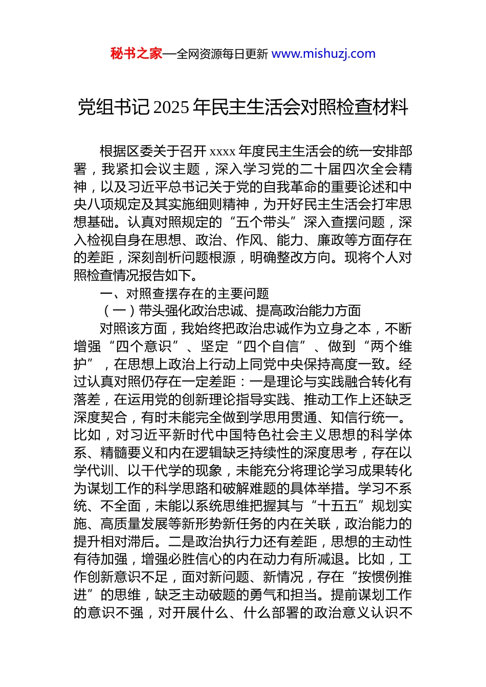 秘书之家—全网资源每日更新 www.mishuzj.com党组书记 2025 年民主生活会对照检查材料汇编(8 篇)目录1.党组书记 2025 年民主生活会对照检查材料...........................22.党组书记 2025 年民主生活会对照检查材料.......................113.党组书记 2025 年民主生活会对照检查材料.......................224.党组书记 2025 年民主生活会对照检查材料.......................345.党组书记 2025 年民主生活会对照检查材料.......................426.党组书记 2025 年民主生活会对照检查材料.......................527.党组书记 2025 年民主生活会对照检查材料.......................628.党组书记 2025 年民主生活会对照检查材料.......................72秘书之家—全网资源每日更新 www.mishuzj.com党组书记 2025 年民主生活会对照检查材料根据区委关于召开 xxxx 年度民主生活会的统一安排部署,我紧扣会议主题,深入学习党的二十届四次全会精神,以及习近平总书记关于党的自我革命的重要论述和中央八项规定及其实施细则精神,为开好民主生活会打牢思想基础。认真对照规定的“五个带头”深入查摆问题,深入检视自身在思想、政治、作风、能力、廉政等方面存在的差距,深刻剖析问题根源,明确整改方向。现将个人对照检查情况报告如下。一、对照查摆存在的主要问题(一)带头强化政治忠诚、提高政治能力方面对照该方面,我始终把政治忠诚作为立身之本,不断增强“四个意识”、坚定“四个自信”、做到“两个维护”,在思想上政治上行动上同党中央保持高度一致。经过认真对照仍存在一定差距:一是理论与实践融合转化有落差,在运用党的创新理论指导实践、推动工作上还缺乏深度契合,有时未能完全做到学思用贯通、知信行统一。比如,对习近平新时代中国特色社会主义思想的科学体系、精髓要义和内在逻辑缺乏持续性的深度思考,存在以学代训、以干代学的现象,未能充分将理论学习成果转化为谋划工作的科学思路和破解难题的具体举措。学习不系统、不全面,未能以系统思维把握其与“十五五”规划实施、高质量发展等新形势新任务的内在关联,政治能力的提升相对滞后。二是政治执行力还有差距,思想的主动性有待加强,增强必胜信心的内在动力有所减退。比如,工作创新意识不足,面对新问题、新情况,存在“按惯例推进”的思维,缺乏主动破题的勇气和担当。提前谋划工作的意识不强,对开展什么、什么部署的政治意义认识不秘书之家—全网资源每日更新 www.mishuzj.com足,对重点任务的前瞻性和战略性思考不够深入,有时工作任务繁重,存在见子打子的现象,导致部分工作被动应付。三是政治定力还需加强,在复杂局面下保持战略定力的韧性还需锤炼。面对党建、信访维稳、深化改革、经济指标完成等多重压力叠加时,有时会产生急于求成的焦躁情绪,在统筹力量、久久为功的落实上,未能始终如一地保持沉着冷静,对工作的长期性、艰巨性认识需要进一步深化。(二)带头固本培元、增强党性方面在党性锤炼上能坚持参加组织生活,把锤炼党性、提高思想觉悟作为终身课题,把党性修养融入日常、抓在经常,自觉接受党内政治生活洗礼。经过深入反思,该方面仍存在一些问题:一是政治修养引领党性修养的成效不够明显,在政治立场、政治方向、政治原则上的深层次把握还不够精准,自我革命要求落实不够到位。比如,在党性修养锤炼中,未能始终把政治修养摆在首位,没有充分意识到政治修养是党性修养的核心和灵魂,导致党性锤炼缺乏鲜明的政治导向。在深入贯彻中央八项规定精神学习教育期间,落实一体推进“学查改”上仍存在“学归学、做归做”现象,未能真正将纪律要求内化为思想自觉和行动自觉。尤其是查的方面,在自查自纠中存在避重就轻、浮于表面的情况,对深层次问题挖掘不够,整改落实缺乏一抓到底的韧劲。二是敢于攻坚克难的斗争精神有所弱化,运用党的创新理论指导实践、破解难题的穿透力尚有不足。比如,学习 xxxx 年中央经济工作会议提出的“五个必须”要求时,仅停留在文字记忆层面,没有结合什么工作深入分析实践路径,缺乏一定的政治高度和战略考量。对习近...