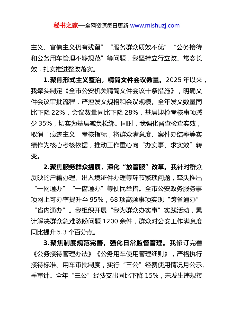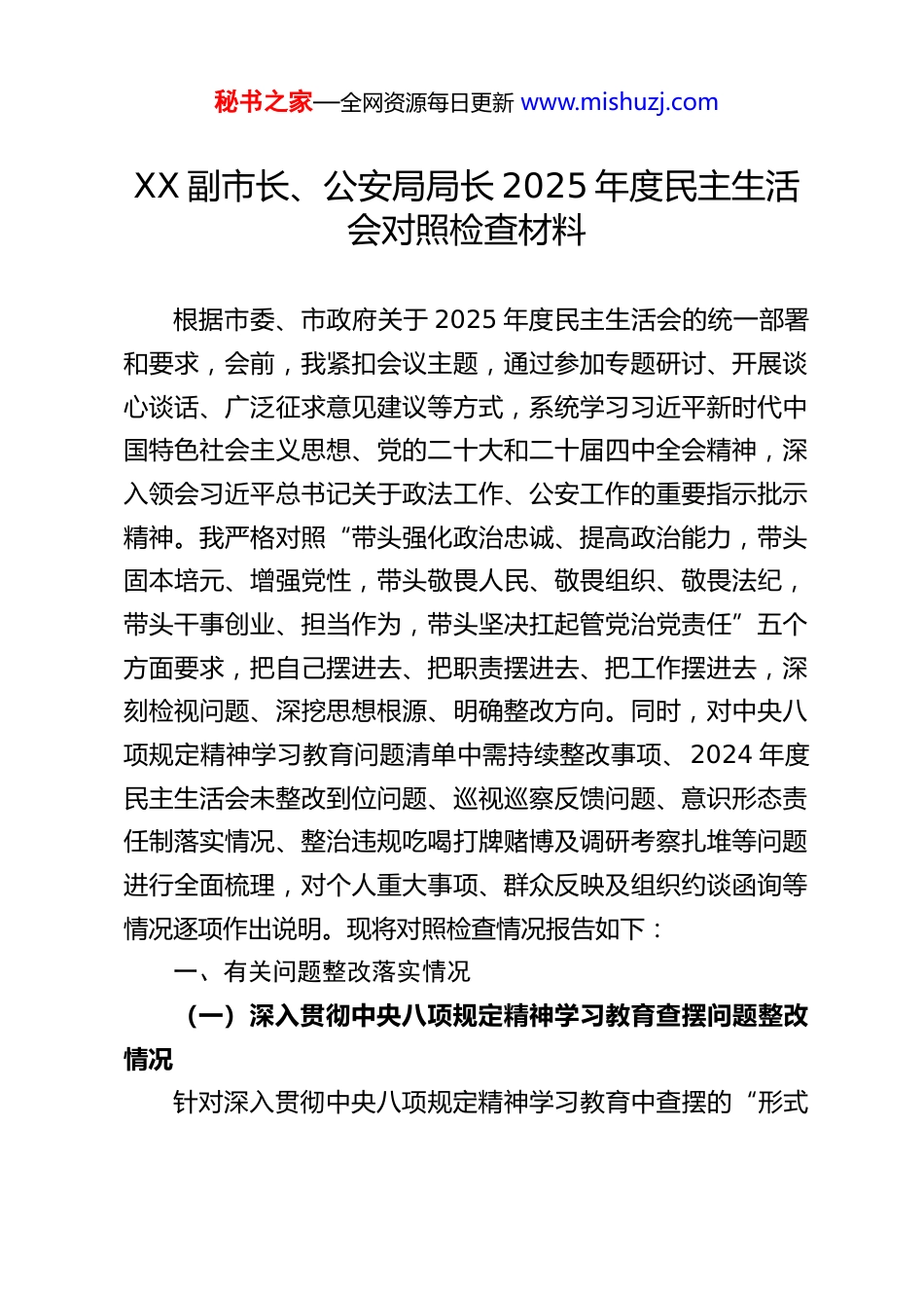 秘书之家—全网资源每日更新 www.mishuzj.comXX 副市长、公安局局长 2025 年度民主生活会对照检查材料根据市委、市政府关于 2025 年度民主生活会的统一部署和要求,会前,我紧扣会议主题,通过参加专题研讨、开展谈心谈话、广泛征求意见建议等方式,系统学习习近平新时代中国特色社会主义思想、党的二十大和二十届四中全会精神,深入领会习近平总书记关于政法工作、公安工作的重要指示批示精神。我严格对照“带头强化政治忠诚、提高政治能力,带头固本培元、增强党性,带头敬畏人民、敬畏组织、敬畏法纪,带头干事创业、担当作为,带头坚决扛起管党治党责任”五个方面要求,把自己摆进去、把职责摆进去、把工作摆进去,深刻检视问题、深挖思想根源、明确整改方向。同时,对中央八项规定精神学习教育问题清单中需持续整改事项、2024 年度民主生活会未整改到位问题、巡视巡察反馈问题、意识形态责任制落实情况、整治违规吃喝打牌赌博及调研考察扎堆等问题进行全面梳理,对个人重大事项、群众反映及组织约谈函询等情况逐项作出说明。现将对照检查情况报告如下:一、有关问题整改落实情况(一)深入贯彻中央八项规定精神学习教育查摆问题整改情况针对深入贯彻中央八项规定精神学习教育中查摆的“形式秘书之家—全网资源每日更新 www.mishuzj.com主义、官僚主义仍有残留”“服务群众质效不优”“公务接待和公务用车管理不够规范”等问题,我坚持立行立改、常态长效,扎实推进整改落实。1.聚焦形式主义整治,精简文件会议数量。2025 年以来,我牵头制定《全市公安机关精简文件会议十条措施》,明确文件会议审批流程,严控发文规格和会议规模。全年发文数量同比下降 22%,会议数量同比下降 28%,基层迎检考核事项减少 35%,切实为基层减负松绑。同时,我强化督查检查实效,取消“痕迹主义”考核指标,将群众满意度、案件办结率等实绩作为核心考核依据,推动工作重心向“办实事、求实效”转变。2.聚焦服务群众提质,深化“放管服”改革。我针对群众反映的户籍办理、出入境证件办理等环节繁琐问题,牵头推出“一网通办”“一窗通办”等便民举措。全市公安政务服务事项网上可办率提升至 95%,68 项高频事项实现“跨省通办”“省内通办”。我组织开展“我为群众办实事”实践活动,累计解决群众急难愁盼问题 1200 余件,群众对公安工作满意度同比提升 5.3 个百分点。3.聚焦制度规范完善,强化日常监督管理。我修订完善《公务接待管理办法》《公务用车使用管理细则》,严格执行接待标准、用车审批制度,实行“三公”经费使用情况月公示、季审计。全年“三公”经费支出同比下降 15%,未发生违规接秘书之家—全网资源每日更新 www.mishuzj.com待、公车私用等问题。同时,我常态化开展明察暗访,对发现的苗头性、倾向性问题及时约谈提醒,累计开展专项检查 6 次,整改问题隐患 32 个。(二)2024 年度民主生活会查摆问题整改情况2024 年度民主生活会中,我查摆的“政治理论学习深度不足”“打击新型犯罪能力有待提升”“队伍纪律作风建设存在薄弱环节”等问题,目前已完成阶段性整改任务,部分问题需持续深化整改。1.针对“政治理论学习深度不足”问题,我建立“第一议题”学习制度,坚持每周党委理论学习中心组学习、每月专题研讨,带头领学习近平总书记重要讲话和重要指示批示精神。全年累计开展集中学习 48 次、专题研讨 12 次,撰写心得体会20 篇。同时,我推动理论学习与公安实践相结合,组织开展“政治练兵+业务练兵”融合培训,累计培训民警辅警 3000余人次,切实把学习成果转化为维护稳定、服务发展的实际行动。2.针对“打击新型犯罪能力有待提升”问题,我牵头组建市公安局新型犯罪侦查支队,整合刑侦、网安、经侦等警力资源,建立“情报导侦、精准打击”工作机制。聚焦电信网络诈骗、跨境赌博等新型犯罪,开展专项打击行动 10 次,打掉犯罪团伙 85 个,抓获犯罪嫌疑人 1200 余名,挽回群众经济损失2.3 亿元。同时,我推动建立反诈预警劝阻中心,累计发送预秘书之家—全网资源每日更新 www.mishuzj.com警信息 50 万条,劝阻潜在受害人 3 万余...