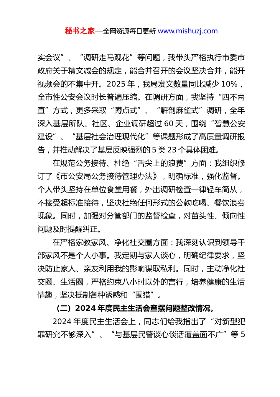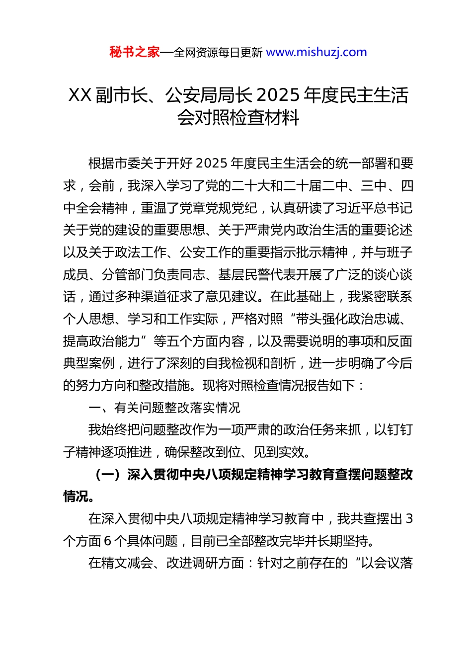 秘书之家—全网资源每日更新 www.mishuzj.comXX 副市长、公安局局长 2025 年度民主生活会对照检查材料根据市委关于开好 2025 年度民主生活会的统一部署和要求,会前,我深入学习了党的二十大和二十届二中、三中、四中全会精神,重温了党章党规党纪,认真研读了习近平总书记关于党的建设的重要思想、关于严肃党内政治生活的重要论述以及关于政法工作、公安工作的重要指示批示精神,并与班子成员、分管部门负责同志、基层民警代表开展了广泛的谈心谈话,通过多种渠道征求了意见建议。在此基础上,我紧密联系个人思想、学习和工作实际,严格对照“带头强化政治忠诚、提高政治能力”等五个方面内容,以及需要说明的事项和反面典型案例,进行了深刻的自我检视和剖析,进一步明确了今后的努力方向和整改措施。现将对照检查情况报告如下:一、有关问题整改落实情况我始终把问题整改作为一项严肃的政治任务来抓,以钉钉子精神逐项推进,确保整改到位、见到实效。(一)深入贯彻中央八项规定精神学习教育查摆问题整改情况。在深入贯彻中央八项规定精神学习教育中,我共查摆出 3个方面 6 个具体问题,目前已全部整改完毕并长期坚持。在精文减会、改进调研方面:针对之前存在的“以会议落秘书之家—全网资源每日更新 www.mishuzj.com实会议”、“调研走马观花”等问题,我带头严格执行市委市政府关于精文减会的规定,能合并召开的会议坚决合并,能开视频会的不集中开。2025 年,我局发文数量同比减少 10%,全市性公安会议时长普遍压缩。在调研方面,我坚持“四不两直”方式,更多采取“蹲点式”、“解剖麻雀式”调研,全年深入基层所队、社区、企业调研超过 60 天,围绕“智慧公安建设”、“基层社会治理现代化”等课题形成了高质量调研报告,并推动解决了基层反映强烈的 5 类 23 个具体困难。在规范公务接待、杜绝“舌尖上的浪费”方面:我组织修订了《市公安局公务接待管理办法》,明确标准,强化监督。个人带头坚持在单位食堂用餐,外出调研检查一律轻车简从,不接受超标准接待,坚决杜绝任何形式的公款吃喝、餐饮浪费现象。同时,加强对分管部门的监督检查,对苗头性、倾向性问题及时提醒纠正。在严格家教家风、净化社交圈方面:我深刻认识到领导干部家风不是个人小事。我定期与家人谈心,明确纪律要求,坚决防止家人、亲友利用我的影响谋取私利。同时,主动净化社交圈、生活圈,严格约束八小时以外的言行,培养健康的生活情趣,坚决抵制各种诱惑和“围猎”。(二)2024 年度民主生活会查摆问题整改情况。2024 年度民主生活会上,同志们给我指出了“对新型犯罪研究不够深入”、“与基层民警谈心谈话覆盖面不广”等 5秘书之家—全网资源每日更新 www.mishuzj.com个问题。我制定了详细的整改方案,现已全部销号。针对“打击新型犯罪能力有待提升”问题:我牵头成立了“涉网犯罪研究中心”,组织骨干力量加强对电信网络诈骗、跨境赌博、网络黑灰产等新型犯罪的研究和攻坚。2025 年,全市电信网络诈骗案件破案数、抓获犯罪嫌疑人数同比分别上升 25%和 30%,止付冻结涉案资金创历史新高,打击治理成效显著。针对“关心关爱基层民警力度需加大”问题:我建立了“局长直通车”机制,每季度至少与 10 名不同岗位、不同层级的基层民警进行一对一谈心。同时,大力推动“暖心惠警”工程落实,解决了基层所队营房老旧、执勤装备更新、民警子女入学入托等一批实际困难,民警的职业认同感和归属感得到提升。针对“运用法治思维和法治方式深化改革的能力有待加强”问题:我系统学习了习近平法治思想,组织全局开展“执法规范化建设提升年”活动,牵头制定了《XX 市公安机关执法权力运行监督制约规定》,全面推行执法全流程记录、案件法制部门统一审核把关等机制,全局执法质量和公信力稳步提升。(其他问题整改情况略,均需具体展开)二、存在的主要问题我坚持把自己摆进去、把职责摆进去、把工作摆进去,对照五个“带头”要求,深入查摆,发现以下主要问题。秘书之家—全网资源每日更新 www.mishuzj.com(一)带头强化政治忠诚、提高政治能力方面。一是政治“三力”锤炼仍...