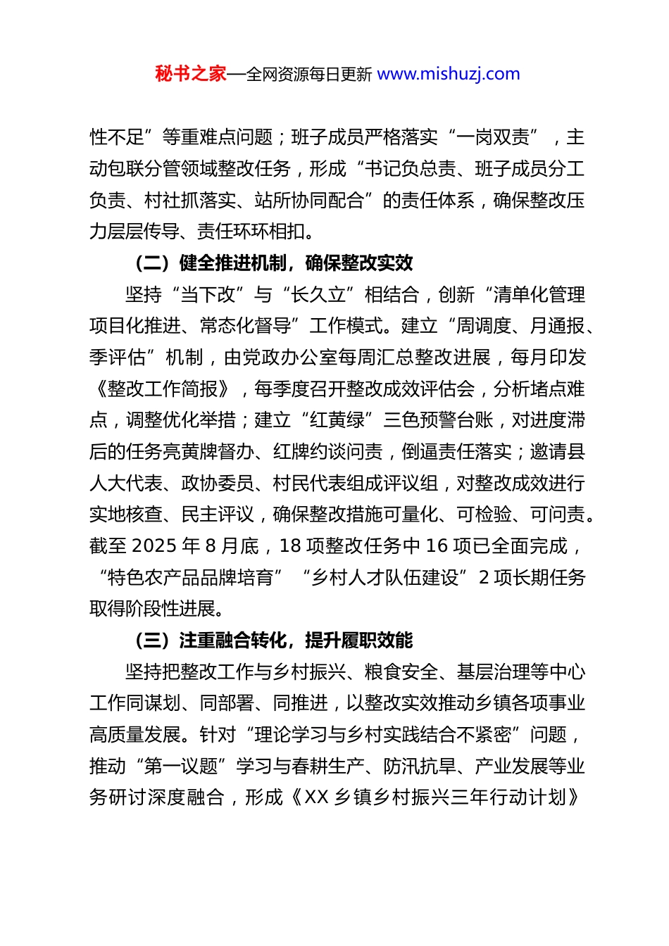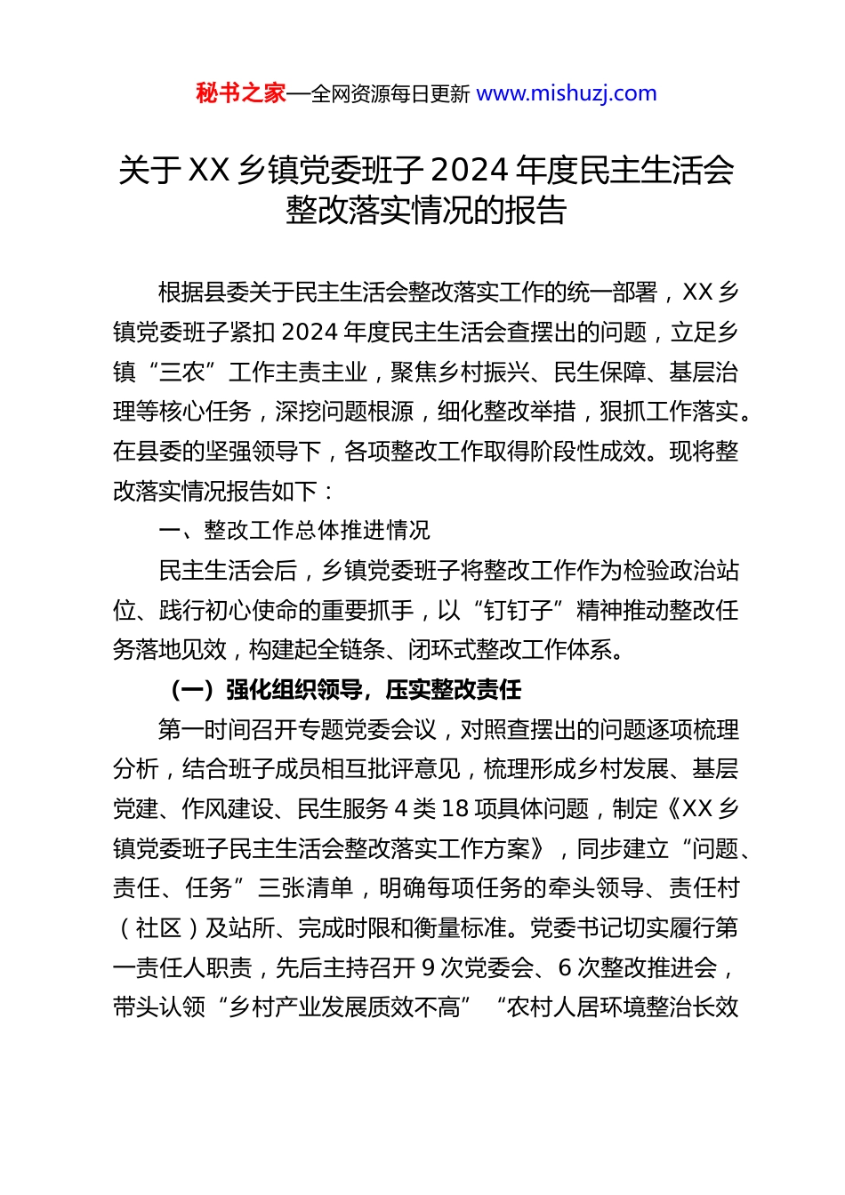 秘书之家—全网资源每日更新 www.mishuzj.com关于 XX 乡镇党委班子 2024 年度民主生活会整改落实情况的报告根据县委关于民主生活会整改落实工作的统一部署,XX 乡镇党委班子紧扣 2024 年度民主生活会查摆出的问题,立足乡镇“三农”工作主责主业,聚焦乡村振兴、民生保障、基层治理等核心任务,深挖问题根源,细化整改举措,狠抓工作落实。在县委的坚强领导下,各项整改工作取得阶段性成效。现将整改落实情况报告如下:一、整改工作总体推进情况民主生活会后,乡镇党委班子将整改工作作为检验政治站位、践行初心使命的重要抓手,以“钉钉子”精神推动整改任务落地见效,构建起全链条、闭环式整改工作体系。(一)强化组织领导,压实整改责任第一时间召开专题党委会议,对照查摆出的问题逐项梳理分析,结合班子成员相互批评意见,梳理形成乡村发展、基层党建、作风建设、民生服务 4 类 18 项具体问题,制定《XX 乡镇党委班子民主生活会整改落实工作方案》,同步建立“问题、责任、任务”三张清单,明确每项任务的牵头领导、责任村(社区)及站所、完成时限和衡量标准。党委书记切实履行第一责任人职责,先后主持召开 9 次党委会、6 次整改推进会,带头认领“乡村产业发展质效不高”“农村人居环境整治长效秘书之家—全网资源每日更新 www.mishuzj.com性不足”等重难点问题;班子成员严格落实“一岗双责”,主动包联分管领域整改任务,形成“书记负总责、班子成员分工负责、村社抓落实、站所协同配合”的责任体系,确保整改压力层层传导、责任环环相扣。(二)健全推进机制,确保整改实效坚持“当下改”与“长久立”相结合,创新“清单化管理项目化推进、常态化督导”工作模式。建立“周调度、月通报、季评估”机制,由党政办公室每周汇总整改进展,每月印发《整改工作简报》,每季度召开整改成效评估会,分析堵点难点,调整优化举措;建立“红黄绿”三色预警台账,对进度滞后的任务亮黄牌督办、红牌约谈问责,倒逼责任落实;邀请县人大代表、政协委员、村民代表组成评议组,对整改成效进行实地核查、民主评议,确保整改措施可量化、可检验、可问责。截至 2025 年 8 月底,18 项整改任务中 16 项已全面完成,“特色农产品品牌培育”“乡村人才队伍建设”2 项长期任务取得阶段性进展。(三)注重融合转化,提升履职效能坚持把整改工作与乡村振兴、粮食安全、基层治理等中心工作同谋划、同部署、同推进,以整改实效推动乡镇各项事业高质量发展。针对“理论学习与乡村实践结合不紧密”问题,推动“第一议题”学习与春耕生产、防汛抗旱、产业发展等业务研讨深度融合,形成《XX 乡镇乡村振兴三年行动计划》秘书之家—全网资源每日更新 www.mishuzj.com《XX 乡镇特色农业发展实施方案》等成果;针对“民生服务短板”问题,将整改成效转化为“农村道路硬化”“饮水安全提升”“养老服务提质”等具体举措,群众获得感、幸福感持续增强。通过整改,党委班子政治判断力、政治领悟力、政治执行力显著提升,干部队伍担当作为意识明显增强,全年获评“全县乡村振兴先进乡镇”“全县信访工作先进单位”等荣誉7 项。二、重点问题整改落实情况(一)聚焦“严守政治纪律规矩,筑牢思想根基”抓整改针对“政治理论学习碎片化、对上级决策部署落实存在温差落差、意识形态阵地管理薄弱”等问题,靶向施策、精准发力。1.构建学用转化机制创新“理论学习+田间实践”双学模式,把习近平总书记关于“三农”工作的重要论述列为党委理论学习中心组、村(社区)党支部“三会一课”的首学内容,结合春耕备耕、秋收秋种、产业发展等重点任务开展靶向研学。围绕粮食安全专题,班子成员带队深入田间地头,调研耕地撂荒、农机推广等问题,形成《XX 乡镇耕地保护与粮食增产对策建议》;围绕乡村产业发展专题,组织村干部、种植大户赴先进乡镇考察学习,引进优质品种和先进技术,制定《XX 乡镇特色种植产业扶持办法》。全年开展专题研学 8 次,出台促进乡村发展政策举措 22秘书之家—全网资源每日更新 www.mishuzj.com条,其中“特色果蔬种植扶持 8 条”带动新增种植面积 1200亩...