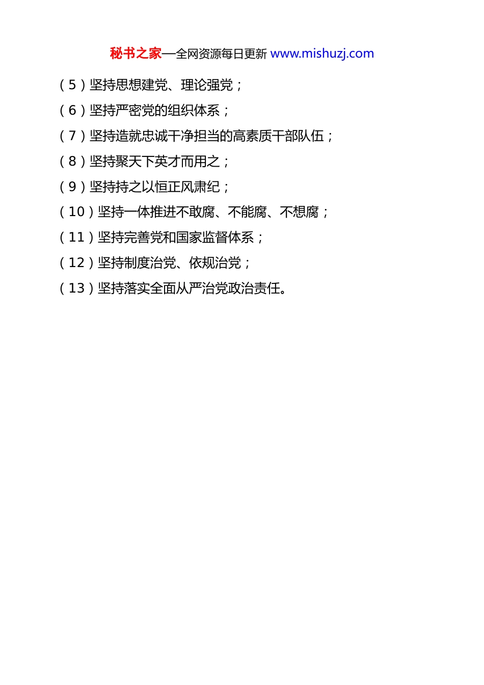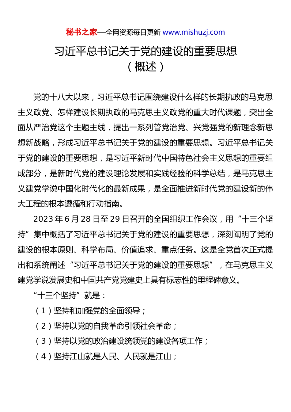 秘书之家—全网资源每日更新 www.mishuzj.com习近平总书记关于党的建设的重要思想(概述)党的十八大以来,习近平总书记围绕建设什么样的长期执政的马克思主义政党、怎样建设长期执政的马克思主义政党的重大时代课题,突出全面从严治党这个主题主线,提出一系列管党治党、兴党强党的新理念新思想新战略,形成习近平总书记关于党的建设的重要思想。习近平总书记关于党的建设的重要思想,是习近平新时代中国特色社会主义思想的重要组成部分,是新时代党的建设理论发展和实践经验的科学总结,是马克思主义建党学说中国化时代化的最新成果,是全面推进新时代党的建设新的伟大工程的根本遵循和行动指南。2023 年 6 月 28 日至 29 日召开的全国组织工作会议,用“十三个坚持”集中概括了习近平总书记关于党的建设的重要思想,深刻阐明了党的建设的根本原则、科学布局、价值追求、重点任务。这是全党首次正式提出和系统阐述“习近平总书记关于党的建设的重要思想”,在马克思主义建党学说发展史和中国共产党党建史上具有标志性的里程碑意义。“十三个坚持”就是:(1)坚持和加强党的全面领导;(2)坚持以党的自我革命引领社会革命;(3)坚持以党的政治建设统领党的建设各项工作;(4)坚持江山就是人民、人民就是江山;秘书之家—全网资源每日更新 www.mishuzj.com(5)坚持思想建党、理论强党;(6)坚持严密党的组织体系;(7)坚持造就忠诚干净担当的高素质干部队伍;(8)坚持聚天下英才而用之;(9)坚持持之以恒正风肃纪;(10)坚持一体推进不敢腐、不能腐、不想腐;(11)坚持完善党和国家监督体系;(12)坚持制度治党、依规治党;(13)坚持落实全面从严治党政治责任。秘书之家—全网资源每日更新 www.mishuzj.com习近平总书记关于党的自我革命的重要思想(概述)党的十八大以来,习近平总书记带领全党以前所未有的决心力度推进全面从严治党,创造性提出一系列具有原创性、标志性的新理念新思想新战略,形成习近平总书记关于党的自我革命的重要思想,指引百年大党开辟了自我革命的新境界。这是我们党坚持“两个结合”推进理论创新取得的新成果,是习近平新时代中国特色社会主义思想的新篇章,标志着我们党对马克思主义政党建设规律、共产党执政规律的认识达到新高度。2024 年 1 月召开的二十届中央纪委三次全会深刻阐述习近平总书记关于党的自我革命的重要思想,系统回答我们党为什么要自我革命、为什么能自我革命、怎样推进自我革命等三个重大问题,明确提出推进自我革命“九个以”的实践要求。“九个以”的实践要求,即:(1)以坚持党中央集中统一领导为根本保证;(2)以引领伟大社会革命为根本目的;(3)以习近平新时代中国特色社会主义思想为根本遵循;(4)以跳出历史周期率为战略目标;(5)以解决大党独有难题为主攻方向;(6)以健全全面从严治党体系为有效途径;(7)以锻造坚强组织、建设过硬队伍为重要着力点;秘书之家—全网资源每日更新 www.mishuzj.com(8)以正风肃纪反腐为重要抓手;(9)以自我监督和人民监督相结合为强大动力。习近平总书记关于党的自我革命的重要思想凝结了新时代全面从严治党丰富实践经验和重要理论成果,凝聚了全党高度共识,为新时代新征程深入推进全面从严治党、党风廉政建设和反腐败斗争提供了根本遵循。秘书之家—全网资源每日更新 www.mishuzj.com习近平总书记关于全面加强党的纪律建设的重要论述加强党的纪律建设是一项经常性工作,要引导党员、干部把他律转化为自律,内化为日用而不觉的言行准则。建立常态化长效化的纪律教育机制,使纪律教育贯穿干部成长全周期、融入组织管理全过程。严格执行党的纪律,准确运用“四种形态”,实事求是、毋枉毋纵,抓早抓小、防微杜渐,把从严管理监督和鼓励担当作为统一起来,使干部在遵规守纪中改革创新、干事创业。——2025 年 1 月 6 日,习近平总书记在二十届中央纪委四次全会上的讲话要毫不放松坚持党的领导、加强党的建设。推进党纪学习教育常态化长效化,引导党员干部真正把纪律规矩转化为政治自觉、思想自觉、行动自觉。——2024 年 10 月 17 日至 18...