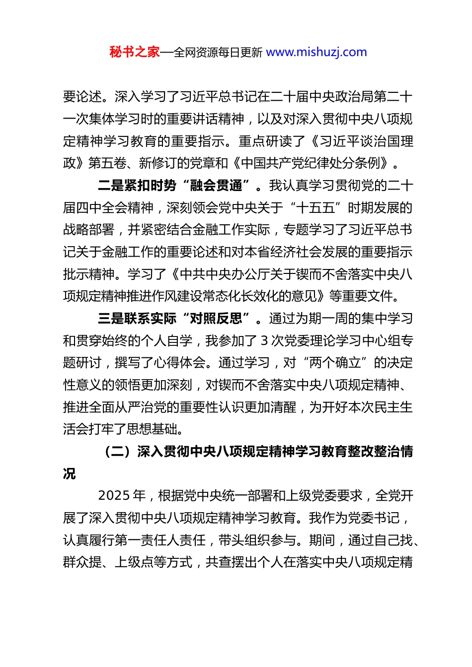 秘书之家—全网资源每日更新 www.mishuzj.comXX 农商行党委书记 2025 年度民主生活会对照检查材料根据省委、市委和省联社党委关于召开 2025 年度民主生活会的统一部署和要求,本人紧扣“深入学习贯彻习近平新时代中国特色社会主义思想,全面贯彻落实党的二十届三中、四中全会精神,以打攻坚战、持久战的决心和恒心,锲而不舍落实中央八项规定精神,推进作风建设常态化长效化,为实现‘十五五’良好开局奠定坚实基础”这一主题,在扎实开展会前学习研讨、广泛征求意见建议、深入进行谈心谈话的基础上,严格对照五个方面的要求,紧密联系个人思想、工作、作风实际,进行了深刻的自我检查和党性分析。现将对照检查情况报告如下:一、会前学习研讨与相关情况说明(一)会前学习研讨情况本人高度重视此次民主生活会会前的思想理论武装,将其作为检视问题、深化认识、筑牢基础的关键环节。我坚持以上率下,将个人自学与党委理论学习中心组集体学习相结合,系统深入地进行了学习研讨。一是聚焦核心“学深悟透”。我原原本本、逐字逐句学习了习近平总书记关于党的建设的重要思想、关于党的自我革命的重要思想,特别是关于加强党的纪律建设、作风建设的重秘书之家—全网资源每日更新 www.mishuzj.com要论述。深入学习了习近平总书记在二十届中央政治局第二十一次集体学习时的重要讲话精神,以及对深入贯彻中央八项规定精神学习教育的重要指示。重点研读了《习近平谈治国理政》第五卷、新修订的党章和《中国共产党纪律处分条例》。二是紧扣时势“融会贯通”。我认真学习贯彻党的二十届四中全会精神,深刻领会党中央关于“十五五”时期发展的战略部署,并紧密结合金融工作实际,专题学习了习近平总书记关于金融工作的重要论述和对本省经济社会发展的重要指示批示精神。学习了《中共中央办公厅关于锲而不舍落实中央八项规定精神推进作风建设常态化长效化的意见》等重要文件。三是联系实际“对照反思”。通过为期一周的集中学习和贯穿始终的个人自学,我参加了 3 次党委理论学习中心组专题研讨,撰写了心得体会。通过学习,对“两个确立”的决定性意义的领悟更加深刻,对锲而不舍落实中央八项规定精神、推进全面从严治党的重要性认识更加清醒,为开好本次民主生活会打牢了思想基础。(二)深入贯彻中央八项规定精神学习教育整改整治情况2025 年,根据党中央统一部署和上级党委要求,全党开展了深入贯彻中央八项规定精神学习教育。我作为党委书记,认真履行第一责任人责任,带头组织参与。期间,通过自己找、群众提、上级点等方式,共查摆出个人在落实中央八项规定精秘书之家—全网资源每日更新 www.mishuzj.com神方面存在的 3 个具体问题(如:有时调研考察存在“走马观花”现象;对精简会议、文件的刚性要求有时执行不够彻底)。针对这些问题,我制定了个人整改清单,均已按期完成整改,并推动了相关制度机制的完善。(三)上年度民主生活会及巡视巡察整改落实情况针对 2024 年度民主生活会查摆出的 5 个方面 12 项具体问题,以及上级巡视巡察反馈涉及个人的问题,我已全部建立整改台账,实行销号管理。截至本次民主生活会前,各项整改措施均已落实到位,需长期坚持的也已转化为常态工作机制。例如,针对“理论联系实际不够紧密”的问题,我今年已牵头完成 2 项重点课题调研并推动成果转化。(四)本次民主生活会征求意见情况为精准查摆问题,我本人通过主持召开座谈会、与班子成员和分管部门负责人“一对一”谈心谈话、下沉基层网点听取意见等多种形式,累计征求到对个人的意见建议共 28 条。经梳理,主要涉及战略执行落地、深入基层调研、干部队伍严管厚爱等方面,均已原汁原味吸收进本次对照检查。二、对照“五个带头”查摆存在的主要问题我严格对照“五个带头”要求,坚持把自己摆进去、把职责摆进去、把工作摆进去,深入查摆了以下突出问题:(一)带头强化政治忠诚、提高政治能力方面1.政治判断力有待提升。对“国之大者”与农商行服务秘书之家—全网资源每日更新 www.mishuzj.com乡村振兴、发展普惠金融具体实践的结合点,有时找得不够精准。例如,在贯彻落实中...