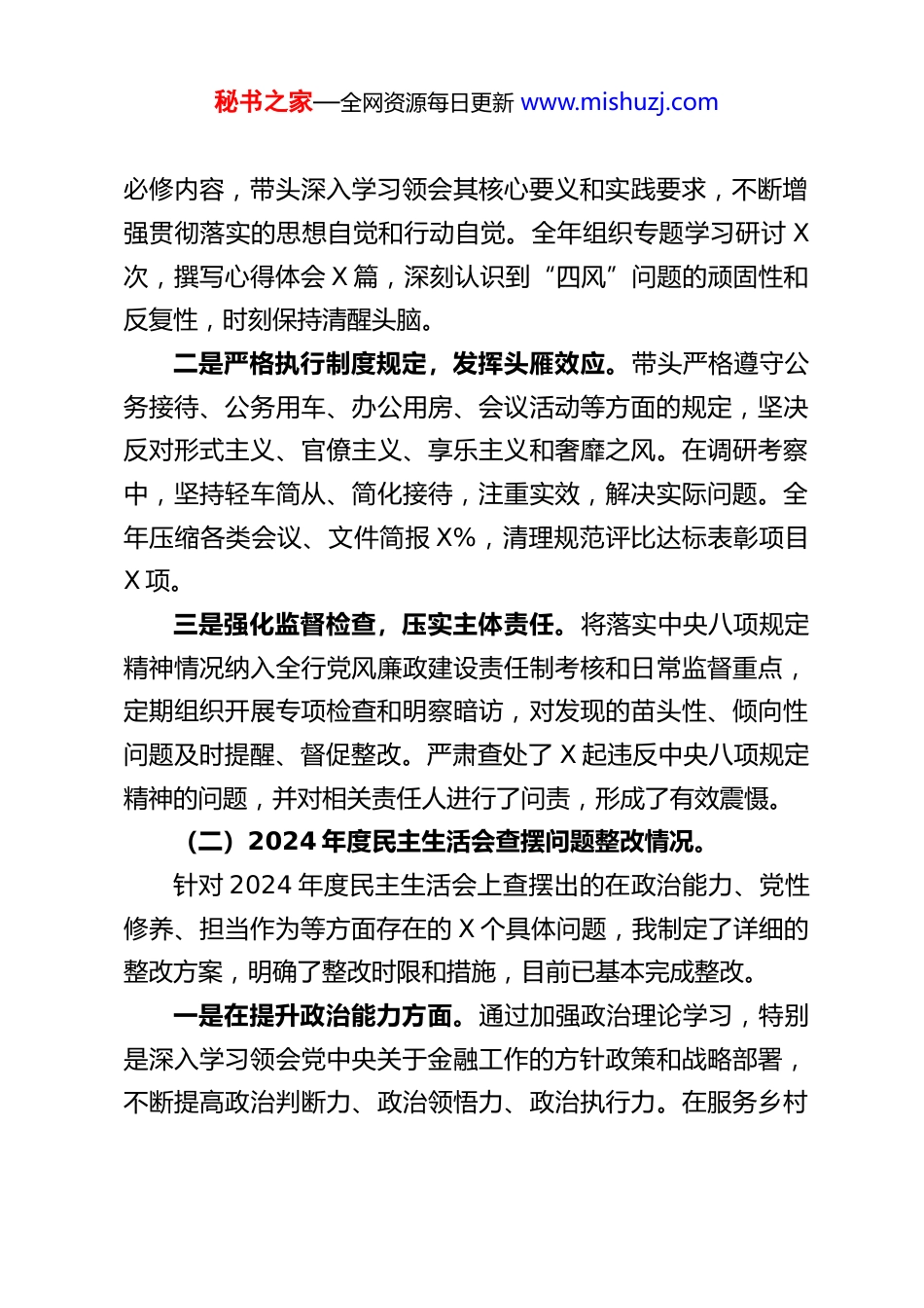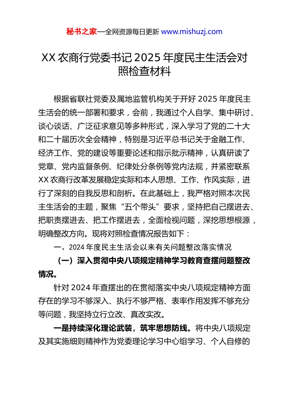 秘书之家—全网资源每日更新 www.mishuzj.comXX 农商行党委书记 2025 年度民主生活会对照检查材料根据省联社党委及属地监管机构关于开好 2025 年度民主生活会的统一部署和要求,会前,我通过个人自学、集中研讨、谈心谈话、广泛征求意见等多种形式,深入学习了党的二十大和二十届历次全会精神,特别是习近平总书记关于金融工作、经济工作、党的建设等重要论述和指示批示精神,认真研读了党章、党内监督条例、纪律处分条例等党内法规,并紧密联系XX 农商行改革发展稳定实际和本人思想、工作、作风实际,进行了深刻的自我反思和剖析。在此基础上,我严格对照本次民主生活会的主题,聚焦“五个带头”要求,坚持把自己摆进去、把职责摆进去、把工作摆进去,全面检视问题,深挖思想根源,明确整改方向。现将对照检查情况报告如下:一、2024 年度民主生活会以来有关问题整改落实情况(一)深入贯彻中央八项规定精神学习教育查摆问题整改情况。针对 2024 年查摆出的在贯彻落实中央八项规定精神方面存在的学习不够深入、执行不够严格、表率作用发挥不够充分等问题,我坚持立行立改、真改实改。一是持续深化理论武装,筑牢思想防线。将中央八项规定及其实施细则精神作为党委理论学习中心组学习、个人自修的秘书之家—全网资源每日更新 www.mishuzj.com必修内容,带头深入学习领会其核心要义和实践要求,不断增强贯彻落实的思想自觉和行动自觉。全年组织专题学习研讨 X次,撰写心得体会 X 篇,深刻认识到“四风”问题的顽固性和反复性,时刻保持清醒头脑。二是严格执行制度规定,发挥头雁效应。带头严格遵守公务接待、公务用车、办公用房、会议活动等方面的规定,坚决反对形式主义、官僚主义、享乐主义和奢靡之风。在调研考察中,坚持轻车简从、简化接待,注重实效,解决实际问题。全年压缩各类会议、文件简报 X%,清理规范评比达标表彰项目X 项。三是强化监督检查,压实主体责任。将落实中央八项规定精神情况纳入全行党风廉政建设责任制考核和日常监督重点,定期组织开展专项检查和明察暗访,对发现的苗头性、倾向性问题及时提醒、督促整改。严肃查处了 X 起违反中央八项规定精神的问题,并对相关责任人进行了问责,形成了有效震慑。(二)2024 年度民主生活会查摆问题整改情况。针对 2024 年度民主生活会上查摆出的在政治能力、党性修养、担当作为等方面存在的 X 个具体问题,我制定了详细的整改方案,明确了整改时限和措施,目前已基本完成整改。一是在提升政治能力方面。通过加强政治理论学习,特别是深入学习领会党中央关于金融工作的方针政策和战略部署,不断提高政治判断力、政治领悟力、政治执行力。在服务乡村秘书之家—全网资源每日更新 www.mishuzj.com振兴、支持实体经济、防控金融风险等重大决策部署上,能够自觉同党中央保持高度一致,确保执行不偏向、不走样。二是在锤炼党性修养方面。严格执行双重组织生活制度,以普通党员身份参加所在党支部的组织生活 X 次,带头开展批评与自我批评。通过重温入党誓词、参观红色教育基地等方式,进一步强化党员意识,砥砺党性心性。针对“有时存在‘老好人’思想”的问题,在干部管理、执纪问责中敢于较真碰硬,严肃性明显增强。三是在强化担当作为方面。面对复杂严峻的经济金融形势和激烈的市场竞争,主动担当,迎难而上。聚焦主责主业,加大了对“三农”、小微企业的信贷支持力度,全年涉农贷款余额增长 X%,普惠型小微企业贷款余额增长 X%。在化解重点领域风险、推动数字化转型等难点工作上,亲自部署、靠前指挥,取得了阶段性成效。例如,成功化解了 X 户大额不良贷款风险,金额 X 万元;推动线上业务占比提升至 X%。(总体来看,上年度查摆问题的整改取得了预期效果,但一些深层次问题仍需持续用力、久久为功。例如,理论学习的系统性和深度有待进一步加强,工作中攻坚克难的锐气仍需提升等,需要在今后工作中不断改进。)二、存在的主要问题(坚持问题导向,紧扣民主生活会主题,对照“五个带头”要求,结合征求到的意见建议、谈心谈话指出的问题、上秘书之家—全网资源每日更新 www.mishuzj.com...