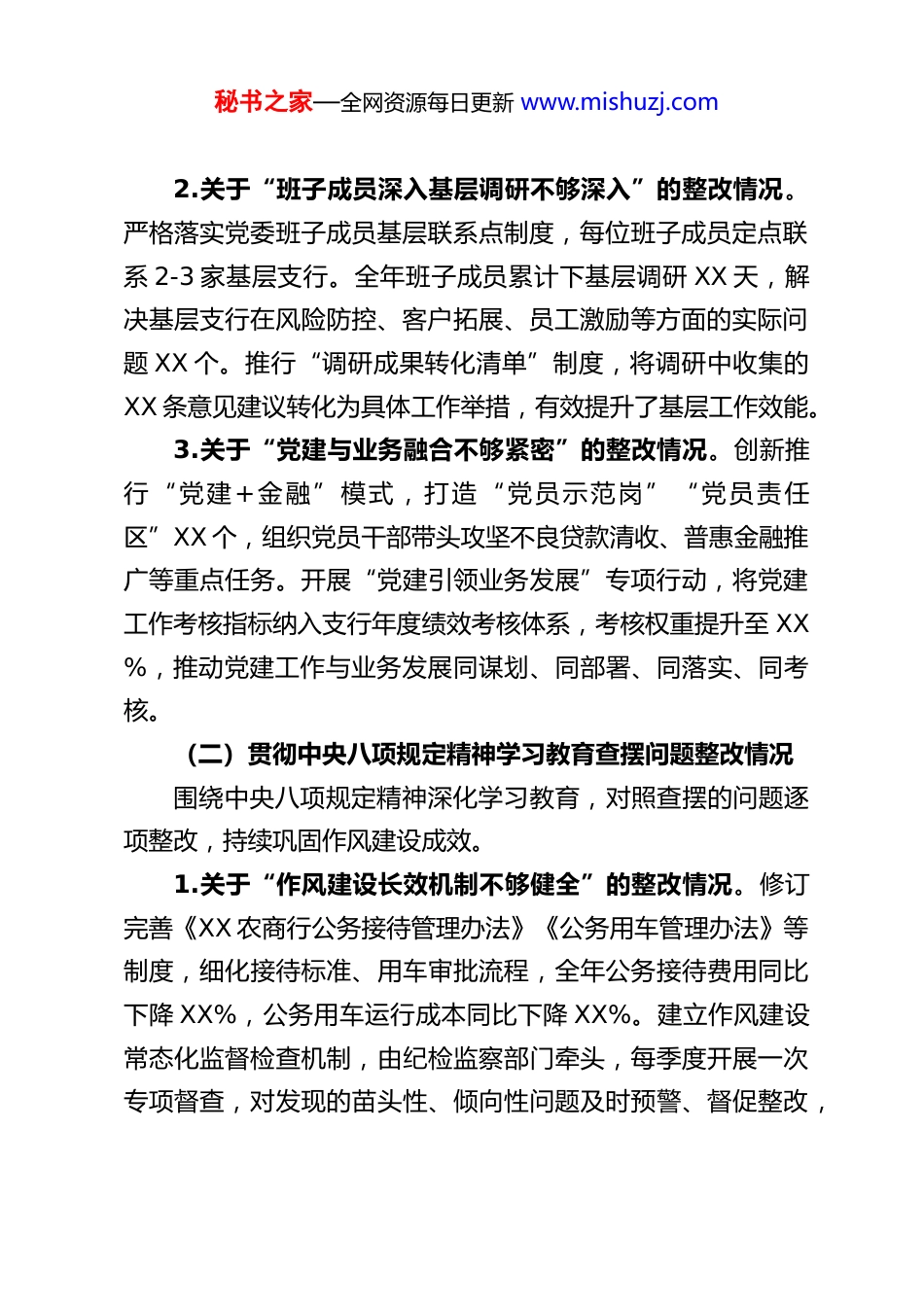 秘书之家—全网资源每日更新 www.mishuzj.comXX 农商行党委书记 2025 年度民主生活会对照检查材料根据省联社党委关于 2025 年度民主生活会的统一部署和要求,会前,我紧扣会议主题,通过参加党委理论学习中心组专题研讨、与班子成员及基层支行负责人谈心谈话、面向全行干部职工和客户代表征求意见建议等方式,进一步深化思想认识、找准问题症结。同时,对 2024 年度民主生活会整改落实情况、中央八项规定精神贯彻执行情况、专项监督反馈问题整改情况等进行全面梳理。现结合思想和工作实际,对照检查如下。一、2024 年度民主生活会及相关问题整改落实情况(一)2024 年度民主生活会查摆问题整改情况2024 年度民主生活会后,我牵头制定整改清单,明确整改目标、责任人和完成时限,扎实推进问题整改。1.关于“金融服务乡村振兴质效有待提升”的整改情况。针对信贷产品与农业产业链需求匹配度不高的问题,组建专项调研团队,深入县域各乡镇、农业合作社和涉农企业走访调研。推出“惠农贷”“产业链贷”等特色信贷产品 12 款,累计投放涉农贷款 XX 亿元,较整改前增长 XX%。建立与农业农村局、乡村振兴局的常态化对接机制,精准对接新型农业经营主体需求,服务覆盖全县 XX%的行政村。秘书之家—全网资源每日更新 www.mishuzj.com2.关于“班子成员深入基层调研不够深入”的整改情况。严格落实党委班子成员基层联系点制度,每位班子成员定点联系 2-3 家基层支行。全年班子成员累计下基层调研 XX 天,解决基层支行在风险防控、客户拓展、员工激励等方面的实际问题 XX 个。推行“调研成果转化清单”制度,将调研中收集的XX 条意见建议转化为具体工作举措,有效提升了基层工作效能。3.关于“党建与业务融合不够紧密”的整改情况。创新推行“党建+金融”模式,打造“党员示范岗”“党员责任区”XX 个,组织党员干部带头攻坚不良贷款清收、普惠金融推广等重点任务。开展“党建引领业务发展”专项行动,将党建工作考核指标纳入支行年度绩效考核体系,考核权重提升至 XX%,推动党建工作与业务发展同谋划、同部署、同落实、同考核。(二)贯彻中央八项规定精神学习教育查摆问题整改情况围绕中央八项规定精神深化学习教育,对照查摆的问题逐项整改,持续巩固作风建设成效。1.关于“作风建设长效机制不够健全”的整改情况。修订完善《XX 农商行公务接待管理办法》《公务用车管理办法》等制度,细化接待标准、用车审批流程,全年公务接待费用同比下降 XX%,公务用车运行成本同比下降 XX%。建立作风建设常态化监督检查机制,由纪检监察部门牵头,每季度开展一次专项督查,对发现的苗头性、倾向性问题及时预警、督促整改,秘书之家—全网资源每日更新 www.mishuzj.com全年共开展督查 XX 次,下发整改通知书 XX 份。2.关于“形式主义、官僚主义仍有残留”的整改情况。大力精简会议文件,严格执行会议审批制度,全年召开的全行性会议同比减少 XX%,印发的文件同比减少 XX%。取消不必要的报表报送 XX 项,优化报表填报流程,减轻基层支行报表填报负担。推行“一线工作法”,要求机关部门负责人每月至少在基层支行驻点办公 XX 天,直接听取基层员工和客户意见,杜绝“文山会海”“纸上谈兵”等问题。(三)其他专项监督反馈问题整改情况针对上级党委专项监督、巡视巡察、审计监督以及意识形态责任制落实、整治违规吃喝和违规打牌赌博等方面反馈的问题,逐一制定整改措施,确保整改到位。1.专项监督反馈金融风险防控短板问题整改。聚焦信贷风险、操作风险、流动性风险等重点领域,完善风险预警体系,建立客户信用评级动态调整机制,对高风险客户实行名单制管理。加大不良贷款清收处置力度,通过现金清收、资产重组、司法诉讼等方式,全年累计清收不良贷款 XX 亿元,不良贷款率较年初下降 XX 个百分点。加强员工行为管理,开展员工异常行为排查 XX 次,排查出风险隐患 XX 条,全部完成整改。2.意识形态责任制落实问题整改。将意识形态工作纳入党委重要议事日程,全年召开意识形态工作专题会议 XX 次,分析研判意识形态领域形势。加强对微信公众号、短视频...