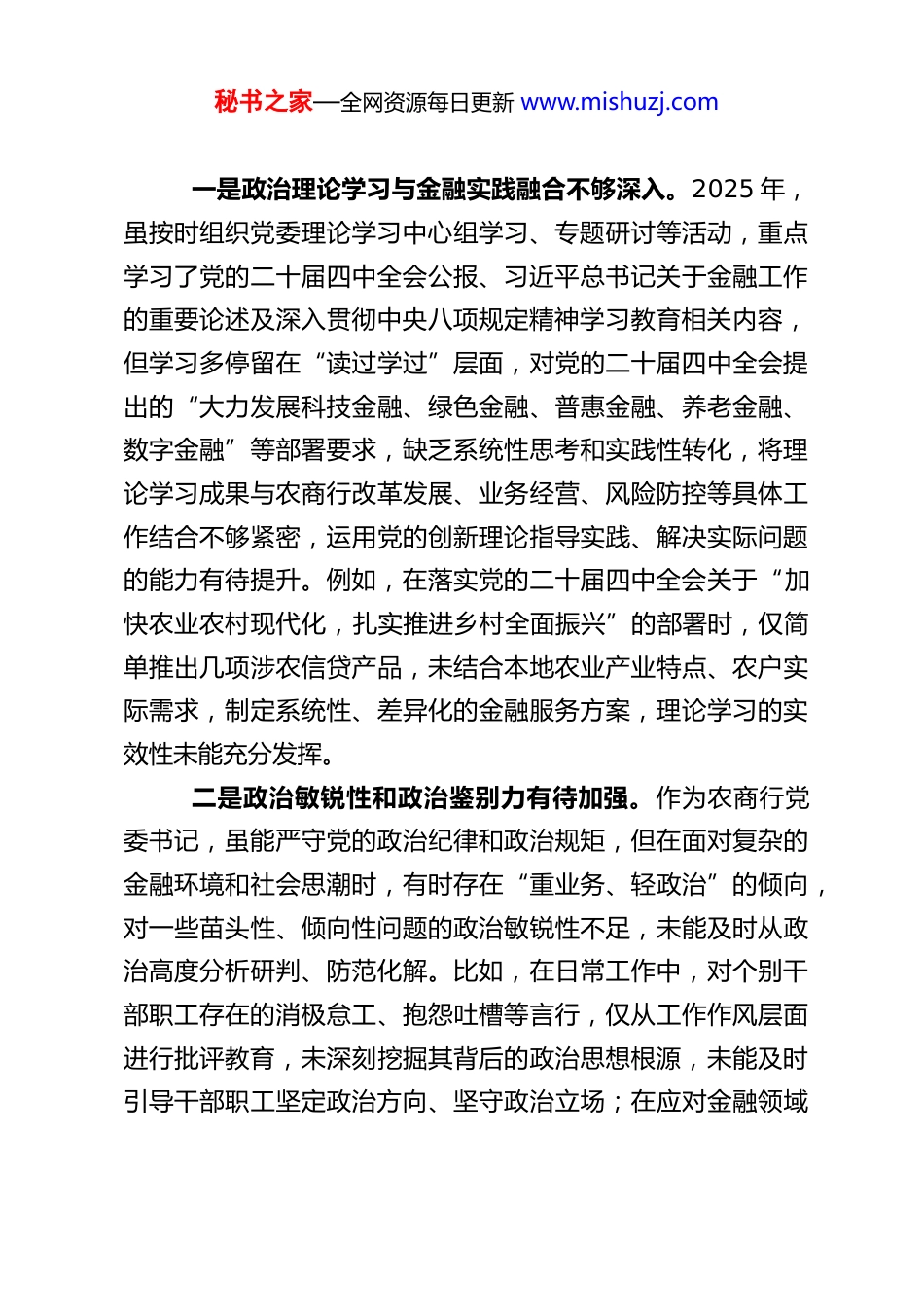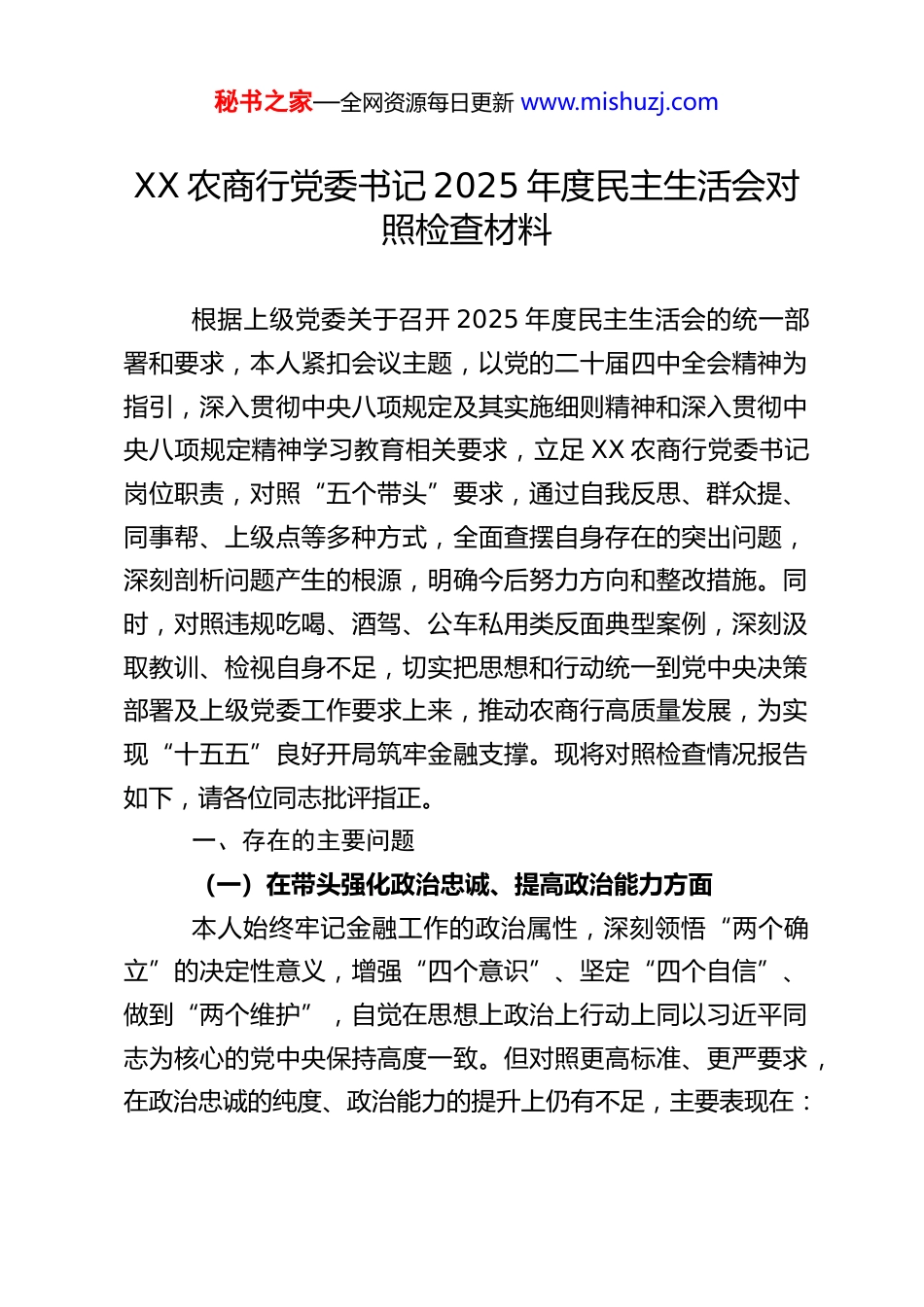 秘书之家—全网资源每日更新 www.mishuzj.comXX 农商行党委书记 2025 年度民主生活会对照检查材料根据上级党委关于召开 2025 年度民主生活会的统一部署和要求,本人紧扣会议主题,以党的二十届四中全会精神为指引,深入贯彻中央八项规定及其实施细则精神和深入贯彻中央八项规定精神学习教育相关要求,立足 XX 农商行党委书记岗位职责,对照“五个带头”要求,通过自我反思、群众提、同事帮、上级点等多种方式,全面查摆自身存在的突出问题,深刻剖析问题产生的根源,明确今后努力方向和整改措施。同时,对照违规吃喝、酒驾、公车私用类反面典型案例,深刻汲取教训、检视自身不足,切实把思想和行动统一到党中央决策部署及上级党委工作要求上来,推动农商行高质量发展,为实现“十五五”良好开局筑牢金融支撑。现将对照检查情况报告如下,请各位同志批评指正。一、存在的主要问题(一)在带头强化政治忠诚、提高政治能力方面本人始终牢记金融工作的政治属性,深刻领悟“两个确立”的决定性意义,增强“四个意识”、坚定“四个自信”、做到“两个维护”,自觉在思想上政治上行动上同以习近平同志为核心的党中央保持高度一致。但对照更高标准、更严要求,在政治忠诚的纯度、政治能力的提升上仍有不足,主要表现在:秘书之家—全网资源每日更新 www.mishuzj.com一是政治理论学习与金融实践融合不够深入。2025 年,虽按时组织党委理论学习中心组学习、专题研讨等活动,重点学习了党的二十届四中全会公报、习近平总书记关于金融工作的重要论述及深入贯彻中央八项规定精神学习教育相关内容,但学习多停留在“读过学过”层面,对党的二十届四中全会提出的“大力发展科技金融、绿色金融、普惠金融、养老金融、数字金融”等部署要求,缺乏系统性思考和实践性转化,将理论学习成果与农商行改革发展、业务经营、风险防控等具体工作结合不够紧密,运用党的创新理论指导实践、解决实际问题的能力有待提升。例如,在落实党的二十届四中全会关于“加快农业农村现代化,扎实推进乡村全面振兴”的部署时,仅简单推出几项涉农信贷产品,未结合本地农业产业特点、农户实际需求,制定系统性、差异化的金融服务方案,理论学习的实效性未能充分发挥。二是政治敏锐性和政治鉴别力有待加强。作为农商行党委书记,虽能严守党的政治纪律和政治规矩,但在面对复杂的金融环境和社会思潮时,有时存在“重业务、轻政治”的倾向,对一些苗头性、倾向性问题的政治敏锐性不足,未能及时从政治高度分析研判、防范化解。比如,在日常工作中,对个别干部职工存在的消极怠工、抱怨吐槽等言行,仅从工作作风层面进行批评教育,未深刻挖掘其背后的政治思想根源,未能及时引导干部职工坚定政治方向、坚守政治立场;在应对金融领域秘书之家—全网资源每日更新 www.mishuzj.com舆情时,有时过于注重业务层面的回应,忽视了政治层面的把控,缺乏主动防范、积极引导的政治自觉。三是贯彻落实党中央大政方针和决策部署不够有力。在推动党中央关于金融工作的决策部署落地见效时,有时存在“上热中温下冷”的现象,对上级党委的工作要求,虽能及时传达部署,但在跟踪问效、督促落实上力度不足,缺乏一抓到底的韧劲。例如,在落实党中央关于“防范化解金融风险”的决策部署时,虽组织开展了风险排查、整改等工作,但对一些长期存在的不良贷款清收、关联交易管控等难点问题,缺乏攻坚克难的决心和有效举措,整改成效不够明显;在推进金融支持实体经济发展上,未能充分结合本地实际,精准对接企业需求,信贷投放的针对性、实效性有待提升,与党中央“金融为民”的要求仍有差距。四是政治能力建设不够系统。在政治能力建设上缺乏系统性规划,平时多注重业务能力提升,对政治能力的锤炼不够主动。在重大问题决策、复杂矛盾处理时,有时未能完全站在政治高度统筹考量,未能充分体现政治要求与业务工作的有机统一;在带领班子成员开展工作时,对班子成员的政治能力培养引导不够,未能有效形成齐抓共管、共同提升政治能力的良好氛围。(二)在带头固本培元、增强党性方面本人始终坚持把政治修养摆在党性修养的首位,自觉以秘书之...