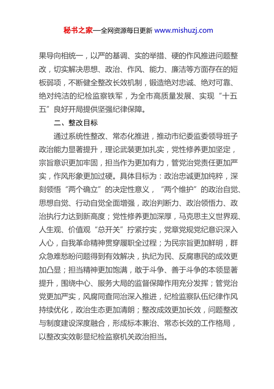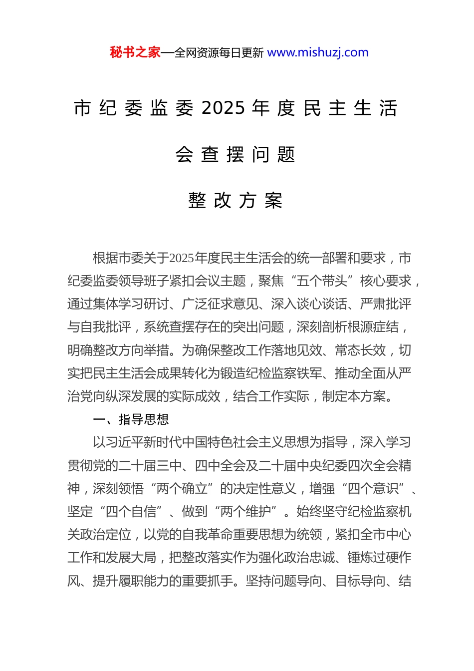 秘书之家—全网资源每日更新 www.mishuzj.com市 纪 委 监 委 2025 年 度 民 主 生 活会 查 摆 问 题整 改 方 案根据市委关于2025年度民主生活会的统一部署和要求,市纪委监委领导班子紧扣会议主题,聚焦“五个带头”核心要求,通过集体学习研讨、广泛征求意见、深入谈心谈话、严肃批评与自我批评,系统查摆存在的突出问题,深刻剖析根源症结,明确整改方向举措。为确保整改工作落地见效、常态长效,切实把民主生活会成果转化为锻造纪检监察铁军、推动全面从严治党向纵深发展的实际成效,结合工作实际,制定本方案。一、指导思想以习近平新时代中国特色社会主义思想为指导,深入学习贯彻党的二十届三中、四中全会及二十届中央纪委四次全会精神,深刻领悟“两个确立”的决定性意义,增强“四个意识”、坚定“四个自信”、做到“两个维护”。始终坚守纪检监察机关政治定位,以党的自我革命重要思想为统领,紧扣全市中心工作和发展大局,把整改落实作为强化政治忠诚、锤炼过硬作风、提升履职能力的重要抓手。坚持问题导向、目标导向、结秘书之家—全网资源每日更新 www.mishuzj.com果导向相统一,以严的基调、实的举措、硬的作风推进问题整改,切实解决思想、政治、作风、能力、廉洁等方面存在的短板弱项,不断健全整改长效机制,锻造绝对忠诚、绝对可靠、绝对纯洁的纪检监察铁军,为全市高质量发展、实现“十五五”良好开局提供坚强纪律保障。二、整改目标通过系统性整改、常态化推进,推动市纪委监委领导班子政治能力显著提升,理论武装更加扎实,党性修养更加坚定,宗旨意识更加牢固,担当作为更加有力,管党治党责任更加严实,作风形象更加过硬。具体目标为:政治忠诚更加纯粹,深刻领悟“两个确立”的决定性意义,“两个维护”的政治自觉、思想自觉、行动自觉全面增强,政治判断力、政治领悟力、政治执行力达到新高度;党性修养更加深厚,马克思主义世界观、人生观、价值观“总开关”拧紧拧实,党章党规党纪意识深入人心,自我革命精神贯穿履职全过程;为民宗旨更加鲜明,群众急难愁盼问题得到有效解决,执纪为民、反腐惠民的成效更加凸显;担当精神更加饱满,敢于斗争、善于斗争的本领显著提升,围绕中心、服务大局的监督保障作用充分发挥;管党治党更加严实,风腐同查同治深入推进,纪检监察队伍纪律作风持续优化,政治生态更加清朗;整改成效更加长效,问题整改与制度建设深度融合,形成标本兼治、常态长效的工作格局,以整改实效彰显纪检监察机关政治担当。秘书之家—全网资源每日更新 www.mishuzj.com三、整改措施(一)带头强化政治忠诚,提高政治能力1 .深化理论武装铸魂,筑牢政治根基。坚持把学习贯彻习近平新时代中国特色社会主义思想作为首要政治任务,严格执行“第一议题”制度,牵头制定班子年度学习计划,每月开展1 次集中专题研讨,每季度组织1 次党的创新理论专题培训,全年累计开展集体学习不少于12次、专题调研不少于8 次。带头深学细悟党的自我革命重要思想,深刻把握“九个以”实践要求,结合纪检监察工作实际撰写学习心得和理论文章,每年牵头完成2 项重点课题调研,推动理论学习与监督执纪、案件查办、巡察整改等实践深度融合。建立理论学习考核机制,将学习成效纳入班子成员年度考核和干部评优评先指标,倒逼理论学习走深走实,切实把学习成果转化为谋划工作的思路、推动落实的举措,不断增强政治认同、思想认同、理论认同、情感认同。2 .精准发力政治监督,压实政治责任。聚焦党中央大政方针和习近平总书记重要指示批示精神落实,建立政治监督清单化、项目化管理机制,围绕新质生产力发展、优化营商环境、重大项目建设等重点工作,细化12项监督任务、明确36项具体举措。牵头完善“一把手”和领导班子监督体系,每半年开展1 次对下级党委(党组)“一把手”监督谈话,全年组织2 次专项监督检查,健全廉政风险防控台账,推动监督从“表层覆秘书之家—全网资源每日更新 www.mishuzj.com盖”向“深层穿透”转变。统筹纪律监督、监察监督、派驻监督、巡察监督融合贯通,建立健全信息共享、线索互移、成果共用机制,每月召开1...
