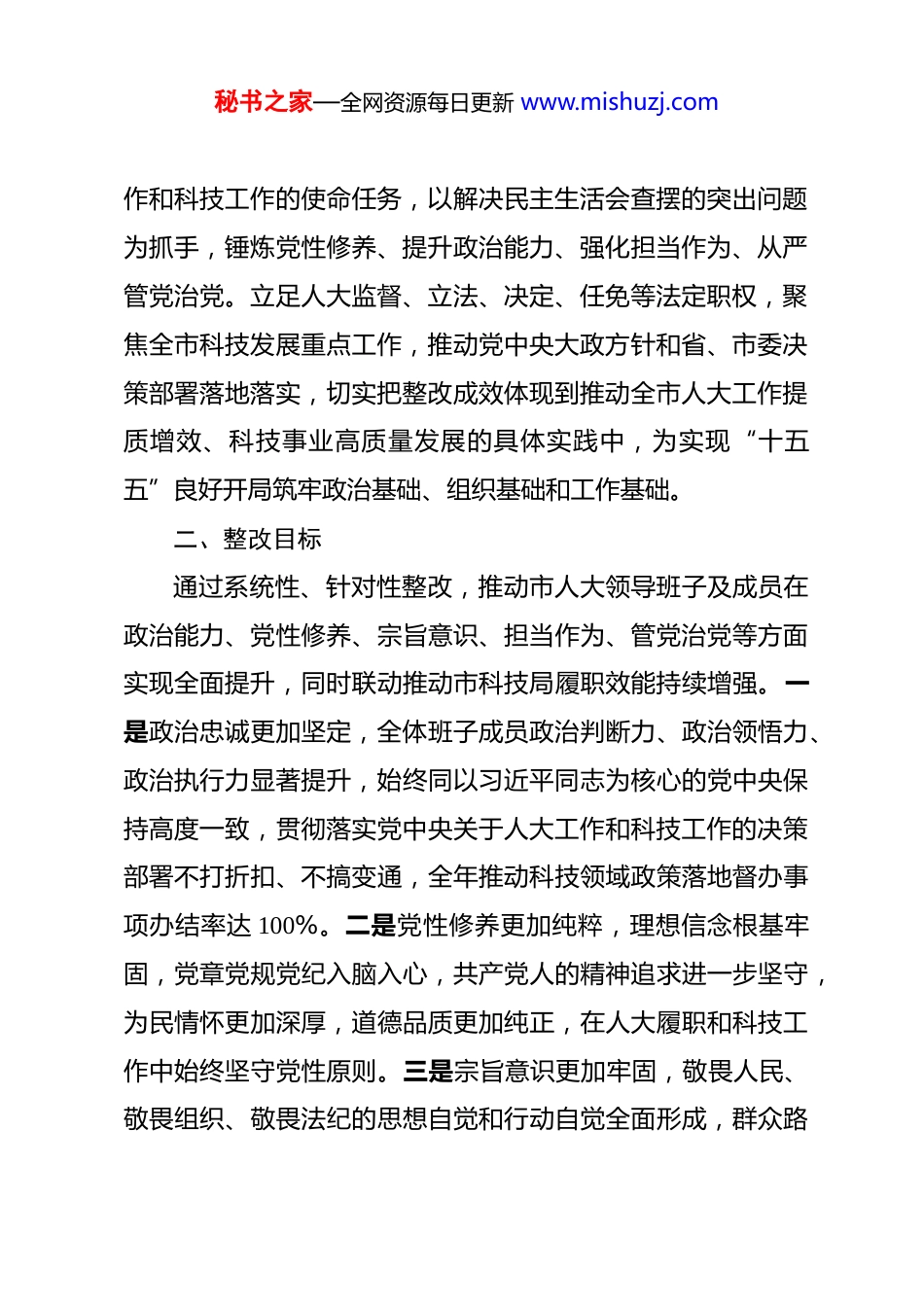 秘书之家—全网资源每日更新 www.mishuzj.com市人大 2025 年度民主生活会查摆问题整改方案 为深入贯彻落实习近平新时代中国特色社会主义思想和党的二十大及二十届历次全会精神,切实抓好 2025 年度民主生活会查摆问题整改落实工作,市人大紧扣民主生活会主题,对照会前征集意见、会上相互批评和自我查摆梳理的突出问题,结合全市经济社会发展和人大工作实际,同时立足主责主业,坚持问题导向、目标导向、结果导向相统一,深入分析问题根源,研究制定本整改方案。方案明确整改措施、责任主体、整改时限,推动各项问题整改落地见效,切实把民主生活会成果转化为加强自身建设、提升履职能力、服务发展大局的实际成效,为全市高质量发展和科技自立自强提供坚强保障。一、指导思想以习近平新时代中国特色社会主义思想为指导,全面贯彻党的二十大和二十届历次全会精神,深入学习贯彻习近平总书记关于坚持和完善人民代表大会制度的重要思想、关于科技创新的重要论述,深刻领悟“两个确立”的决定性意义,增强“四个意识”、坚定“四个自信”、做到“两个维护”。始终坚持党的全面领导,把政治建设摆在首位,紧扣新时代人大工秘书之家—全网资源每日更新 www.mishuzj.com作和科技工作的使命任务,以解决民主生活会查摆的突出问题为抓手,锤炼党性修养、提升政治能力、强化担当作为、从严管党治党。立足人大监督、立法、决定、任免等法定职权,聚焦全市科技发展重点工作,推动党中央大政方针和省、市委决策部署落地落实,切实把整改成效体现到推动全市人大工作提质增效、科技事业高质量发展的具体实践中,为实现“十五五”良好开局筑牢政治基础、组织基础和工作基础。二、整改目标通过系统性、针对性整改,推动市人大领导班子及成员在政治能力、党性修养、宗旨意识、担当作为、管党治党等方面实现全面提升,同时联动推动市科技局履职效能持续增强。一是政治忠诚更加坚定,全体班子成员政治判断力、政治领悟力、政治执行力显著提升,始终同以习近平同志为核心的党中央保持高度一致,贯彻落实党中央关于人大工作和科技工作的决策部署不打折扣、不搞变通,全年推动科技领域政策落地督办事项办结率达 100%。二是党性修养更加纯粹,理想信念根基牢固,党章党规党纪入脑入心,共产党人的精神追求进一步坚守,为民情怀更加深厚,道德品质更加纯正,在人大履职和科技工作中始终坚守党性原则。三是宗旨意识更加牢固,敬畏人民、敬畏组织、敬畏法纪的思想自觉和行动自觉全面形成,群众路秘书之家—全网资源每日更新 www.mishuzj.com线走深走实,全年深入基层调研人大工作和科技发展问题不少于 60 天,解决群众和企业急难愁盼问题办结率达 95%以上。四是担当作为更加主动,正确政绩观牢固树立,新发展理念全面贯彻,人大监督的精准性、有效性显著提升,科技领域改革攻坚、创新驱动发展的举措更加务实,在推动高质量发展中展现更大作为。五是管党治党更加严实,全面从严治党主体责任压紧压实,中央八项规定精神落实落细,形式主义、官僚主义得到有效整治,风清气正的政治生态持续巩固,人大机关和科技系统党风廉政建设水平全面提升。六是整改成效更加长效,建立健全问题整改长效机制,形成发现问题、整改落实、监督检查、巩固提升的闭环管理,推动整改成果制度化、规范化,切实以整改促提升、以整改促发展。三、整改措施(一)铸牢政治忠诚之魂,提升履职政治能力1.深化理论武装,把准政治方向。坚持把学习贯彻习近平新时代中国特色社会主义思想作为首要政治任务,将习近平总书记关于科技创新的重要论述纳入市人大理论学习中心组学习计划,每月开展 1 次专题学习,每年组织专题研讨不少于 6 次,推动理论学习与人大监督科技工作深度融合。作为市科技局主要负责人,带头领学促学,组织科技系统党员干部开展集中学秘书之家—全网资源每日更新 www.mishuzj.com习培训全年不少于 40 学时,切实把理论学习成果转化为把握科技发展规律、谋划科技工作的实际能力。深刻领悟“两个确立”的决定性意义,把“两个维护”体现在推动科技政策落实、监督科技项目实施的具体行动中,围绕国家科技自立...