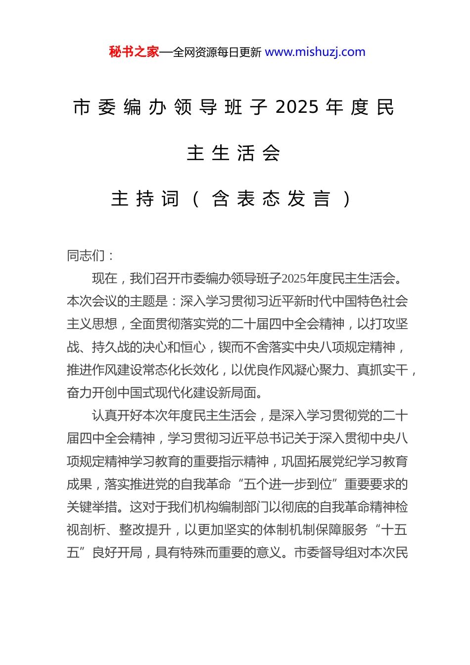 秘书之家—全网资源每日更新 www.mishuzj.com市 委 编 办 领 导 班 子 2025 年 度 民主 生 活 会主 持 词 ( 含 表 态 发 言 )同志们:现在,我们召开市委编办领导班子2025年度民主生活会。本次会议的主题是:深入学习贯彻习近平新时代中国特色社会主义思想,全面贯彻落实党的二十届四中全会精神,以打攻坚战、持久战的决心和恒心,锲而不舍落实中央八项规定精神,推进作风建设常态化长效化,以优良作风凝心聚力、真抓实干,奋力开创中国式现代化建设新局面。认真开好本次年度民主生活会,是深入学习贯彻党的二十届四中全会精神,学习贯彻习近平总书记关于深入贯彻中央八项规定精神学习教育的重要指示精神,巩固拓展党纪学习教育成果,落实推进党的自我革命“五个进一步到位”重要要求的关键举措。这对于我们机构编制部门以彻底的自我革命精神检视剖析、整改提升,以更加坚实的体制机制保障服务“十五五”良好开局,具有特殊而重要的意义。市委督导组对本次民秘书之家—全网资源每日更新 www.mishuzj.com主生活会高度重视,**组长(督导组组长)亲临会场指导,让我们以热烈的掌声表示欢迎和感谢!为开好这次民主生活会,领导班子在会前进行了认真准备聚焦主题深化学习研讨,广泛征求了市直部门、县区编办及本单位党员干部的意见建议,班子成员之间、班子成员与分管科室负责同志均深入开展了谈心谈话,在此基础上认真撰写了班子对照检查材料和个人发言提纲。这些准备工作为会议高质量召开奠定了坚实基础。本次会议共有五项议程。现在,进行会议第一项议程:由我通报相关情况。(… … 通报内容略… … )下面,进行会议第二项议程:由我代表领导班子作检视剖析发言。(… … 检视剖析内容略… … )现在,进行会议第三项议程:请班子成员逐一进行个人对照检查,其他同志对其开展批评。希望大家在发言中,紧扣本次民主生活会主题,紧密结合机构编制工作实际和分管领域,自我批评要勇于揭短亮丑、深挖根源,相互批评要出于公心、直截了当,达到“团结—批评—团结”的目的。首先,由我开始作个人对照检查。(… … 班子成员依次发言,开展批评与自我批评… … )秘书之家—全网资源每日更新 www.mishuzj.com刚才,各位班子成员本着对党、对事业、对同志高度负责的态度,严肃认真地开展了批评与自我批评。查摆问题比较深入,原因剖析触及思想,相互批评坦诚相见,整改方向较为明确,体现了党内政治生活的政治性、时代性、原则性、战斗性。现在,进行会议第四项议程:让我们以热烈的掌声,欢迎市委督导组**组长作点评讲话。(… … 督导组组长点评讲话略… … )感谢**组长全面、深刻、中肯的点评讲话。督导组的点评,既肯定了我们的前期工作和会议成效,更精准指出了我们存在的问题与不足,并对下一步整改落实和班子建设提出了明确要求,具有很强的针对性和指导性。我们诚恳接受、照单全收,并将严格贯彻落实到后续的整改工作和各项履职实践中。下面,由我代表领导班子,就抓好整改落实、巩固会议成果作表态讲话。一、坚持固本铸魂,在深化理论武装、提升政治能力上持续用力,筑牢机构编制工作的思想根基督导组指出的问题,根源在于理论武装的深度和政治站位的硬度尚有差距。我们将以此为警醒,把深化理论学习作为首要政治任务常抓不懈。我们将严格落实“第一议题”制度,持续深入学习习近平新时代中国特色社会主义思想的核心要义,特别是习近平总书记关于机构编制工作的重要论述和指示批示精神,深刻领会其中蕴含的政治立场、价值追求和科学方法。秘书之家—全网资源每日更新 www.mishuzj.com要深入学习党的二十届四中全会关于深化党和国家机构改革、推进国家治理体系和治理能力现代化的战略部署,确保机构编制工作始终沿着正确政治方向前进。习近平总书记强调,要“不断提高政治判断力、政治领悟力、政治执行力”。机构编制资源是重要的政治资源、执政资源,机构编制工作本质上是政治工作。我们将把学习贯彻党的创新理论与谋划推动机构编制工作高质量发展紧密结合起来,自觉从政治上审视、考量、推进每一项机构设置、职能调整和编...