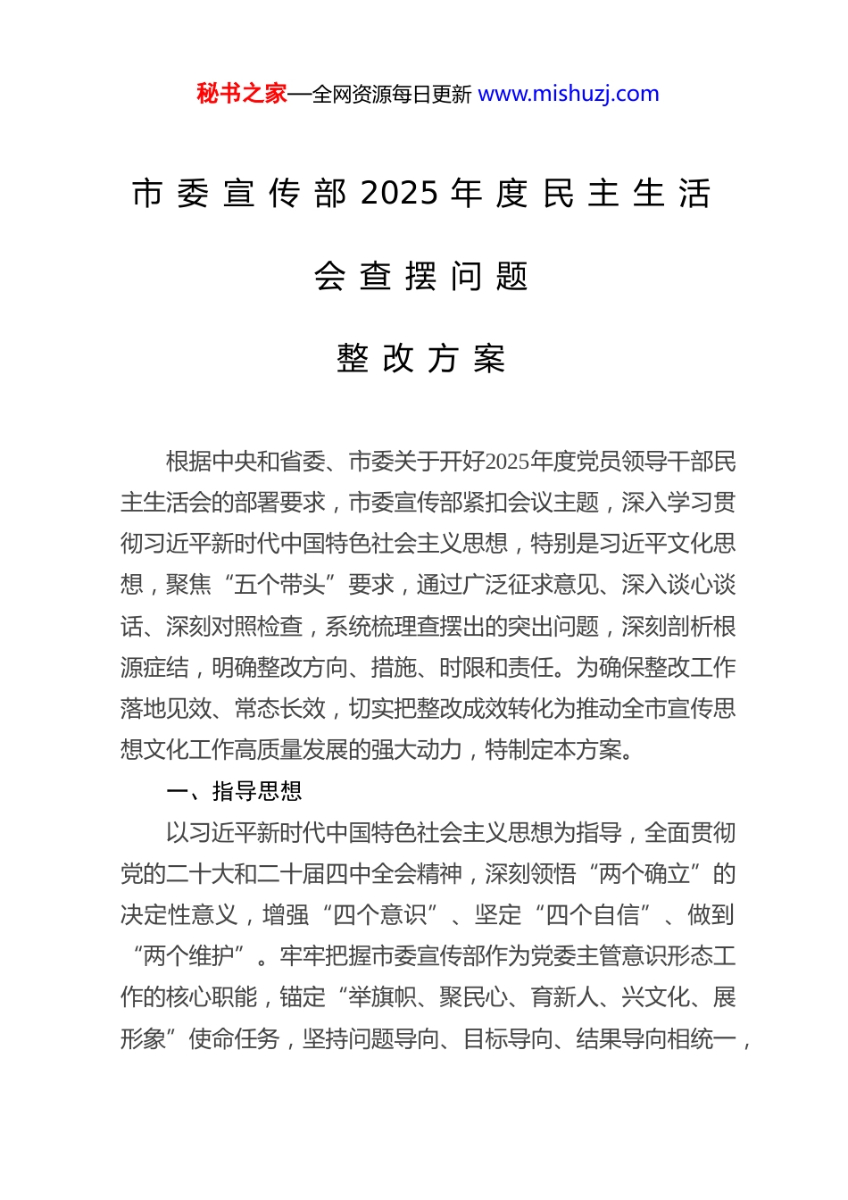 秘书之家—全网资源每日更新 www.mishuzj.com市 委 宣 传 部 2025 年 度 民 主 生 活会 查 摆 问 题整 改 方 案根据中央和省委、市委关于开好2025年度党员领导干部民主生活会的部署要求,市委宣传部紧扣会议主题,深入学习贯彻习近平新时代中国特色社会主义思想,特别是习近平文化思想,聚焦“五个带头”要求,通过广泛征求意见、深入谈心谈话、深刻对照检查,系统梳理查摆出的突出问题,深刻剖析根源症结,明确整改方向、措施、时限和责任。为确保整改工作落地见效、常态长效,切实把整改成效转化为推动全市宣传思想文化工作高质量发展的强大动力,特制定本方案。一、指导思想以习近平新时代中国特色社会主义思想为指导,全面贯彻党的二十大和二十届四中全会精神,深刻领悟“两个确立”的决定性意义,增强“四个意识”、坚定“四个自信”、做到“两个维护”。牢牢把握市委宣传部作为党委主管意识形态工作的核心职能,锚定“举旗帜、聚民心、育新人、兴文化、展形象”使命任务,坚持问题导向、目标导向、结果导向相统一,秘书之家—全网资源每日更新 www.mishuzj.com以刀刃向内的自我革命精神狠抓整改落实。紧扣2025年“十四五”收官、“十五五”谋篇布局关键节点,围绕抗战胜利80周年等重大主题,把整改工作与强化理论武装、管控意识形态、推动文化繁荣、深化作风建设紧密结合,切实提高政治判断力、政治领悟力、政治执行力,坚决扛起管党治党政治责任,着力打造政治过硬、本领高强、求实创新、能打胜仗的宣传思想工作队伍,为全市经济社会高质量发展提供坚强思想保证、精神力量、道德滋养和文化支撑。二、整改目标通过系统性整改、常态化落实,推动市委宣传部领导班子政治忠诚更加坚定、党性修养更加扎实、宗旨意识更加牢固、担当作为更加有力、管党治党更加严格,各项工作质效显著提升。理论武装学用转化能力全面增强,习近平新时代中国特色社会主义思想和党的创新理论宣传阐释更加精准鲜活,全年基层宣讲覆盖人数突破50万人次,理论宣传产品转化率提升30%。意识形态领域风险防控体系更加健全,网络空间治理效能显著提高,重大舆情处置响应时间压缩至2 小时内,隐性风险排查整改率达100 %。为民服务质效持续优化,基层宣传文化阵地短板全面补齐,群众文化需求响应办结率达95%以上。干事创业氛围更加浓厚,媒体融合发展、文化产业升级等重点工作取得突破性进展,市级主流媒体新媒体营收占比提升至45%。管党治党责任层层压实,作风建设常态化长效化机制不秘书之家—全网资源每日更新 www.mishuzj.com断完善,形式主义、官僚主义问题得到根本整治,违规违纪问题发生率保持为零,以整改实效树立宣传思想战线良好形象。三、整改措施(一)带头强化政治忠诚,锻造过硬政治能力针对理论武装学用脱节、政治“三力”不足、贯彻落实流于形式等问题,立足宣传思想工作政治属性,靶向施策补短板、强弱项。1 .深化理论武装,筑牢思想根基。坚持“第一议题”制度,建立领导班子“领学+研学+践学”三位一体学习机制,每月开展1 次专题研学,每季度牵头组织1 次全市性理论研讨活动,全年完成习近平新时代中国特色社会主义思想专题学习不少于12次。聚焦“两个结合”“六个必须坚持”,牵头梳理本地贯彻落实党的创新理论的实践案例,组织编写《新时代宣传思想工作实践指南》,推动理论学习与重大主题宣传、基层宣讲、文化创作深度融合。建立理论转化成效评估机制,将理论学习成果转化为宣传方案、文化产品、工作举措的数量和质量纳入年度考核,确保党的创新理论精准对接本地发展实际,全年打造具有本地辨识度的理论宣传产品不少于20件,切实解决学用“两张皮”问题。2 .锤炼政治本领,防范意识形态风险。建立意识形态领域风险常态化排查机制,每月召开1 次舆情分析研判会,组建由20名专家组成的意识形态风险评估智库,对网络空间历史虚秘书之家—全网资源每日更新 www.mishuzj.com无主义、泛娱乐化等新型错误思潮开展专项研判,形成风险清单、责任清单、整改清单。完善重大舆情处置应急预案,开展季度性应急演练,提升快速响应、精准引导能力,对各类平台不...
