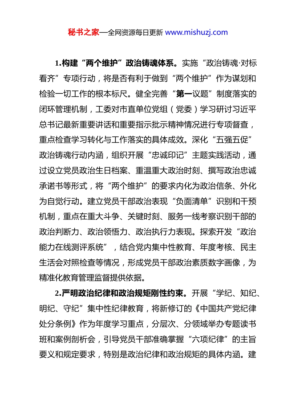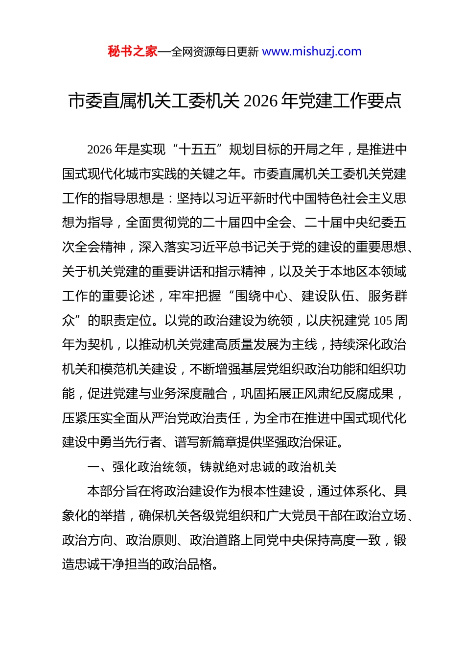 秘书之家—全网资源每日更新 www.mishuzj.com市委直属机关工委机关 2026 年党建工作要点 2026 年是实现“十五五”规划目标的开局之年,是推进中国式现代化城市实践的关键之年。市委直属机关工委机关党建工作的指导思想是:坚持以习近平新时代中国特色社会主义思想为指导,全面贯彻党的二十届四中全会、二十届中央纪委五次全会精神,深入落实习近平总书记关于党的建设的重要思想、关于机关党建的重要讲话和指示精神,以及关于本地区本领域工作的重要论述,牢牢把握“围绕中心、建设队伍、服务群众”的职责定位。以党的政治建设为统领,以庆祝建党 105 周年为契机,以推动机关党建高质量发展为主线,持续深化政治机关和模范机关建设,不断增强基层党组织政治功能和组织功能,促进党建与业务深度融合,巩固拓展正风肃纪反腐成果,压紧压实全面从严治党政治责任,为全市在推进中国式现代化建设中勇当先行者、谱写新篇章提供坚强政治保证。一、强化政治统领,铸就绝对忠诚的政治机关本部分旨在将政治建设作为根本性建设,通过体系化、具象化的举措,确保机关各级党组织和广大党员干部在政治立场、政治方向、政治原则、政治道路上同党中央保持高度一致,锻造忠诚干净担当的政治品格。秘书之家—全网资源每日更新 www.mishuzj.com1.构建“两个维护”政治铸魂体系。实施“政治铸魂·对标看齐”专项行动,将是否有利于做到“两个维护”作为谋划和检验一切工作的根本标尺。健全完善“第一议题”制度落实的闭环管理机制,工委对市直单位党组(党委)学习研讨习近平总书记最新重要讲话和重要指示批示精神情况进行专项督查,重点检查学习转化与工作落实的具体成效。深化“五强五促”政治铸魂行动内涵,组织开展“忠诚印记”主题实践活动,通过设立党员政治生日档案、重温重大政治时刻、撰写政治忠诚承诺书等形式,将“两个维护”的要求内化为政治信条、外化为自觉行动。建立党员干部政治表现“负面清单”识别和干预机制,重点在重大斗争、关键时刻、服务一线考察识别干部的政治判断力、政治领悟力、政治执行力表现。探索开发“政治能力在线测评系统”,结合党内集中性教育、年度考核、民主生活会对照检查等情况,形成党员干部政治素质数字画像,为精准化教育管理监督提供依据。2.严明政治纪律和政治规矩刚性约束。开展“学纪、知纪、明纪、守纪”集中性纪律教育,将新修订的《中国共产党纪律处分条例》作为年度学习重点,分层次、分领域举办专题读书班和案例剖析会,引导党员干部准确掌握“六项纪律”的主旨要义和规定要求,特别是政治纪律和政治规矩的具体内涵。建秘书之家—全网资源每日更新 www.mishuzj.com立政治纪律执行情况常态化分析研判机制,工委每季度会同市纪委监委派驻机构,对市直机关党员干部在网络言行、重大事项报告、落实组织决定等方面存在的苗头性、倾向性问题进行联合排查和风险预警。严格执行重大事项请示报告制度,制定市直机关请示报告事项清单和规范化模板,对迟报、漏报、瞒报的单位和个人进行通报,并与党建考核、评优评先直接挂钩。深化肃清流毒影响工作,组织开展“政治生态大家谈”专题组织生活会,深入查摆和清除不良政治文化的潜规则和亚文化,营造清清爽爽的同志关系、规规矩矩的上下级关系。3.提升党内政治生活政治性时代性原则性战斗性。制定《关于提高市直机关民主生活会和组织生活会质量的若干规定》,明确会前征求意见、谈心谈话、对照检查,会上批评与自我批评,会后整改落实各环节的刚性标准和量化要求。建立上级党组织派员全程列席指导下级领导班子民主生活会和党支部组织生活会机制,重点督导批评“辣味”不足、问题整改浮于表面的情况,并进行现场点评和整改督办。创新“情景式”“互动式”主题党日模式,围绕“重温入党誓词、铭记政治身份”、“对标先进典型、查找政治差距”、“聚焦中心任务、强化政治担当”等主题,设计开发系列标准化主题党日课程包,推动组织生活从“程序到位”向“效果务实”提升。全面推行秘书之家—全网资源每日更新 www.mishuzj.com“政治体检”制度,机关基层党组织每年结合民主评议党员,组织党员干部对照政治...