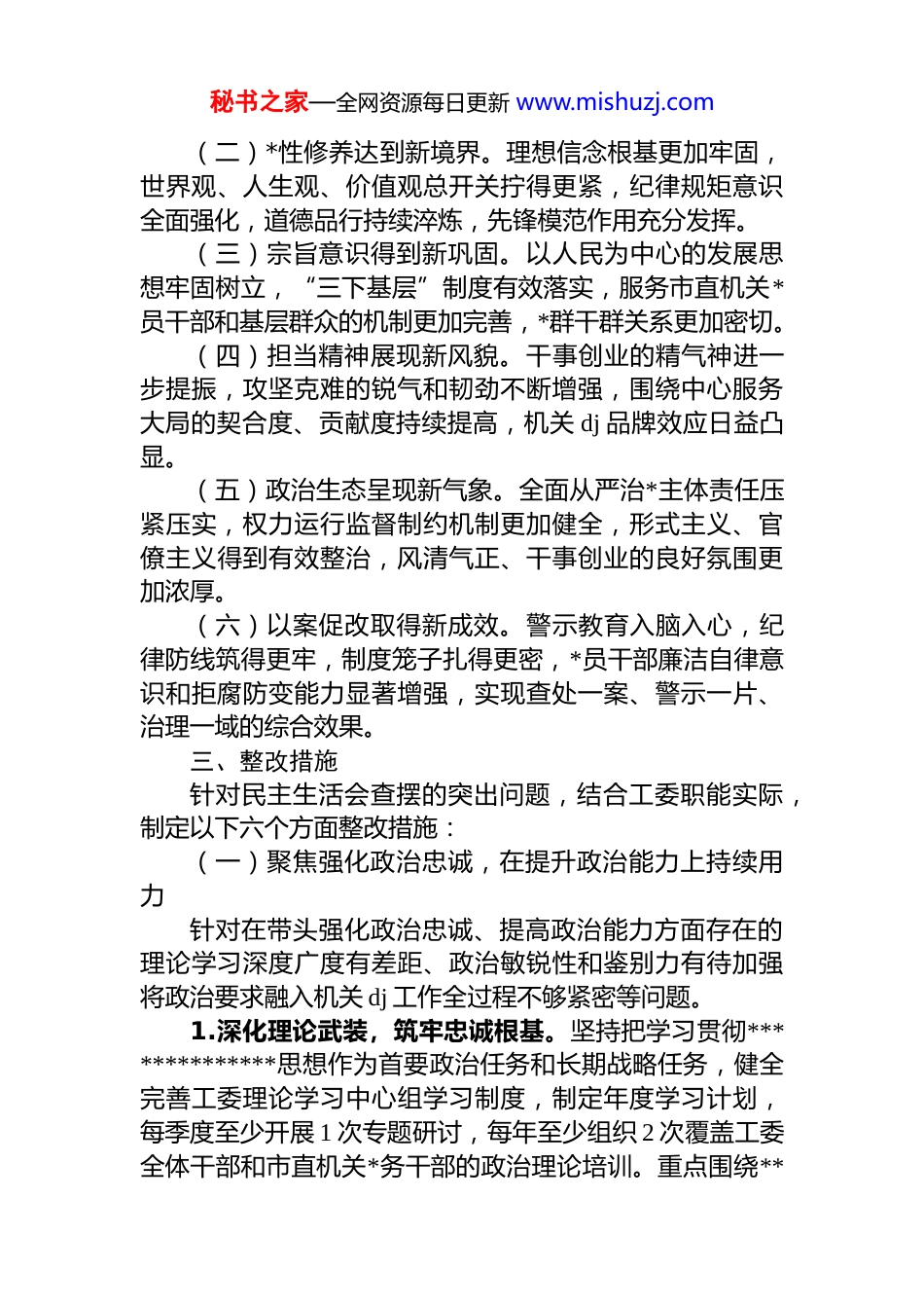 秘书之家—全网资源每日更新 www.mishuzj.com市委直属机关工委领导班子 2025 年度民主生活会查摆问题整改方案根据市委关于开好 2025 年度*员领导干部民主生活会的统一部署,市委直属机关工委领导班子紧扣会议主题,深入学习研讨,广泛征求意见,坦诚谈心谈话,严肃开展批评与自我批评,系统梳理查摆出在政治忠诚、*性修养、敬畏意识、担当作为、管*治*以及以案促改等方面存在的突出问题。为扎实做好问题整改“后半篇文章”,推动工委各项工作再上新台阶,特制定本整改方案。一、指导思想坚持以**************思想为指导,全面贯彻*的二十大和二十届历次全会精神,深刻领悟“两个确立”的决定性意义,坚决做到“两个维护”。深入贯彻落实新时代*的建设总要求和新时代*的组织路线,聚焦“围绕中心、建设队伍、服务群众”核心职责,以本次民主生活会查摆问题整改为契机,以*的政治建设为统领,以落实全面从严治*主体责任为主线,以提升机关 dj 质量为目标,坚持问题导向、目标导向、结果导向相统一,发扬彻底的自我革命精神,着力补短板、强弱项、固根基、扬优势,切实把整改成果转化为推动市直机关*的建设高质量发展的强大动力和实际成效,为奋力谱写中国式现代化*篇章提供坚强政治保证和组织保证。二、整改目标(一)政治能力实现新提升。领导班子及成员的政治判断力、政治领悟力、政治执行力显著增强,“两个维护”更加自觉坚定,贯彻执行*中央决策部署和省委、市委工作要求更加坚决有力,政治机关属性更加鲜明突出。秘书之家—全网资源每日更新 www.mishuzj.com(二)*性修养达到新境界。理想信念根基更加牢固,世界观、人生观、价值观总开关拧得更紧,纪律规矩意识全面强化,道德品行持续淬炼,先锋模范作用充分发挥。(三)宗旨意识得到新巩固。以人民为中心的发展思想牢固树立,“三下基层”制度有效落实,服务市直机关*员干部和基层群众的机制更加完善,*群干群关系更加密切。(四)担当精神展现新风貌。干事创业的精气神进一步提振,攻坚克难的锐气和韧劲不断增强,围绕中心服务大局的契合度、贡献度持续提高,机关 dj 品牌效应日益凸显。(五)政治生态呈现新气象。全面从严治*主体责任压紧压实,权力运行监督制约机制更加健全,形式主义、官僚主义得到有效整治,风清气正、干事创业的良好氛围更加浓厚。(六)以案促改取得新成效。警示教育入脑入心,纪律防线筑得更牢,制度笼子扎得更密,*员干部廉洁自律意识和拒腐防变能力显著增强,实现查处一案、警示一片、治理一域的综合效果。三、整改措施针对民主生活会查摆的突出问题,结合工委职能实际,制定以下六个方面整改措施:(一)聚焦强化政治忠诚,在提升政治能力上持续用力针对在带头强化政治忠诚、提高政治能力方面存在的理论学习深度广度有差距、政治敏锐性和鉴别力有待加强将政治要求融入机关 dj 工作全过程不够紧密等问题。1.深化理论武装,筑牢忠诚根基。坚持把学习贯彻**************思想作为首要政治任务和长期战略任务,健全完善工委理论学习中心组学习制度,制定年度学习计划,每季度至少开展 1 次专题研讨,每年至少组织 2 次覆盖工委全体干部和市直机关*务干部的政治理论培训。重点围绕**秘书之家—全网资源每日更新 www.mishuzj.com****关于*的建设的重要思想、关于机关 dj 的重要论述以及最新重要讲话和指示批示精神,读原著、学原文、悟原理深刻把握其核心要义、精神实质、丰富内涵和实践要求。建立理论学习成果转化清单,班子成员每年至少撰写 2 篇高质量学习体会或调研报告,将学习成果转化为谋划机关 dj工作的思路、破解难题的举措、推动发展的能力,切实用以武装头脑、指导实践、推动工作,确保工委各项工作始终沿着正确政治方向前进。2.严守政治纪律,强化政治监督。始终把*的政治建设摆在首位,严明*的政治纪律和政治规矩。工委领导班子带头执行《关于新形势下*内政治生活的若干准则》,严格落实重大事项请示报告制度,每年至少召开 2 次会议专题研究机关*的政治建设工作。加强对市直机关各单位*组织和*员干部遵守政治纪律、政治规矩情况的监督检查,将“两个维护”体现在...