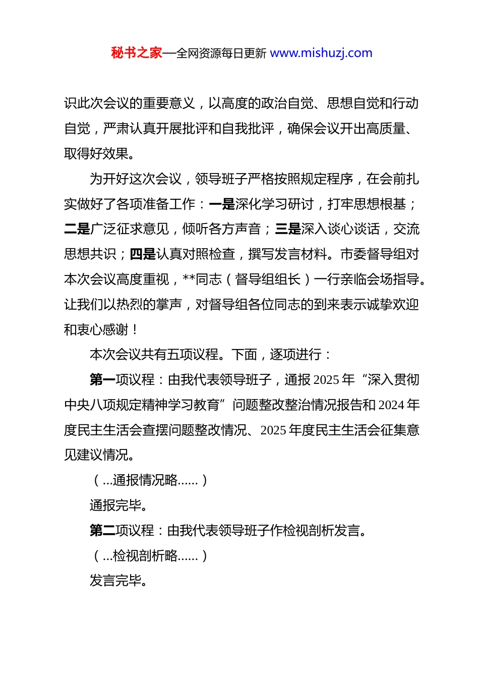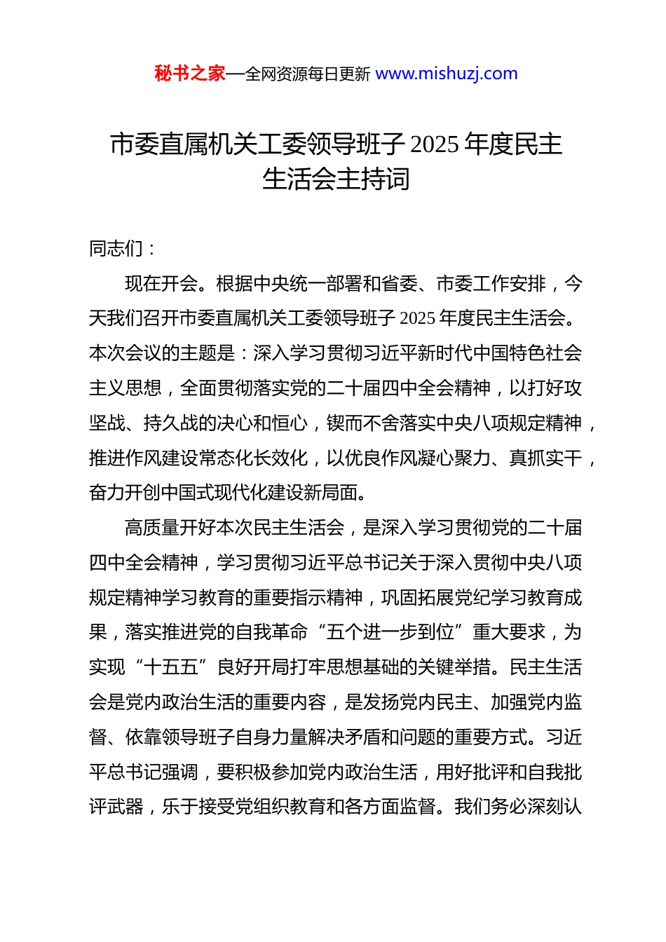 秘书之家—全网资源每日更新 www.mishuzj.com市委直属机关工委领导班子 2025 年度民主生活会主持词 同志们:现在开会。根据中央统一部署和省委、市委工作安排,今天我们召开市委直属机关工委领导班子 2025 年度民主生活会。本次会议的主题是:深入学习贯彻习近平新时代中国特色社会主义思想,全面贯彻落实党的二十届四中全会精神,以打好攻坚战、持久战的决心和恒心,锲而不舍落实中央八项规定精神,推进作风建设常态化长效化,以优良作风凝心聚力、真抓实干,奋力开创中国式现代化建设新局面。高质量开好本次民主生活会,是深入学习贯彻党的二十届四中全会精神,学习贯彻习近平总书记关于深入贯彻中央八项规定精神学习教育的重要指示精神,巩固拓展党纪学习教育成果,落实推进党的自我革命“五个进一步到位”重大要求,为实现“十五五”良好开局打牢思想基础的关键举措。民主生活会是党内政治生活的重要内容,是发扬党内民主、加强党内监督、依靠领导班子自身力量解决矛盾和问题的重要方式。习近平总书记强调,要积极参加党内政治生活,用好批评和自我批评武器,乐于接受党组织教育和各方面监督。我们务必深刻认秘书之家—全网资源每日更新 www.mishuzj.com识此次会议的重要意义,以高度的政治自觉、思想自觉和行动自觉,严肃认真开展批评和自我批评,确保会议开出高质量、取得好效果。为开好这次会议,领导班子严格按照规定程序,在会前扎实做好了各项准备工作:一是深化学习研讨,打牢思想根基;二是广泛征求意见,倾听各方声音;三是深入谈心谈话,交流思想共识;四是认真对照检查,撰写发言材料。市委督导组对本次会议高度重视,**同志(督导组组长)一行亲临会场指导。让我们以热烈的掌声,对督导组各位同志的到来表示诚挚欢迎和衷心感谢!本次会议共有五项议程。下面,逐项进行:第一项议程:由我代表领导班子,通报 2025 年“深入贯彻中央八项规定精神学习教育”问题整改整治情况报告和 2024 年度民主生活会查摆问题整改情况、2025 年度民主生活会征集意见建议情况。(…通报情况略……)通报完毕。第二项议程:由我代表领导班子作检视剖析发言。(…检视剖析略……)发言完毕。秘书之家—全网资源每日更新 www.mishuzj.com第三项议程:各班子成员进行个人对照检查发言,并接受其他同志的批评。请同志们发言时开门见山、直奔主题,自我批评要勇于揭短亮丑,相互批评要出于公心、实事求是,真正达到“团结—批评—团结”的目的。下面,请**同志首先发言,其他同志依次进行。(…班子成员发言与相互批评略……)第四项议程:请市委督导组组长**同志进行点评讲话。大家欢迎!(…督导组组长点评略……)感谢**组长客观中肯地点评和精准有力地指导。督导组的意见既肯定了我们的工作,也严肃指出了存在的问题和不足,更为我们抓好整改落实、加强班子自身建设指明了方向。我们完全赞同、诚恳接受,并将严格按照要求,不折不扣抓好贯彻落实。同志们,刚才督导组**组长做了非常重要的讲话,提出了明确要求。这既是对我们的有力督导,更是一次深刻的党性教育。下面,我代表工委领导班子,就抓好问题整改、巩固会议成果,郑重表态如下:一、在淬炼政治忠诚上聚焦用力,以更高站位把稳思想之秘书之家—全网资源每日更新 www.mishuzj.com舵督导组指出的问题和班子查摆的短板,根源在于理论武装的深度和政治站位的精度尚有不足。我们将把深化理论学习、提升政治能力作为整改的首要任务和长期课题。习近平总书记指出,历史经验表明,我们党作为马克思主义政党,必须旗帜鲜明讲政治,严肃认真开展党内政治生活。作为统一组织、规划、部署市直机关党的工作的政治机关,工委领导班子的政治属性必须更加鲜明,政治功能必须更加凸显。我们将以本次民主生活会为新的起点,坚持把学懂弄通做实习近平新时代中国特色社会主义思想作为终身课题,与学习贯彻党的二十届四中全会精神贯通起来,与深刻领会“五个进一步到位”的自我革命要求结合起来。建立健全“第一议题”制度落实的督查机制,推动理论学习中心组学习研讨往深里走、往实里走,班子成员带头撰写心得体会、开展理论宣讲,切...