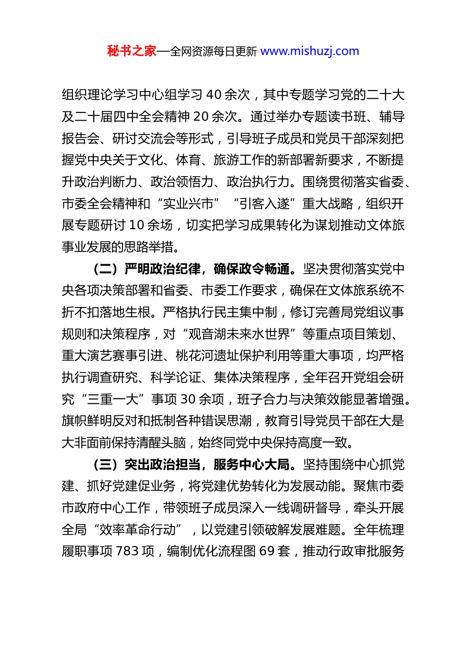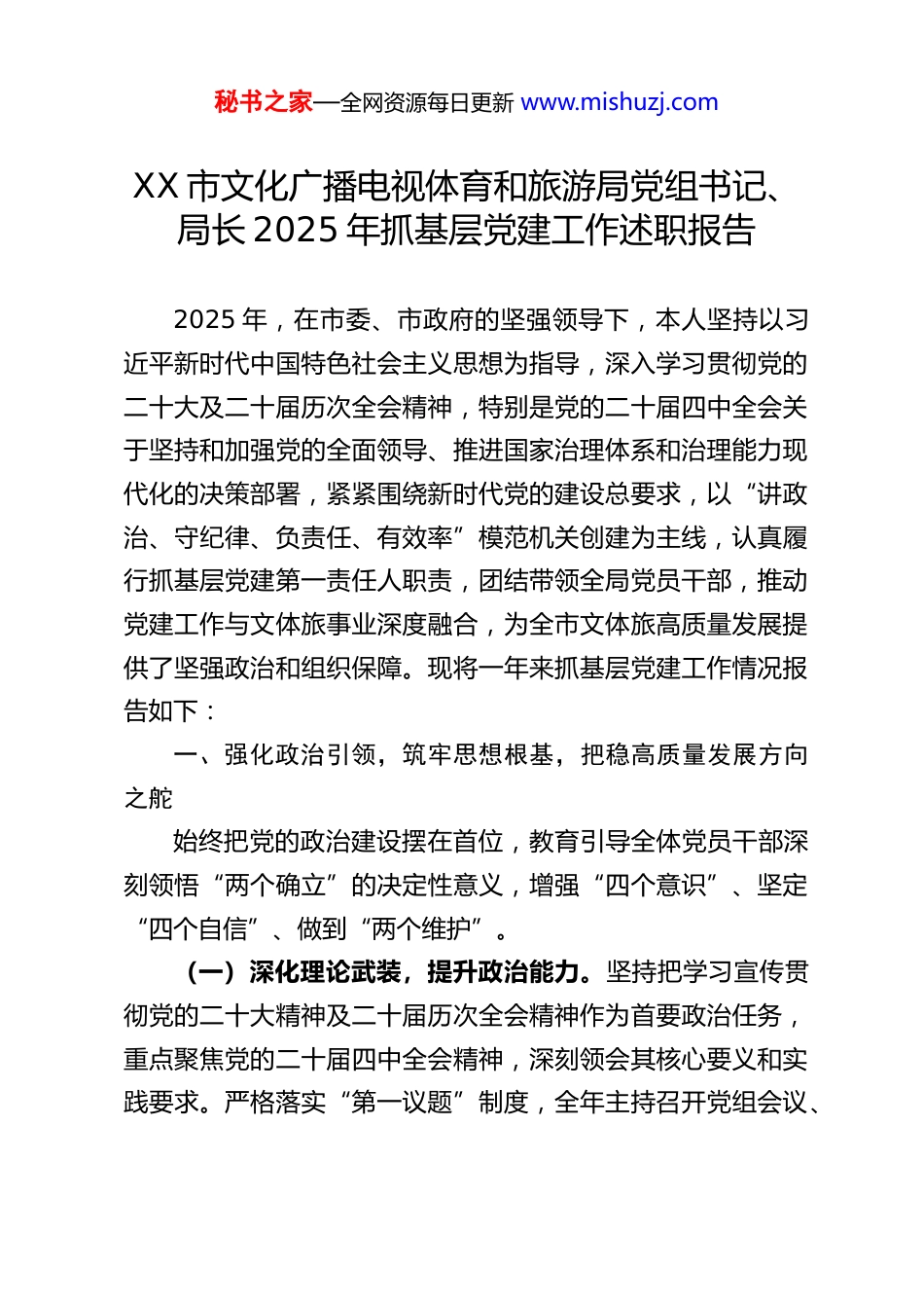 秘书之家—全网资源每日更新 www.mishuzj.comXX 市文化广播电视体育和旅游局党组书记、局长 2025 年抓基层党建工作述职报告2025 年,在市委、市政府的坚强领导下,本人坚持以习近平新时代中国特色社会主义思想为指导,深入学习贯彻党的二十大及二十届历次全会精神,特别是党的二十届四中全会关于坚持和加强党的全面领导、推进国家治理体系和治理能力现代化的决策部署,紧紧围绕新时代党的建设总要求,以“讲政治、守纪律、负责任、有效率”模范机关创建为主线,认真履行抓基层党建第一责任人职责,团结带领全局党员干部,推动党建工作与文体旅事业深度融合,为全市文体旅高质量发展提供了坚强政治和组织保障。现将一年来抓基层党建工作情况报告如下:一、强化政治引领,筑牢思想根基,把稳高质量发展方向之舵始终把党的政治建设摆在首位,教育引导全体党员干部深刻领悟“两个确立”的决定性意义,增强“四个意识”、坚定“四个自信”、做到“两个维护”。(一)深化理论武装,提升政治能力。坚持把学习宣传贯彻党的二十大精神及二十届历次全会精神作为首要政治任务,重点聚焦党的二十届四中全会精神,深刻领会其核心要义和实践要求。严格落实“第一议题”制度,全年主持召开党组会议、秘书之家—全网资源每日更新 www.mishuzj.com组织理论学习中心组学习 40 余次,其中专题学习党的二十大及二十届四中全会精神 20 余次。通过举办专题读书班、辅导报告会、研讨交流会等形式,引导班子成员和党员干部深刻把握党中央关于文化、体育、旅游工作的新部署新要求,不断提升政治判断力、政治领悟力、政治执行力。围绕贯彻落实省委、市委全会精神和“实业兴市”“引客入遂”重大战略,组织开展专题研讨 10 余场,切实把学习成果转化为谋划推动文体旅事业发展的思路举措。(二)严明政治纪律,确保政令畅通。坚决贯彻落实党中央各项决策部署和省委、市委工作要求,确保在文体旅系统不折不扣落地生根。严格执行民主集中制,修订完善局党组议事规则和决策程序,对“观音湖未来水世界”等重点项目策划、重大演艺赛事引进、桃花河遗址保护利用等重大事项,均严格执行调查研究、科学论证、集体决策程序,全年召开党组会研究“三重一大”事项 30 余项,班子合力与决策效能显著增强。旗帜鲜明反对和抵制各种错误思潮,教育引导党员干部在大是大非面前保持清醒头脑,始终同党中央保持高度一致。(三)突出政治担当,服务中心大局。坚持围绕中心抓党建、抓好党建促业务,将党建优势转化为发展动能。聚焦市委市政府中心工作,带领班子成员深入一线调研督导,牵头开展全局“效率革命行动”,以党建引领破解发展难题。全年梳理履职事项 783 项,编制优化流程图 69 套,推动行政审批服务秘书之家—全网资源每日更新 www.mishuzj.com全面提速。例如,导游证核发等 17 个事项办理时限累计减少77 天,效率提升 35%;旅行社业务经营许可证变更等 32 项审批流程累计减少环节 63 个,效率提升 32.6%,有力服务了营商环境优化和市场主体发展。在大型演艺赛事活动保障、重大项目建设攻坚中,班子成员靠前指挥,党员冲锋在前,全年实现重要节假日游客接待量较 2024 年明显增长,文体旅市场活力有效激发。二、夯实组织基础,建强战斗堡垒,推动党建与业务深度融合牢固树立大抓基层的鲜明导向,着力增强基层党组织政治功能和组织功能,推动基层党组织全面进步、全面过硬。(一)推进支部标准化规范化建设。扎实开展党支部“评星定级”工作,持续整顿提升软弱涣散党组织。严格落实“三会一课”、组织生活会、民主评议党员、主题党日等制度,提高组织生活质量。全年按程序发展党员 4 名,举办党务干部培训班 2 期,培训 10 余人次,基层党组织书记履职能力和党务工作者业务水平得到提升。深入推进“双报到”工作,组织全系统 240 名在职党员到社区报到服务,参与基层治理,密切党群干群关系。(二)推动党建业务同频共振。坚持党建工作与业务工作同谋划、同部署、同落实、同检查。围绕“引客入遂”、项目建设、招商引资等年度重点任务,广泛设立“党员先锋岗”秘书之家—全网资源...