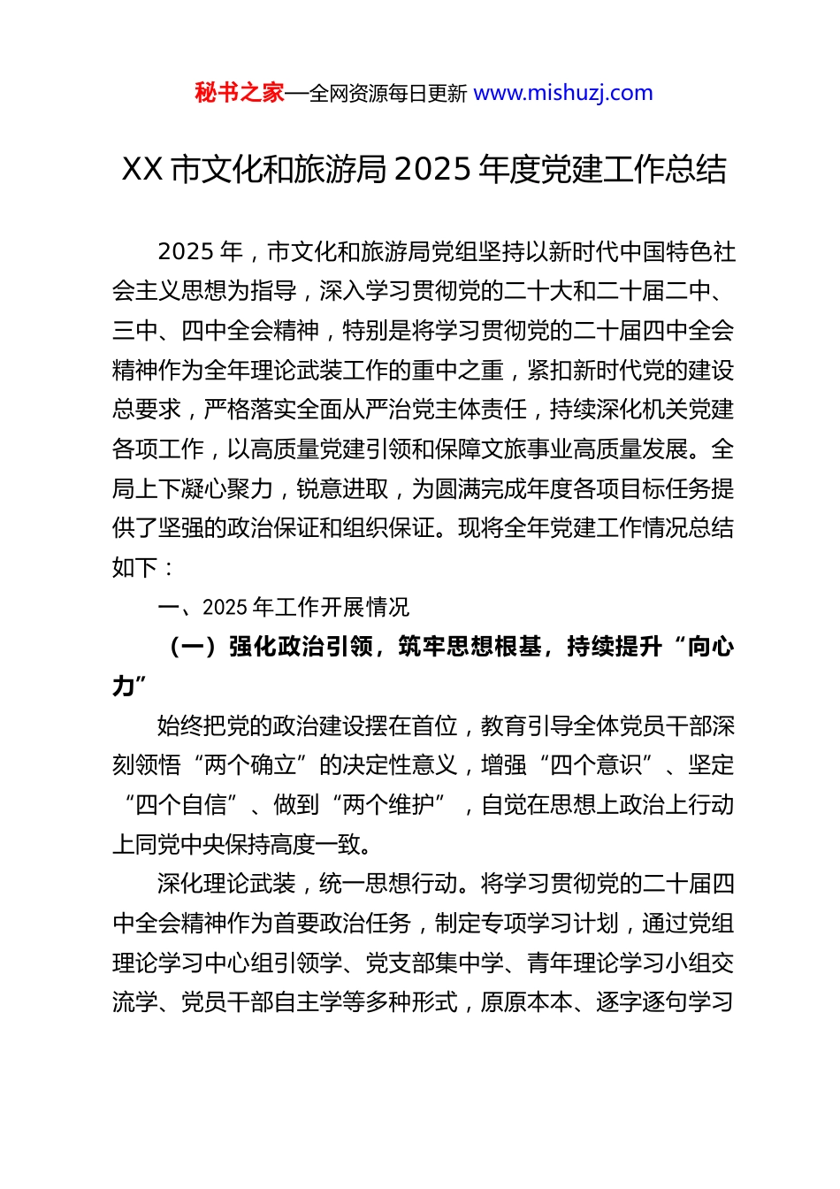 秘书之家—全网资源每日更新 www.mishuzj.comXX 市文化和旅游局 2025 年度党建工作总结2025 年,市文化和旅游局党组坚持以新时代中国特色社会主义思想为指导,深入学习贯彻党的二十大和二十届二中、三中、四中全会精神,特别是将学习贯彻党的二十届四中全会精神作为全年理论武装工作的重中之重,紧扣新时代党的建设总要求,严格落实全面从严治党主体责任,持续深化机关党建各项工作,以高质量党建引领和保障文旅事业高质量发展。全局上下凝心聚力,锐意进取,为圆满完成年度各项目标任务提供了坚强的政治保证和组织保证。现将全年党建工作情况总结如下:一、2025 年工作开展情况(一)强化政治引领,筑牢思想根基,持续提升“向心力”始终把党的政治建设摆在首位,教育引导全体党员干部深刻领悟“两个确立”的决定性意义,增强“四个意识”、坚定“四个自信”、做到“两个维护”,自觉在思想上政治上行动上同党中央保持高度一致。深化理论武装,统一思想行动。将学习贯彻党的二十届四中全会精神作为首要政治任务,制定专项学习计划,通过党组理论学习中心组引领学、党支部集中学、青年理论学习小组交流学、党员干部自主学等多种形式,原原本本、逐字逐句学习秘书之家—全网资源每日更新 www.mishuzj.com全会公报、决定等重要文件,深刻领会其核心要义、精神实质和实践要求。全年组织党组理论学习中心组学习 XX 次,其中专题研讨党的二十届四中全会精神 X 次。举办全市文旅系统学习贯彻党的二十届四中全会精神专题培训班、辅导报告会 X 场次,覆盖党员干部 XXX 余人次。结合文旅实际,开展“贯彻四中全会精神,推动文旅深度融合”等主题大讨论,将学习成果转化为谋划工作的思路、推动发展的举措。丰富学习载体,增强学习实效。持续深化学习型机关建设完善“理论导学、业务精学、交流互学、实践研学”机制。依托“文旅融合讲堂”,邀请专家学者解读党的创新理论、宏观政策及文旅前沿动态。创新学习形式,组织开展“赓续红色血脉强化使命担当”红色研学实践活动,将课堂搬到革命旧址、文博场馆;持续打造“XX 颂歌艺心向党”艺术党课品牌,用文艺形式讲述党的故事、传播党的声音;举办“永远的 XX 红”文艺展演,在艺术熏陶中淬炼党性。全年开展各类主题学习、实践活动 XX 余场。严守政治纪律,净化政治生态。严格执行新形势下党内政治生活若干准则,认真落实“三会一课”、民主生活会、组织生活会、民主评议党员等制度,增强党内政治生活的政治性、时代性、原则性、战斗性。加强意识形态阵地建设和管理,严格落实信息发布审核制度,确保文旅领域意识形态安全。(二)压实主体责任,健全制度机制,持续强化“执行秘书之家—全网资源每日更新 www.mishuzj.com力”牢固树立“抓好党建是最大政绩”的理念,健全完善明责履责、考责、问责闭环体系,推动全面从严治党主体责任落细落实。健全责任体系,层层传导压力。坚持和完善党组负总责、党组书记履行第一责任人职责、班子成员落实“一岗双责”、机关党委专职推进、党支部具体落实的“五级”责任体系。制定《2025 年度党建工作要点》和《全面从严治党主体责任清单》,将任务分解到岗、责任落实到人。严格执行“月提醒、季评比、年述职”机制,定期召开党建工作领导小组会议,分析研判形势,解决突出问题。全年召开党组会议研究全面从严治党及党建工作 15 次。强化督导考核,倒逼责任落实。扎实开展基层党组织书记抓党建工作述职评议考核,将评议结果与评先评优、干部使用挂钩。党组成员结合分工,定期深入联系点党支部调研指导、讲授党课、参加组织生活,全年累计开展督导 XX 次,讲授专题党课 X 次。规范开展廉政谈话和履职谈话,党组主要负责同志与其他班子成员、科室单位负责人开展谈话 XX 人次,确保责任压力直达“末梢”。狠抓制度执行,提升治理效能。对照党的二十届四中全会关于完善党的自我革命制度规范体系的要求,梳理完善局内相关党建制度,修订《党组议事规则》《“三重一大”决策实施秘书之家—全网资源每日更新 www.mishuzj.com细则》等,提升决策科学化、民主化、规范化水平。(三)夯实基...