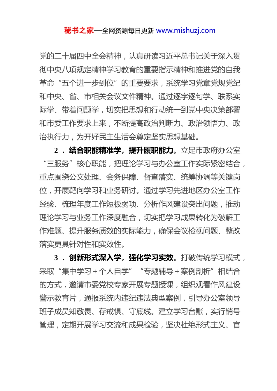 秘书之家—全网资源每日更新 www.mishuzj.com市 政 府 办 公 室 2025 年 度 民 主 生活 会 召 开 情 况 报 告按照市委统一部署和要求,市政府办公室紧扣民主生活会主题,精心组织筹备、扎实有序推进,于*年*月*日召开2025年度民主生活会。会议深入学习贯彻习近平新时代中国特色社会主义思想和党的二十届四中全会精神,聚焦落实中央八项规定精神、推进作风建设常态化长效化,严肃开展批评和自我批评,达到了统一思想、增进团结、改进工作、担当使命的目的。现将会议召开情况报告如下:一、精心谋篇布局,筑牢会议召开思想根基市政府办公室始终把高质量开好民主生活会作为重要政治任务,坚持早谋划、细部署、严落实,从理论武装、意见征集、谈心谈话、材料撰写四个维度扎实做好会前准备,为会议召开筑牢坚实基础。(一)深化理论武装,凝聚政治共识1 .聚焦主题系统学,筑牢思想堤坝。坚持把理论学习作为会前首要任务,紧扣会议主题制定专项学习计划,通过办公室党组理论学习中心组学习、党支部“三会一课”、专题研讨交流会等形式,深入学习习近平新时代中国特色社会主义思想、秘书之家—全网资源每日更新 www.mishuzj.com党的二十届四中全会精神,认真研读习近平总书记关于深入贯彻中央八项规定精神学习教育的重要指示精神和推进党的自我革命“五个进一步到位”的重要要求,系统学习党章党规党纪和中央、省、市相关会议文件精神。通过逐字逐句学、联系实际学、带着问题学,切实把思想和行动统一到党中央决策部署和市委工作要求上来,不断提高政治判断力、政治领悟力、政治执行力,为开好民主生活会奠定坚实思想基础。2 .结合职能精准学,提升履职能力。立足市政府办公室“三服务”核心职能,把理论学习与办公室工作实际紧密结合,重点围绕公文处理、会务保障、督查落实、统筹协调等关键岗位,开展靶向学习和业务研讨。通过学习先进地区办公室工作经验、梳理年度工作短板弱项、分析作风建设突出问题,推动理论学习与业务工作深度融合,切实把学习成果转化为破解工作难题、提升服务质效的实际能力,确保会议检视问题、整改落实更具针对性和实效性。3 .创新形式深入学,强化学习实效。打破传统学习模式,采取“集中学习+个人自学”“专题辅导+案例剖析”相结合的方式,邀请市委党校专家开展专题授课,组织观看作风建设警示教育片,通报系统内违纪违法典型案例,引导办公室领导班子成员知敬畏、存戒惧、守底线。建立学习台账,实行销号管理,定期开展学习交流和成果检验,坚决杜绝形式主义、官秘书之家—全网资源每日更新 www.mishuzj.com僚主义,确保理论学习入脑入心、走深走实,切实以理论清醒保证政治坚定。(二)广泛征求意见,汇聚群众智慧1 .拓宽渠道全面征,确保意见广泛。坚持开门纳谏,采取书面征求、座谈访谈、实地走访等多种形式,面向市直各部门、各县(市、区)政府办公室、办公室全体干部职工及服务对象,广泛征求对办公室领导班子及成员在思想作风、工作作风、廉洁自律、履职担当等方面的意见建议。通过设置意见箱、公布联系电话和邮箱,畅通意见征集渠道,确保不同层面、不同群体的声音都能充分表达、有效反映。2 .梳理分析精准筛,突出问题导向。对征集到的意见建议进行分类梳理、汇总分析,逐条甄别筛选、去粗取精,剔除模糊表述、聚焦具体问题,共梳理出理论学习、服务群众、工作落实、作风建设等方面意见建议*条。坚持把群众意见作为检视问题的重要依据,原汁原味反馈给领导班子及成员,引导大家对照反思、找准症结,为查摆问题、开展批评提供有力支撑。3 .对账认领主动改,夯实整改基础。针对征求到的意见建议,办公室领导班子及成员主动对账认领、提前研究整改思路,对能够立即整改的立行立改,对需要长期推进的制定阶段性目标和措施。通过把意见征集与整改落实前置衔接,切实把秘书之家—全网资源每日更新 www.mishuzj.com群众期盼融入民主生活会全过程,确保会议不走过场、取得实效,以实际行动回应群众关切。(三)深入谈心谈话,增进思想共识1 .坚持以上率下谈,压实主体责任。办公室党组书记带头与班子成员、各...