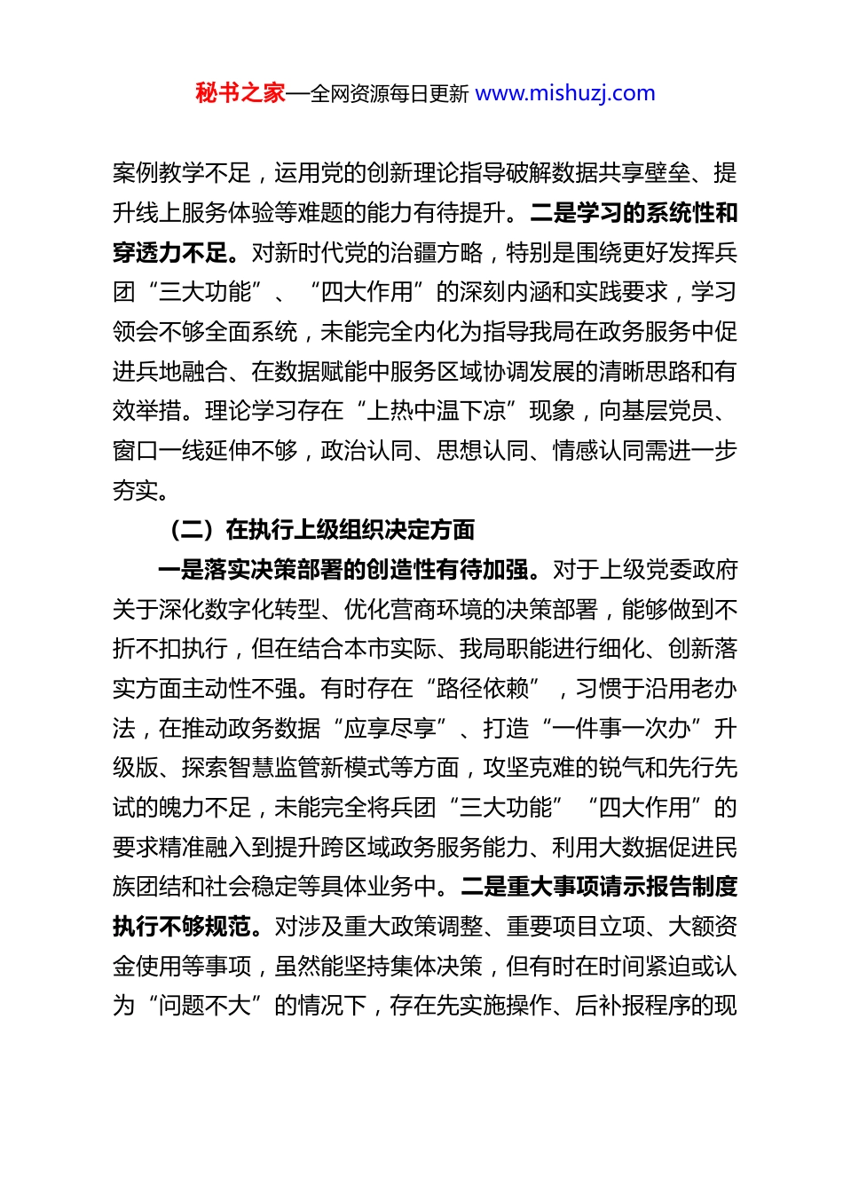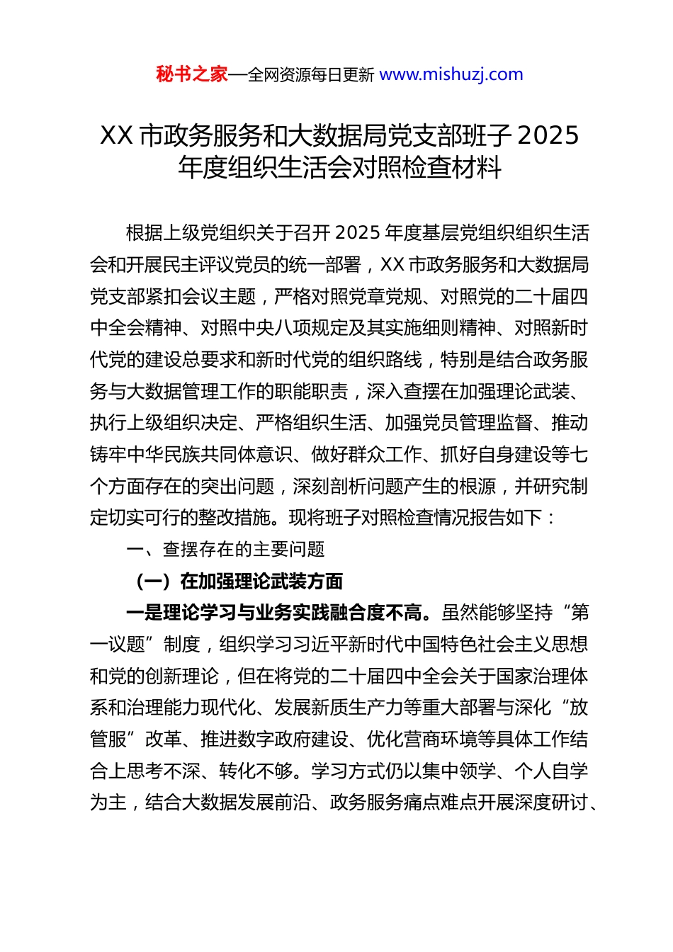 秘书之家—全网资源每日更新 www.mishuzj.comXX 市政务服务和大数据局党支部班子 2025年度组织生活会对照检查材料根据上级党组织关于召开 2025 年度基层党组织组织生活会和开展民主评议党员的统一部署,XX 市政务服务和大数据局党支部紧扣会议主题,严格对照党章党规、对照党的二十届四中全会精神、对照中央八项规定及其实施细则精神、对照新时代党的建设总要求和新时代党的组织路线,特别是结合政务服务与大数据管理工作的职能职责,深入查摆在加强理论武装、执行上级组织决定、严格组织生活、加强党员管理监督、推动铸牢中华民族共同体意识、做好群众工作、抓好自身建设等七个方面存在的突出问题,深刻剖析问题产生的根源,并研究制定切实可行的整改措施。现将班子对照检查情况报告如下:一、查摆存在的主要问题(一)在加强理论武装方面一是理论学习与业务实践融合度不高。虽然能够坚持“第一议题”制度,组织学习习近平新时代中国特色社会主义思想和党的创新理论,但在将党的二十届四中全会关于国家治理体系和治理能力现代化、发展新质生产力等重大部署与深化“放管服”改革、推进数字政府建设、优化营商环境等具体工作结合上思考不深、转化不够。学习方式仍以集中领学、个人自学为主,结合大数据发展前沿、政务服务痛点难点开展深度研讨、秘书之家—全网资源每日更新 www.mishuzj.com案例教学不足,运用党的创新理论指导破解数据共享壁垒、提升线上服务体验等难题的能力有待提升。二是学习的系统性和穿透力不足。对新时代党的治疆方略,特别是围绕更好发挥兵团“三大功能”、“四大作用”的深刻内涵和实践要求,学习领会不够全面系统,未能完全内化为指导我局在政务服务中促进兵地融合、在数据赋能中服务区域协调发展的清晰思路和有效举措。理论学习存在“上热中温下凉”现象,向基层党员、窗口一线延伸不够,政治认同、思想认同、情感认同需进一步夯实。(二)在执行上级组织决定方面一是落实决策部署的创造性有待加强。对于上级党委政府关于深化数字化转型、优化营商环境的决策部署,能够做到不折不扣执行,但在结合本市实际、我局职能进行细化、创新落实方面主动性不强。有时存在“路径依赖”,习惯于沿用老办法,在推动政务数据“应享尽享”、打造“一件事一次办”升级版、探索智慧监管新模式等方面,攻坚克难的锐气和先行先试的魄力不足,未能完全将兵团“三大功能”“四大作用”的要求精准融入到提升跨区域政务服务能力、利用大数据促进民族团结和社会稳定等具体业务中。二是重大事项请示报告制度执行不够规范。对涉及重大政策调整、重要项目立项、大额资金使用等事项,虽然能坚持集体决策,但有时在时间紧迫或认为“问题不大”的情况下,存在先实施操作、后补报程序的现秘书之家—全网资源每日更新 www.mishuzj.com象,程序意识、规矩意识需进一步强化。在推动落实过程中,对可能出现的风险预判不足,过程跟踪和效果评估有时不够及时到位。(三)在严格组织生活方面一是组织生活质量有待提升。“三会一课”、主题党日等活动虽然能够按期开展,但内容与政务服务、大数据中心工作结合不够紧密,吸引力、感染力不强。例如,主题党日活动有时偏重于理论学习或传统教育,结合“数字先锋”“服务标兵”评选、深入项目一线开展实践锻炼等形式不多。二是批评与自我批评“辣味”不足。在组织生活会上,班子成员之间、党员之间的批评多是以工作建议代替思想交锋,存在“你好我好大家好”的倾向,怕伤和气、怕影响团结,对深层次的思想问题、作风问题点到为止,缺乏“红脸出汗”的严肃性。谈心谈话制度落实有时流于形式,针对党员思想动态、工作生活中的实际困难进行深度沟通、有效疏导不够。(四)在加强党员管理监督方面一是党员教育管理精细化不够。对党员干部的日常监督管理多停留在工作纪律、廉洁自律等共性要求上,结合不同岗位(如窗口服务、技术研发、数据管理)特点进行差异化、精准化教育管理不足。对党员干部“八小时之外”的监督提醒相对薄弱,特别是对网络言行、社交活动的规范引导有待加强。民主评议党员有时偏重年终一次性评价,对党员在日常工作中的秘书...
