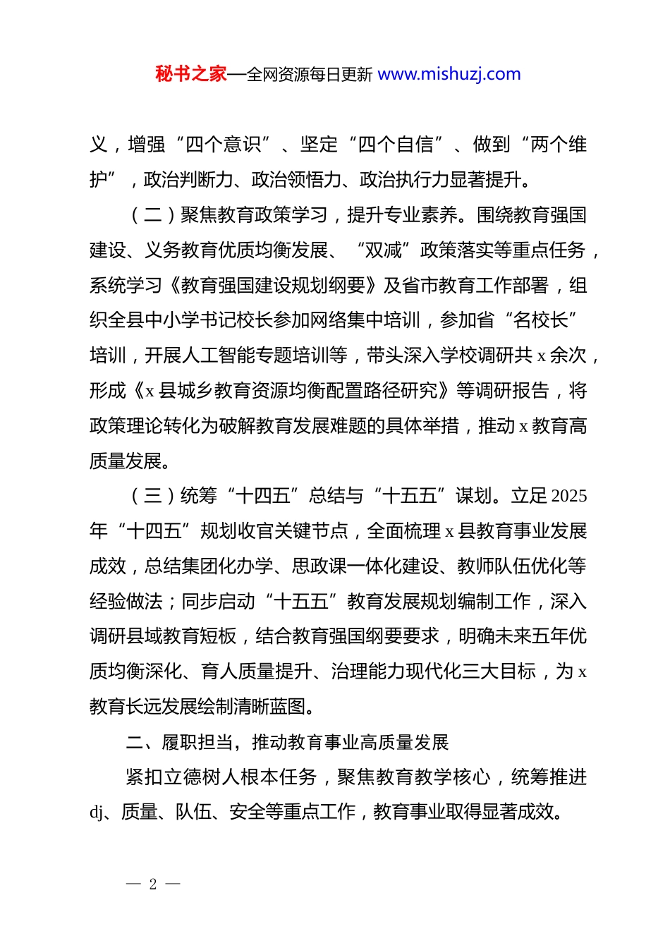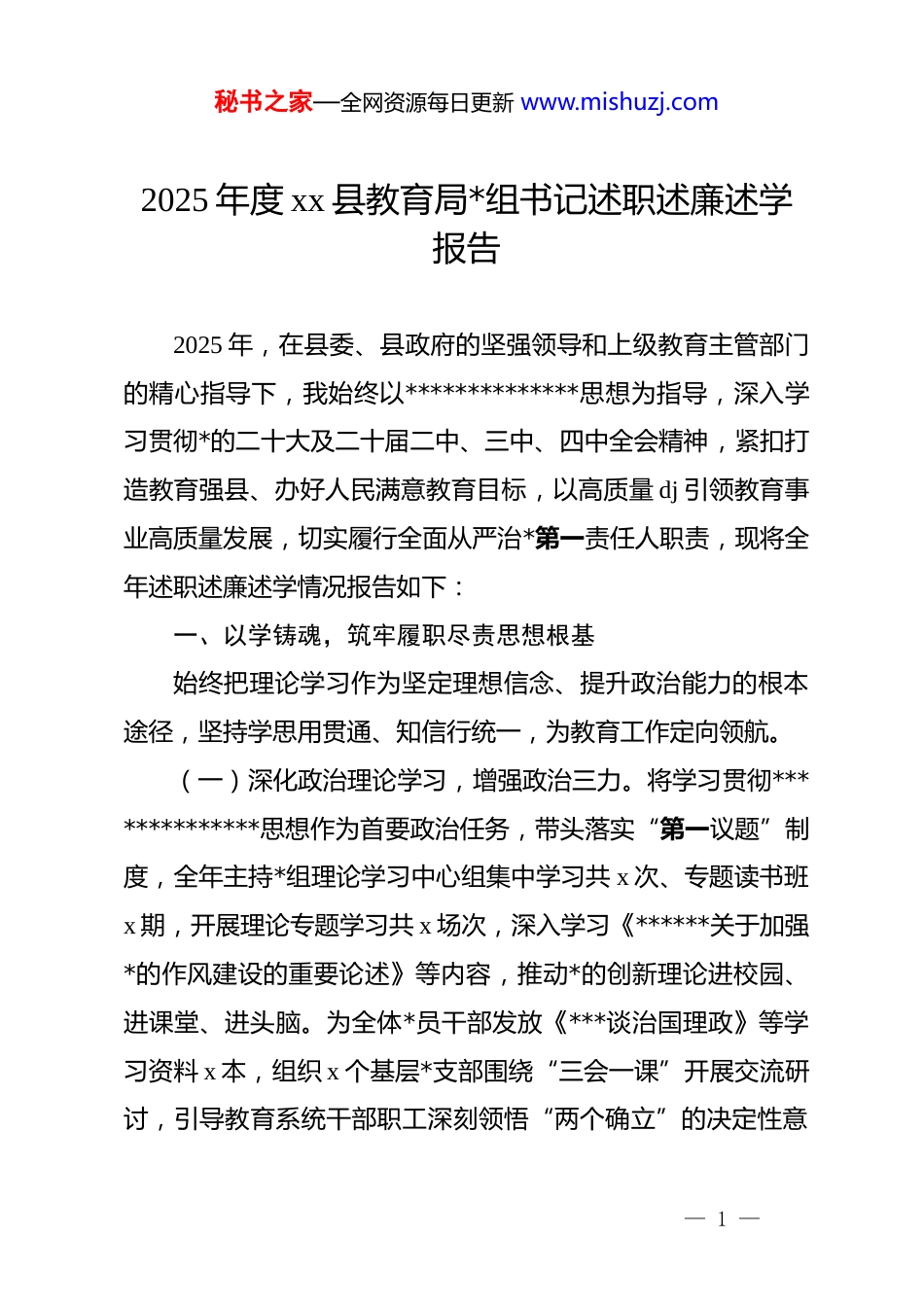 秘书之家—全网资源每日更新 www.mishuzj.com2025 年度 xx 县教育局*组书记述职述廉述学报告2025 年,在县委、县政府的坚强领导和上级教育主管部门的精心指导下,我始终以**************思想为指导,深入学习贯彻*的二十大及二十届二中、三中、四中全会精神,紧扣打造教育强县、办好人民满意教育目标,以高质量 dj 引领教育事业高质量发展,切实履行全面从严治*第一责任人职责,现将全年述职述廉述学情况报告如下:一、以学铸魂,筑牢履职尽责思想根基始终把理论学习作为坚定理想信念、提升政治能力的根本途径,坚持学思用贯通、知信行统一,为教育工作定向领航。(一)深化政治理论学习,增强政治三力。将学习贯彻**************思想作为首要政治任务,带头落实“第一议题”制度,全年主持*组理论学习中心组集中学习共 x 次、专题读书班x 期,开展理论专题学习共 x 场次,深入学习《******关于加强*的作风建设的重要论述》等内容,推动*的创新理论进校园、进课堂、进头脑。为全体*员干部发放《***谈治国理政》等学习资料 x 本,组织 x 个基层*支部围绕“三会一课”开展交流研讨,引导教育系统干部职工深刻领悟“两个确立”的决定性意— 1 —秘书之家—全网资源每日更新 www.mishuzj.com义,增强“四个意识”、坚定“四个自信”、做到“两个维护”,政治判断力、政治领悟力、政治执行力显著提升。(二)聚焦教育政策学习,提升专业素养。围绕教育强国建设、义务教育优质均衡发展、“双减”政策落实等重点任务,系统学习《教育强国建设规划纲要》及省市教育工作部署,组织全县中小学书记校长参加网络集中培训,参加省“名校长”培训,开展人工智能专题培训等,带头深入学校调研共 x 余次,形成《x 县城乡教育资源均衡配置路径研究》等调研报告,将政策理论转化为破解教育发展难题的具体举措,推动 x 教育高质量发展。(三)统筹“十四五”总结与“十五五”谋划。立足 2025年“十四五”规划收官关键节点,全面梳理 x 县教育事业发展成效,总结集团化办学、思政课一体化建设、教师队伍优化等经验做法;同步启动“十五五”教育发展规划编制工作,深入调研县域教育短板,结合教育强国纲要要求,明确未来五年优质均衡深化、育人质量提升、治理能力现代化三大目标,为 x教育长远发展绘制清晰蓝图。二、履职担当,推动教育事业高质量发展紧扣立德树人根本任务,聚焦教育教学核心,统筹推进dj、质量、队伍、安全等重点工作,教育事业取得显著成效。— 2 —秘书之家—全网资源每日更新 www.mishuzj.com(一)以 dj 为引领,夯实教育发展根基。建强组织堡垒。持续推进中小学校 dj 领航铸魂行动,实现公办中小学校每校必建、民办中小学校应建必建,对无*员的民办学校统一选派 dj指导员,健全*组织领导下的校长负责制。实施“dj 创新”工程,培育 x 小学、x 初中等 x 个省市级 dj 示范校。深化正风肃纪。牵头开展教育领域群众身边不正之风和腐败问题集中整治,聚焦校园餐、教辅资料、乱收费、校服等民生领域,延伸至校园食品安全、校企合作、减负、招生、师德失范等六个方面,查处违规违纪案件 x 起,*政纪处分 x 人,追缴违规资金 x 万元。召开以案促改警示教育会 x 次,组织观看警示教育片、通报典型案例,增强干部职工纪律意识;发现职能部门问题 x 个,已全部整改到位,移交纪委 x 个,dj 政务处分 x 人,净化教育生态。落实八项规定。严格执行纪律规定及其要求,带头反对形式主义、官僚主义,精简会议文件 15%,下基层调研轻车简从;规范公务接待、经费使用,严控“三公”经费支出,全年无超标准、超范围支出情况,推动作风建设常态化长效化。(二)以质量为核心,提升育人综合实效。推进优质均衡发展。实施城区学校扩优提质和农村薄弱学校改善,完成 x 所学校改扩建,新建 x 个高清标准化考场,组建 4 个集团化办学联合体,新成立县 x 等 x 个教育集团,新建续建中小学幼儿园 x— 3 —秘书之家—全网资源每日更新 www.mishuzj.com所,通过省义务教育优质均衡发展省级评估。深化教学改革。制定《中小学德育工作...