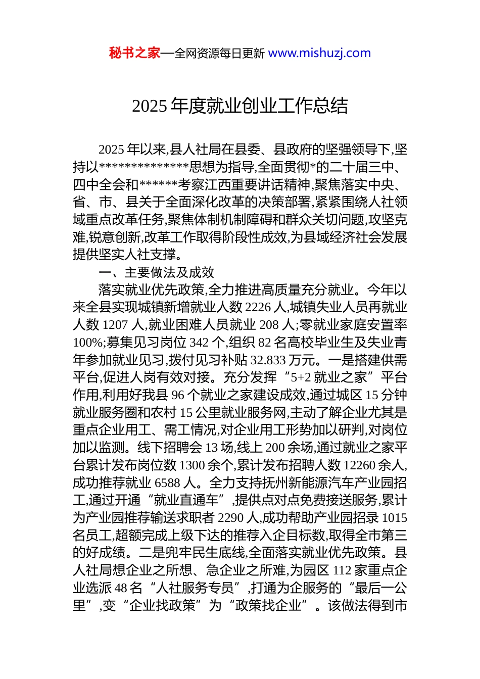 秘书之家—全网资源每日更新 www.mishuzj.com2025 年度就业创业工作总结2025 年以来,县人社局在县委、县政府的坚强领导下,坚持以**************思想为指导,全面贯彻*的二十届三中、四中全会和******考察江西重要讲话精神,聚焦落实中央、省、市、县关于全面深化改革的决策部署,紧紧围绕人社领域重点改革任务,聚焦体制机制障碍和群众关切问题,攻坚克难,锐意创新,改革工作取得阶段性成效,为县域经济社会发展提供坚实人社支撑。一、主要做法及成效落实就业优先政策,全力推进高质量充分就业。今年以来全县实现城镇新增就业人数 2226 人,城镇失业人员再就业人数 1207 人,就业困难人员就业 208 人;零就业家庭安置率100%;募集见习岗位 342 个,组织 82 名高校毕业生及失业青年参加就业见习,拨付见习补贴 32.833 万元。一是搭建供需平台,促进人岗有效对接。充分发挥“5+2 就业之家”平台作用,利用好我县 96 个就业之家建设成效,通过城区 15 分钟就业服务圈和农村 15 公里就业服务网,主动了解企业尤其是重点企业用工、需工情况,对企业用工形势加以研判,对岗位加以监测。线下招聘会 13 场,线上 200 余场,通过就业之家平台累计发布岗位数 1300 余个,累计发布招聘人数 12260 余人,成功推荐就业 6588 人。全力支持抚州新能源汽车产业园招工,通过开通“就业直通车”,提供点对点免费接送服务,累计为产业园推荐输送求职者 2290 人,成功帮助产业园招录 1015名员工,超额完成上级下达的推荐入企目标数,取得全市第三的好成绩。二是兜牢民生底线,全面落实就业优先政策。县人社局想企业之所想、急企业之所难,为园区 112 家重点企业选派 48 名“人社服务专员”,打通为企服务的“最后一公里”,变“企业找政策”为“政策找企业”。该做法得到市秘书之家—全网资源每日更新 www.mishuzj.com人社局的充分肯定,同时被省电视台都市现场频道作为我县优化营商环境典型经验做法进行报道。今年以来共为 381 家企业降费失业保险 189.09 万元;发放稳岗返还 207.89 万元,惠及企业 347 家 6713 人;发放失业保险金 244.5 万元,惠及失业人员 355 人;为招用 40 岁以上劳动力的 55 家园区企业 1596人发放社保补贴 207.12 万元。三是聚焦重点群体,夯实基础保障就业。加大就业见习政策支持,持续实施百万就业见习岗位募集计划,截至目前,我县共募集见习岗位 342 个,组织 82名高校毕业生及失业青年参加就业见习 ,拨付见习补贴32.833 万元。对省厅下发 722 离校未就业高校毕业生通过电话、微信、现场招聘、上门服务等方式进行“1131”就业帮扶,截止目前已帮扶就业 651 人,就业率 90.17%。积极开展高校毕业生基层就业补贴工作,已推送 22 名高校毕业生到专精特新企业就业,已发放相关补贴 24000 元。2025 年以来共安置农家书屋残疾人管理员 63 人、残疾人公益性岗位 28 人。累计开发城乡公益性岗位 572 个,其中安置脱贫劳动力 460人。四是激发创业活力,扶持创业带动就业。不断加大创业担保贷款扶持力度,优化办理流程,提速审批时效,促进创业带动就业,确保创贷政策落实落地。今年以来累计发放创业担保贷款 16845 万元,其中发放个人贷款 10105 万元,小微企业6740 万元,其中扶持高校毕业生 59 人,发放贷款 1421 万元,扶持返乡创业农民工 107 人,发放贷款 2365 万元,扶持复员转业退役军人 11 人,发放贷款 220 万元,共扶持创业人数 476 人,累计带动就业人数 3753 人。五是强化技能培训,提升技能促进就业。我县立足“提技能、促就业”,紧盯市场需要、群众需求、企业需求,以强化技能培训为抓手,积极搭建技能培训平台,受到广泛关注,并在 2025 年全市人社工作会议上作经验交流发言。2025 度累计开展培训 23 期 779 人次,其中就业技能培训 4 期 98 人,创业培训 7 期 138 人,企业职工岗位技能培训 12 期 543 人。返乡就业帮扶 288 人,实现就业 203 人。二、存在的问题秘书之家—全网资源每日更新 www.mishuzj.com就业结构性矛盾依然突出。一方面,随着产业升级,对高素质、高技能人才需求旺盛,但我县技能人才培养体...