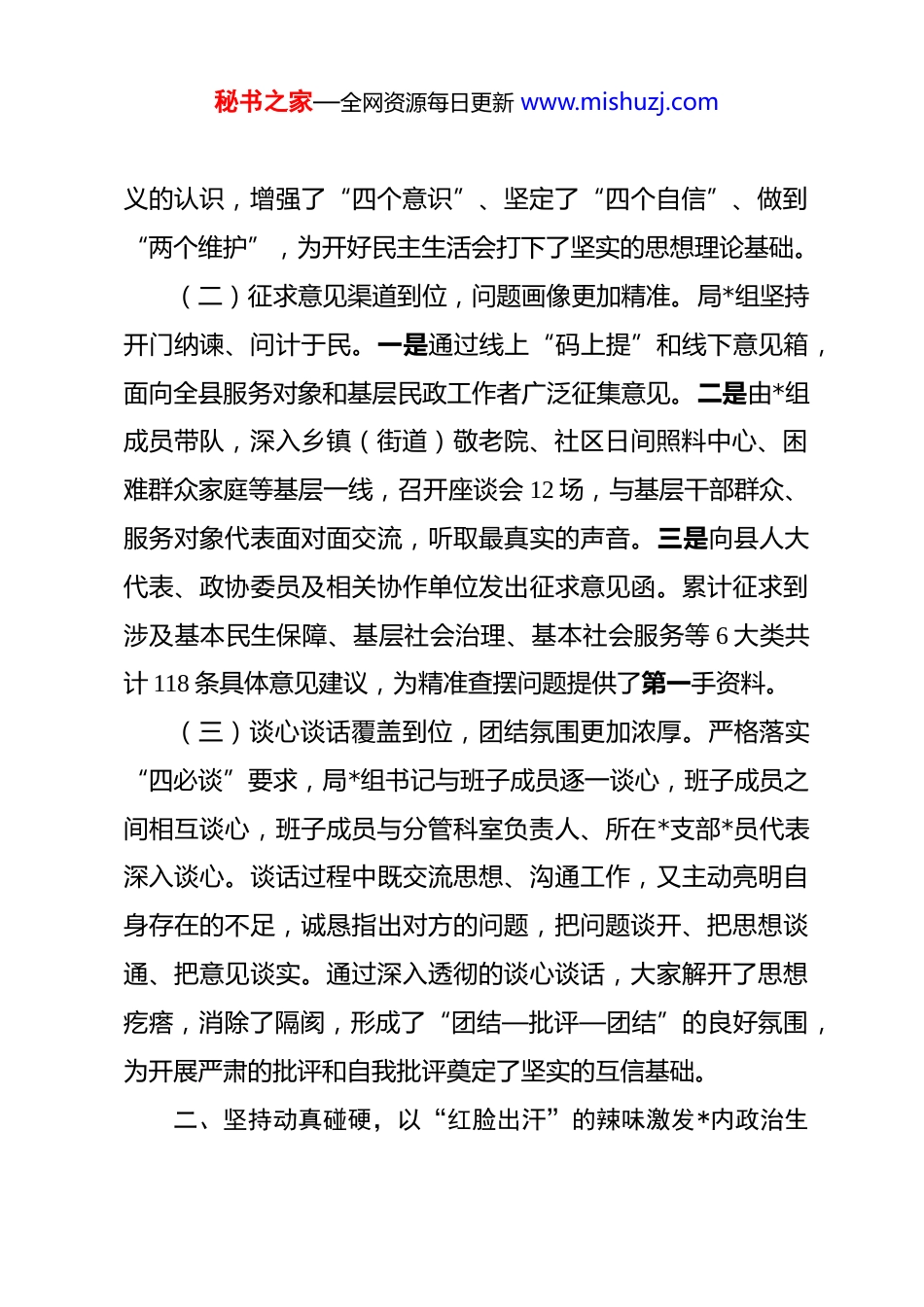 秘书之家—全网资源每日更新 www.mishuzj.com(17 篇)2025 年度民主生活会召开情况总结报告汇编局*组 2025 年度民主生活会召开情况的总结报告根据县委统一部署,县局*组于 2026 年 1 月 x 日召开了2025 年度民主生活会。会议紧紧围绕主题,严肃认真开展批评和自我批评,达到了统一思想、深化认识、增进团结、推动工作的预期目的。现将有关情况报告如下:一、精心谋划部署,以“三个到位”筑牢会议高质量召开的思想根基局*组始终将开好本次民主生活会作为一项重大政治任务,坚持高标准、严要求,扎实细致做好各项准备工作,确保会议开出高质量、新气象。(一)理论学习武装到位,思想根基更加牢固。会前,局*组采取集体研学与个人自学相结合的方式,组织*组成员原原本本、逐字逐句学习贯彻**************思想、*的二十大报告以及二十届四中全会公报等重要文件精神。特别是围绕******关于民政工作“三个聚焦”的重要论述和对深化改革、完善社会治理体系作出的系列****,开展了为期三天的专题学习研讨。通过深学细悟,*组成员进一步深化了对“两个确立”决定性意秘书之家—全网资源每日更新 www.mishuzj.com义的认识,增强了“四个意识”、坚定了“四个自信”、做到“两个维护”,为开好民主生活会打下了坚实的思想理论基础。(二)征求意见渠道到位,问题画像更加精准。局*组坚持开门纳谏、问计于民。一是通过线上“码上提”和线下意见箱,面向全县服务对象和基层民政工作者广泛征集意见。二是由*组成员带队,深入乡镇(街道)敬老院、社区日间照料中心、困难群众家庭等基层一线,召开座谈会 12 场,与基层干部群众、服务对象代表面对面交流,听取最真实的声音。三是向县人大代表、政协委员及相关协作单位发出征求意见函。累计征求到涉及基本民生保障、基层社会治理、基本社会服务等 6 大类共计 118 条具体意见建议,为精准查摆问题提供了第一手资料。(三)谈心谈话覆盖到位,团结氛围更加浓厚。严格落实“四必谈”要求,局*组书记与班子成员逐一谈心,班子成员之间相互谈心,班子成员与分管科室负责人、所在*支部*员代表深入谈心。谈话过程中既交流思想、沟通工作,又主动亮明自身存在的不足,诚恳指出对方的问题,把问题谈开、把思想谈通、把意见谈实。通过深入透彻的谈心谈话,大家解开了思想疙瘩,消除了隔阂,形成了“团结—批评—团结”的良好氛围,为开展严肃的批评和自我批评奠定了坚实的互信基础。二、坚持动真碰硬,以“红脸出汗”的辣味激发*内政治生秘书之家—全网资源每日更新 www.mishuzj.com活的新活力会上,*组书记首先代表局*组班子作对照检查,并带头进行个人对照检查发言,主动接受各位同志的批评。随后,其他*组成员逐一进行对照检查,严肃开展批评和自我批评。整个会议过程严肃紧张、辣味十足,真正做到了“揭短亮丑见思想、红脸出汗促团结”。一是自我批评勇于“解剖麻雀”。每位*组成员都本着对*、对事业、对同志、对自己高度负责的态度,把自己摆进去、把职责摆进去、把工作摆进去。大家不穿靴戴帽、不遮掩回避,紧密联系个人思想、工作、生活和作风实际,从世界观、人生观、价值观的深层次挖掘问题根源,深刻剖析了自身在政治站位、担当作为、服务群众、廉洁自律等方面存在的差距和不足,体现了刀刃向内的勇气和自我革命的决心。二是相互批评敢于“真刀真枪”。班子成员之间本着“知无不言、言无不尽”的原则,开门见山、直截了当,提出的批评意见既有“火药味”,更有“同志情”。批评内容不搞“你好我好大家好”的一团和气,而是聚焦具体问题、具体事例,点人点事点细节。例如,有同志对主要领导提出“对智慧养老等前沿领域的探索性投入和系统性谋划略显不足”;有同志对分管社会救助的班子成员提出“在推动‘物质+服务’救助模秘书之家—全网资源每日更新 www.mishuzj.com式上,创新举措不多,服务类项目落地偏慢”。全场共提出相互批评意见 52 条,真正起到了“排毒治病”、共同提高的效果。三是整改表态实于“落地砸坑”。对于查摆出的问题和相互批评的意见,每位*组成员都作出了明确具体的表态。大家一致认为,查摆问题只是...