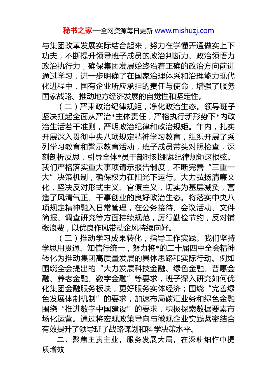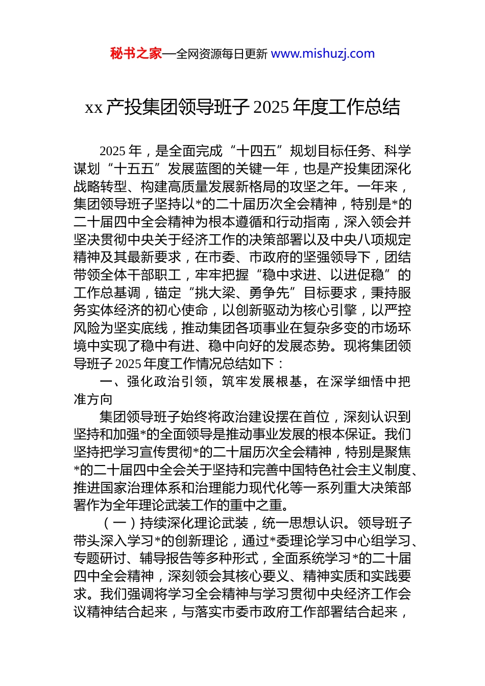 秘书之家—全网资源每日更新 www.mishuzj.comxx 产投集团领导班子 2025 年度工作总结2025 年,是全面完成“十四五”规划目标任务、科学谋划“十五五”发展蓝图的关键一年,也是产投集团深化战略转型、构建高质量发展新格局的攻坚之年。一年来,集团领导班子坚持以*的二十届历次全会精神,特别是*的二十届四中全会精神为根本遵循和行动指南,深入领会并坚决贯彻中央关于经济工作的决策部署以及中央八项规定精神及其最新要求,在市委、市政府的坚强领导下,团结带领全体干部职工,牢牢把握“稳中求进、以进促稳”的工作总基调,锚定“挑大梁、勇争先”目标要求,秉持服务实体经济的初心使命,以创新驱动为核心引擎,以严控风险为坚实底线,推动集团各项事业在复杂多变的市场环境中实现了稳中有进、稳中向好的发展态势。现将集团领导班子 2025 年度工作情况总结如下:一、强化政治引领,筑牢发展根基,在深学细悟中把准方向集团领导班子始终将政治建设摆在首位,深刻认识到坚持和加强*的全面领导是推动事业发展的根本保证。我们坚持把学习宣传贯彻*的二十届历次全会精神,特别是聚焦*的二十届四中全会关于坚持和完善中国特色社会主义制度、推进国家治理体系和治理能力现代化等一系列重大决策部署作为全年理论武装工作的重中之重。(一)持续深化理论武装,统一思想认识。领导班子带头深入学习*的创新理论,通过*委理论学习中心组学习、专题研讨、辅导报告等多种形式,全面系统学习*的二十届四中全会精神,深刻领会其核心要义、精神实质和实践要求。我们强调将学习全会精神与学习贯彻中央经济工作会议精神结合起来,与落实市委市政府工作部署结合起来,秘书之家—全网资源每日更新 www.mishuzj.com与集团改革发展实际结合起来,努力在学懂弄通做实上下功夫,不断提升领导班子成员的政治判断力、政治领悟力政治执行力,确保集团发展始终沿着正确的政治方向前进通过学习,进一步明确了在国家治理体系和治理能力现代化进程中,国有企业所应承担的责任与使命,增强了服务国家战略、推动地方经济发展的自觉性和坚定性。(二)严肃政治纪律规矩,净化政治生态。领导班子坚决扛起全面从严治*主体责任,严格执行新形势下*内政治生活若干准则,严明政治纪律和政治规矩。年内,扎实开展深入贯彻中央八项规定精神学习教育,组织开展了系列学习教育和警示教育活动,班子成员带头对照检查,深刻剖析反思,引导全体*员干部时刻绷紧纪律规矩这根弦。我们严格落实重大事项请示报告制度,不断完善“三重一大”决策机制,确保权力在阳光下运行。大力弘扬清廉文化,坚决反对形式主义、官僚主义,切实为基层减负,营造了风清气正、干事创业的良好政治生态。将落实中央八项规定精神融入日常管理,在公务接待、会议活动、文件简报、调查研究等方面持续规范,厉行勤俭节约,反对铺张浪费,以优良作风带动企风持续向好。(三)推动学习成果转化,指导工作实践。我们坚持学思用贯通、知信行统一,努力将*的二十届四中全会精神转化为推动集团高质量发展的具体思路和实际行动。例如围绕全会提出的“大力发展科技金融、绿色金融、普惠金融、养老金融、数字金融”等要求,班子深入研究如何优化集团金融服务板块,更好服务实体经济;围绕“完善绿色发展体制机制”的要求,加速布局碳汇业务和绿色金融围绕“推进数字中国建设”的要求,积极探索数据要素市场化运营。通过将宏观政策导向与微观企业实践紧密结合有效提升了领导班子战略谋划和科学决策水平。二、聚焦主责主业,服务发展大局,在深耕细作中提质增效秘书之家—全网资源每日更新 www.mishuzj.com集团领导班子紧紧围绕“产业投资、金融服务、资产运营”三大主业定位,坚持有所为、有所不为,持续推动资源向主业集中,力量向主业汇聚,努力在服务地方经济社会发展中体现担当、展现作为。(一)明确战略方向,优化主业结构。面对深刻变化的经济环境、行业趋势和监管要求,班子组织力量进行了深入研判,进一步明晰了集团发展战略和主业边界。经过科学论证,明确了一级主业 3 项,二级主业 9 项,为集团未来资源整合和业务拓展提供了清晰指引。这一定...