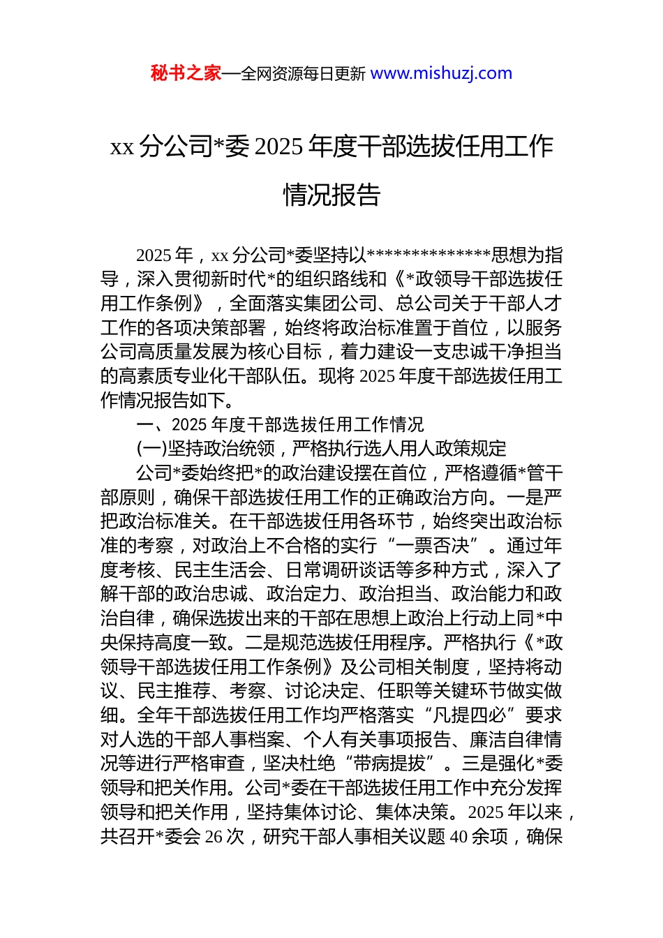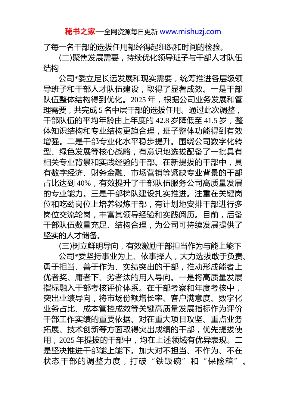 秘书之家—全网资源每日更新 www.mishuzj.comxx 分公司*委 2025 年度干部选拔任用工作情况报告2025 年,xx 分公司*委坚持以**************思想为指导,深入贯彻新时代*的组织路线和《*政领导干部选拔任用工作条例》,全面落实集团公司、总公司关于干部人才工作的各项决策部署,始终将政治标准置于首位,以服务公司高质量发展为核心目标,着力建设一支忠诚干净担当的高素质专业化干部队伍。现将 2025 年度干部选拔任用工作情况报告如下。一、2025 年度干部选拔任用工作情况(一)坚持政治统领,严格执行选人用人政策规定公司*委始终把*的政治建设摆在首位,严格遵循*管干部原则,确保干部选拔任用工作的正确政治方向。一是严把政治标准关。在干部选拔任用各环节,始终突出政治标准的考察,对政治上不合格的实行“一票否决”。通过年度考核、民主生活会、日常调研谈话等多种方式,深入了解干部的政治忠诚、政治定力、政治担当、政治能力和政治自律,确保选拔出来的干部在思想上政治上行动上同*中央保持高度一致。二是规范选拔任用程序。严格执行《*政领导干部选拔任用工作条例》及公司相关制度,坚持将动议、民主推荐、考察、讨论决定、任职等关键环节做实做细。全年干部选拔任用工作均严格落实“凡提四必”要求对人选的干部人事档案、个人有关事项报告、廉洁自律情况等进行严格审查,坚决杜绝“带病提拔”。三是强化*委领导和把关作用。公司*委在干部选拔任用工作中充分发挥领导和把关作用,坚持集体讨论、集体决策。2025 年以来,共召开*委会 26 次,研究干部人事相关议题 40 余项,确保秘书之家—全网资源每日更新 www.mishuzj.com了每一名干部的选拔任用都经得起组织和时间的检验。(二)聚焦发展需要,持续优化领导班子与干部人才队伍结构公司*委立足长远发展和现实需要,统筹推进各层级领导班子和干部人才队伍建设,取得了显著成效。一是干部队伍整体结构得到优化。2025 年,根据公司业务发展和管理需要,共完成 5 名中层干部的选拔任用。通过此次调整,干部队伍的平均年龄由上年度的 42.8 岁降低至 41.5 岁,整体知识结构和专业结构更趋合理,班子整体功能得到有效增强。二是干部专业化水平稳步提升。围绕公司数字化转型、绿色发展等核心战略,有意识地选拔配备了一批具有相关专业背景和实践经验的干部。在新提拔的干部中,具有数字经济、财务金融、市场营销等紧缺专业背景的干部占比达到 40%,有效提升了干部队伍服务公司高质量发展的专业能力。三是干部梯队建设扎实推进。注重在关键岗位和吃劲岗位上培养锻炼干部,有计划地安排干部进行多岗位交流轮岗,丰富其领导经验和实践阅历。目前,后备干部队伍数量充足、结构合理,为公司可持续发展提供了坚实的人才储备。(三)树立鲜明导向,有效激励干部担当作为与能上能下公司*委坚持事业为上、依事择人,大力选拔敢于负责、勇于担当、善于作为、实绩突出的干部,推动形成能者上优者奖、庸者下、劣者汰的用人导向。一是将高质量发展指标融入干部考核评价体系。在干部考察和年度考核中,突出业绩导向,将市场份额增长率、客户满意度、数字化业务占比、成本管控成效等关键高质量发展指标作为评价干部工作实绩的重要依据。对在重大项目攻坚、重点业务拓展、技术创新等方面取得突出成绩的干部,优先提拔使用,2025 年提拔的干部中,均在上述领域有优异表现。二是坚决推进干部能上能下。加大对不担当、不作为、不在状态干部的调整力度,打破“铁饭碗”和“保险箱”。秘书之家—全网资源每日更新 www.mishuzj.com2025 年,对 1 名因工作推动不力、业绩长期不佳的中层干部进行了免职处理,调整至非领导岗位,在干部队伍中引起了强烈反响,有效激发了全体干部的危机感和奋斗精神三是强化正向激励。对工作实绩突出、群众公认度高的干部,不仅在政治上大胆使用,还在职级待遇、评优评先等方面予以倾斜,营造了崇尚实干、鼓励担当的浓厚氛围。(四)着力破除壁垒,加快优秀年轻干部培养选拔公司*委高度重视年轻干部工作,将其视为关系公司未来的战略性工程,采取有力措施打破“隐形台阶”,为优秀年轻干部脱颖而出创造...