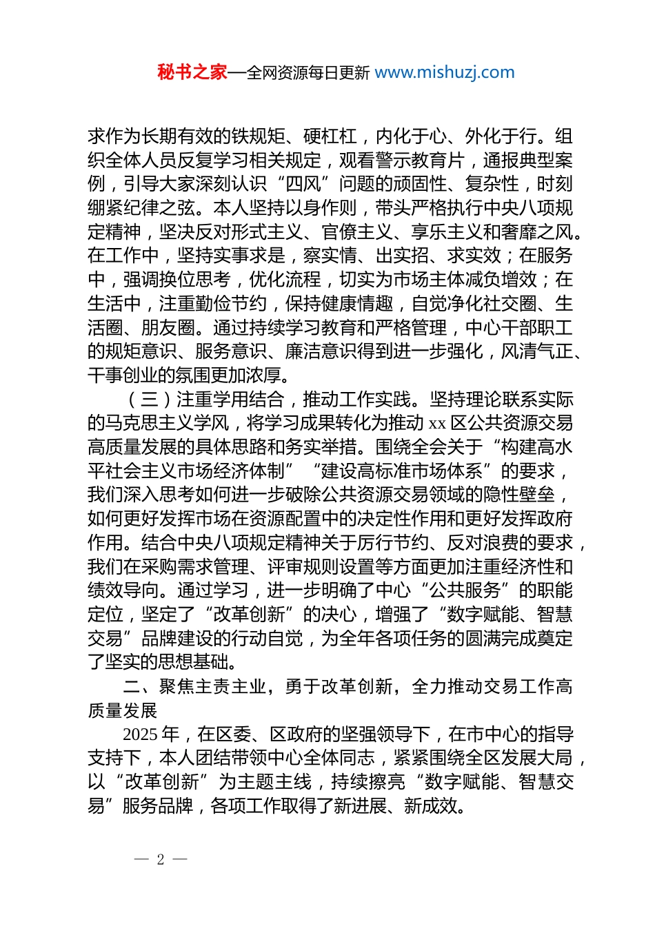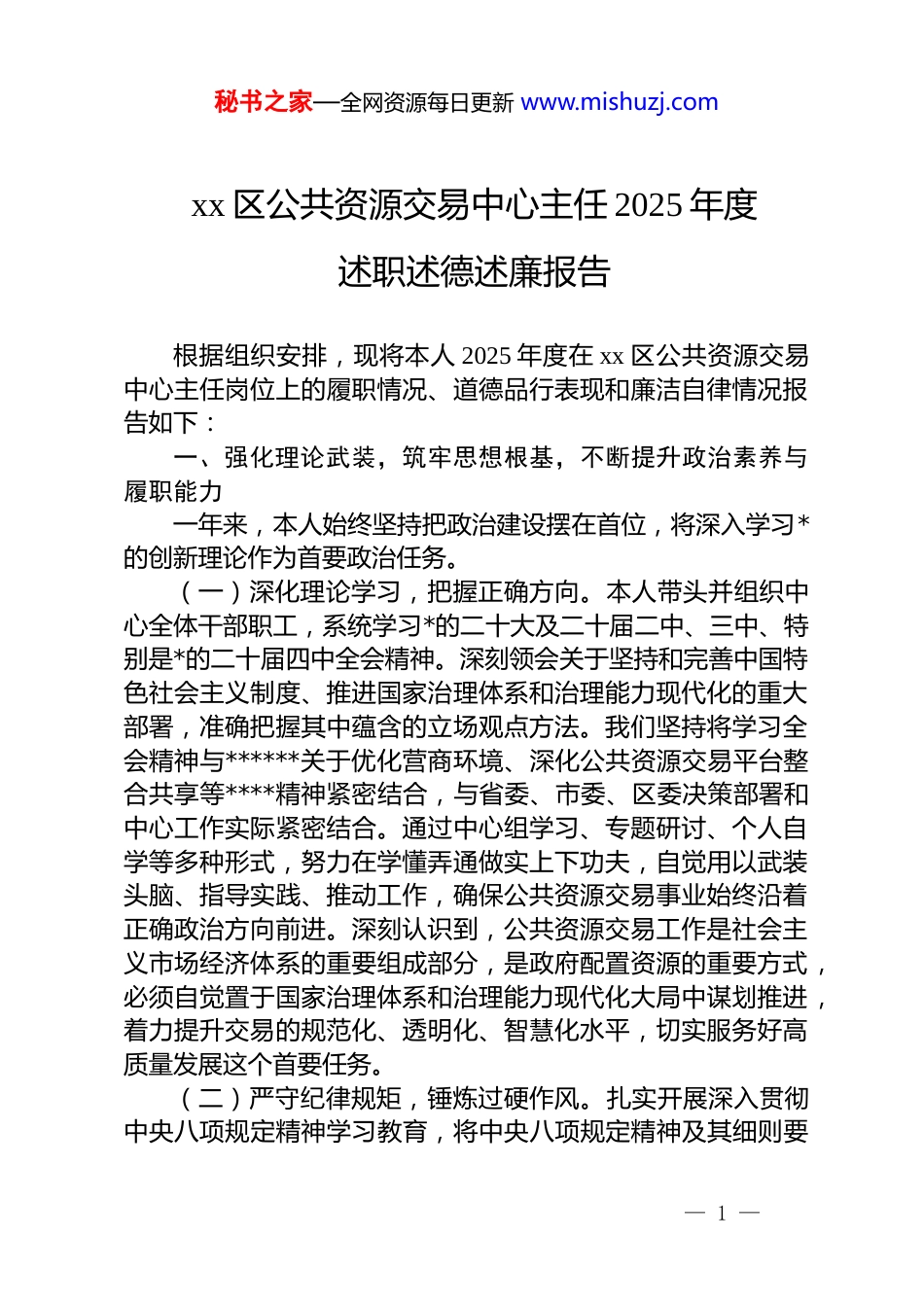 秘书之家—全网资源每日更新 www.mishuzj.comxx 区公共资源交易中心主任 2025 年度述职述德述廉报告根据组织安排,现将本人 2025 年度在 xx 区公共资源交易中心主任岗位上的履职情况、道德品行表现和廉洁自律情况报告如下:一、强化理论武装,筑牢思想根基,不断提升政治素养与履职能力一年来,本人始终坚持把政治建设摆在首位,将深入学习*的创新理论作为首要政治任务。(一)深化理论学习,把握正确方向。本人带头并组织中心全体干部职工,系统学习*的二十大及二十届二中、三中、特别是*的二十届四中全会精神。深刻领会关于坚持和完善中国特色社会主义制度、推进国家治理体系和治理能力现代化的重大部署,准确把握其中蕴含的立场观点方法。我们坚持将学习全会精神与******关于优化营商环境、深化公共资源交易平台整合共享等****精神紧密结合,与省委、市委、区委决策部署和中心工作实际紧密结合。通过中心组学习、专题研讨、个人自学等多种形式,努力在学懂弄通做实上下功夫,自觉用以武装头脑、指导实践、推动工作,确保公共资源交易事业始终沿着正确政治方向前进。深刻认识到,公共资源交易工作是社会主义市场经济体系的重要组成部分,是政府配置资源的重要方式,必须自觉置于国家治理体系和治理能力现代化大局中谋划推进,着力提升交易的规范化、透明化、智慧化水平,切实服务好高质量发展这个首要任务。(二)严守纪律规矩,锤炼过硬作风。扎实开展深入贯彻中央八项规定精神学习教育,将中央八项规定精神及其细则要— 1 —秘书之家—全网资源每日更新 www.mishuzj.com求作为长期有效的铁规矩、硬杠杠,内化于心、外化于行。组织全体人员反复学习相关规定,观看警示教育片,通报典型案例,引导大家深刻认识“四风”问题的顽固性、复杂性,时刻绷紧纪律之弦。本人坚持以身作则,带头严格执行中央八项规定精神,坚决反对形式主义、官僚主义、享乐主义和奢靡之风。在工作中,坚持实事求是,察实情、出实招、求实效;在服务中,强调换位思考,优化流程,切实为市场主体减负增效;在生活中,注重勤俭节约,保持健康情趣,自觉净化社交圈、生活圈、朋友圈。通过持续学习教育和严格管理,中心干部职工的规矩意识、服务意识、廉洁意识得到进一步强化,风清气正、干事创业的氛围更加浓厚。(三)注重学用结合,推动工作实践。坚持理论联系实际的马克思主义学风,将学习成果转化为推动 xx 区公共资源交易高质量发展的具体思路和务实举措。围绕全会关于“构建高水平社会主义市场经济体制”“建设高标准市场体系”的要求,我们深入思考如何进一步破除公共资源交易领域的隐性壁垒,如何更好发挥市场在资源配置中的决定性作用和更好发挥政府作用。结合中央八项规定精神关于厉行节约、反对浪费的要求,我们在采购需求管理、评审规则设置等方面更加注重经济性和绩效导向。通过学习,进一步明确了中心“公共服务”的职能定位,坚定了“改革创新”的决心,增强了“数字赋能、智慧交易”品牌建设的行动自觉,为全年各项任务的圆满完成奠定了坚实的思想基础。二、聚焦主责主业,勇于改革创新,全力推动交易工作高质量发展2025 年,在区委、区政府的坚强领导下,在市中心的指导支持下,本人团结带领中心全体同志,紧紧围绕全区发展大局,以“改革创新”为主题主线,持续擦亮“数字赋能、智慧交易”服务品牌,各项工作取得了新进展、新成效。— 2 —秘书之家—全网资源每日更新 www.mishuzj.com(一)交易规模与效率实现新跨越。我们始终将提升公共资源配置效率和效益作为核心目标。全年共组织完成各类公共资源交易活动 93 项,实现交易总额 76.3 亿元,较 2024 年实现346%的大幅增长,创历史新高。交易结构持续优化,涵盖政府采购(47 项)、建设工程(24 项)、水利工程(7 项)、交通工程(1 项)、综合采购(2 项)、综合工程(6 项)、医疗设备采购(5 项)以及远程异地评标(1 项)等多个领域。这一成绩的取得,既反映了全区经济社会发展的活力,也体现了交易平台服务保障能力的提升。我们通过优化流程、压缩时限、精细化管理,努力让每一宗交易都能在规范的前...
