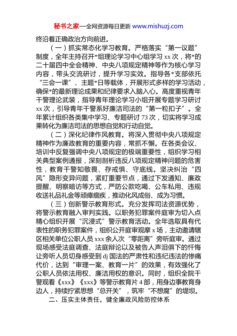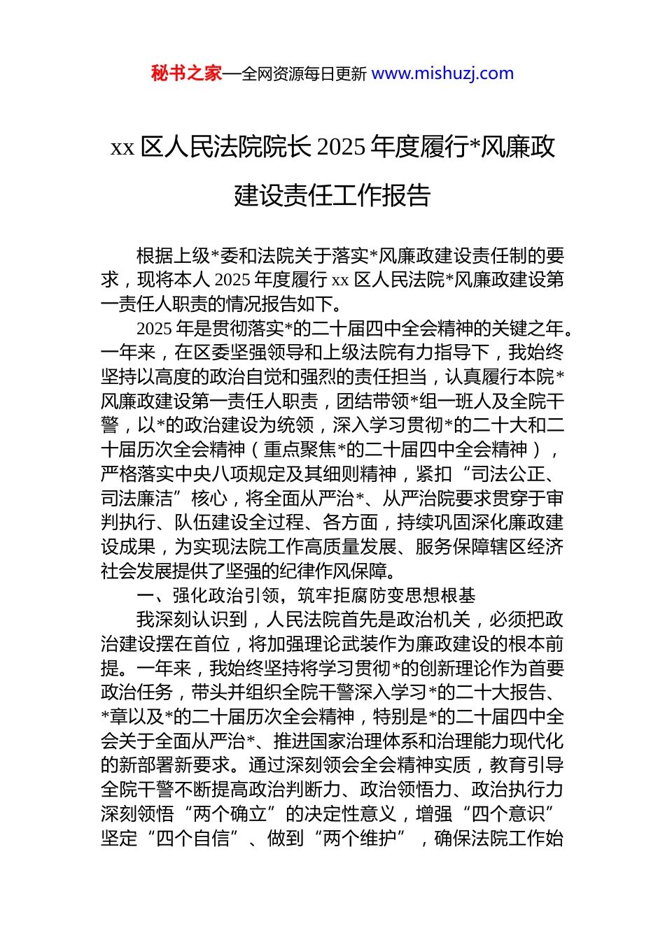 秘书之家—全网资源每日更新 www.mishuzj.comxx 区人民法院院长 2025 年度履行*风廉政建设责任工作报告根据上级*委和法院关于落实*风廉政建设责任制的要求,现将本人 2025 年度履行 xx 区人民法院*风廉政建设第一责任人职责的情况报告如下。2025 年是贯彻落实*的二十届四中全会精神的关键之年。一年来,在区委坚强领导和上级法院有力指导下,我始终坚持以高度的政治自觉和强烈的责任担当,认真履行本院*风廉政建设第一责任人职责,团结带领*组一班人及全院干警,以*的政治建设为统领,深入学习贯彻*的二十大和二十届历次全会精神(重点聚焦*的二十届四中全会精神),严格落实中央八项规定及其细则精神,紧扣“司法公正、司法廉洁”核心,将全面从严治*、从严治院要求贯穿于审判执行、队伍建设全过程、各方面,持续巩固深化廉政建设成果,为实现法院工作高质量发展、服务保障辖区经济社会发展提供了坚强的纪律作风保障。一、强化政治引领,筑牢拒腐防变思想根基我深刻认识到,人民法院首先是政治机关,必须把政治建设摆在首位,将加强理论武装作为廉政建设的根本前提。一年来,我始终坚持将学习贯彻*的创新理论作为首要政治任务,带头并组织全院干警深入学习*的二十大报告、*章以及*的二十届历次全会精神,特别是*的二十届四中全会关于全面从严治*、推进国家治理体系和治理能力现代化的新部署新要求。通过深刻领会全会精神实质,教育引导全院干警不断提高政治判断力、政治领悟力、政治执行力深刻领悟“两个确立”的决定性意义,增强“四个意识”坚定“四个自信”、做到“两个维护”,确保法院工作始秘书之家—全网资源每日更新 www.mishuzj.com终沿着正确政治方向前进。(一)抓实常态化学习教育。严格落实“第一议题”制度,全年主持召开*组理论学习中心组学习 xx 次,将*的二十届四中全会精神、中央八项规定精神等作为核心学习内容,带头交流研讨,提升学习实效。指导各*支部依托“三会一课”、主题*日等载体,开展形式多样的学习活动,确保*的最新理论成果和纪律要求入脑入心。高度重视青年干警理论武装,指导青年理论学习小组开展专题学习研讨xx 次,引导青年干警系好廉洁司法的“第一粒扣子”。全年累计组织各类集中学习、专题研讨 73 次,切实将学习成果转化为廉洁司法的思想自觉和行动自觉。(二)深化纪律作风教育。将深入贯彻中央八项规定精神作为廉政教育的重要内容,常抓不懈。在各类会议、培训中反复强调中央八项规定的极端重要性,组织学习相关典型案例通报,深刻剖析违反八项规定精神问题的危害性,教育干警知敬畏、存戒惧、守底线。坚决纠治“四风”隐形变异问题,紧盯重要节点,通过下发通知、廉政提醒、明察暗访等方式,严防公款吃喝、公车私用、违规收送礼品礼金等顽瘴痼疾,推动化风成俗、成为习惯。(三)创新警示教育形式。充分发挥司法资源优势,将警示教育融入审判实践。以职务犯罪案件庭审为切入点精心组织开展“沉浸式”警示教育活动。全年选取具有代表性的职务犯罪案件,组织公开庭审观摩 x 场,主动邀请辖区相关单位公职人员 xxx 余人次“零距离”旁听庭审。通过现场感受法庭调查、法庭辩论以及被告人声泪俱下的忏悔让旁听人员切身感受到 dj 国法的严肃性和违纪违法的惨痛代价,达到“审理一案、教育一片”的效果,有效强化了公职人员依法用权、廉洁用权的意识。同时,组织全院干警观看《xxx》《xxx》等警示教育片 4 部,用身边事教育身边人,持续拧紧思想“总开关”,筑牢“不想腐”的堤坝。二、压实主体责任,健全廉政风险防控体系秘书之家—全网资源每日更新 www.mishuzj.com作为*组书记、院长,我坚决扛起*风廉政建设主体责任,坚持把*风廉政建设与审判执行工作同部署、同落实、同检查、同考核,着力构建权责清晰、流程规范、风险明确、措施有力的廉政风险防控机制。(一)健全责任落实机制。年初主持召开*风廉政建设和反腐败工作会议,全面部署年度任务,逐级签订《*风廉政建设责任书》,将压力传导至每位班子成员、各部门负责人和全体干警。坚持定期听取*风廉政建设工作汇报,全年主持召开*组专题研究*风廉政建设工作会议...