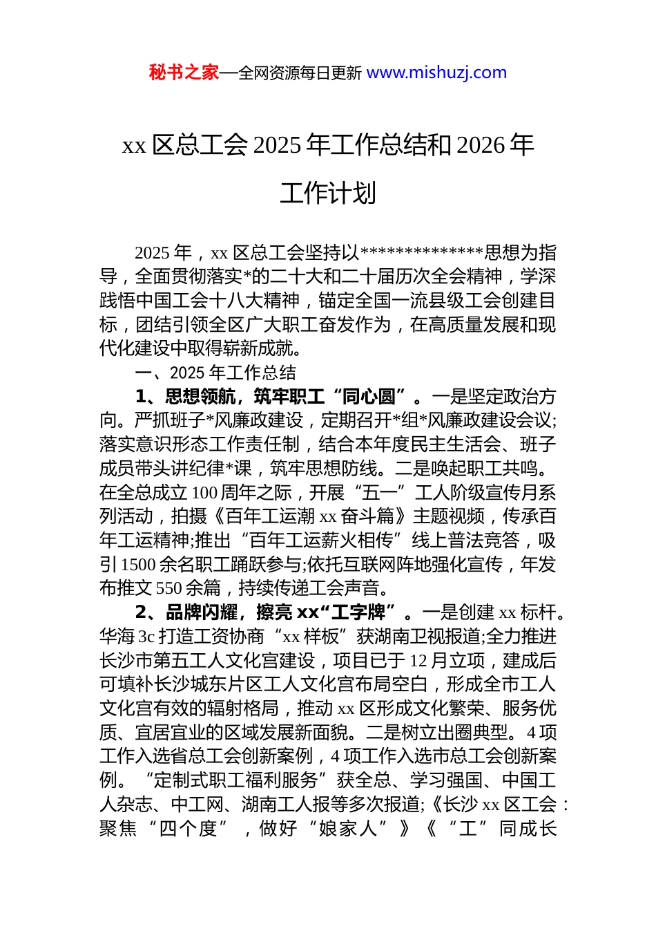 秘书之家—全网资源每日更新 www.mishuzj.comxx 区总工会 2025 年工作总结和 2026 年工作计划2025 年,xx 区总工会坚持以**************思想为指导,全面贯彻落实*的二十大和二十届历次全会精神,学深践悟中国工会十八大精神,锚定全国一流县级工会创建目标,团结引领全区广大职工奋发作为,在高质量发展和现代化建设中取得崭新成就。一、2025 年工作总结1、思想领航,筑牢职工“同心圆”。一是坚定政治方向。严抓班子*风廉政建设,定期召开*组*风廉政建设会议;落实意识形态工作责任制,结合本年度民主生活会、班子成员带头讲纪律*课,筑牢思想防线。二是唤起职工共鸣。在全总成立 100 周年之际,开展“五一”工人阶级宣传月系列活动,拍摄《百年工运潮 xx 奋斗篇》主题视频,传承百年工运精神;推出“百年工运薪火相传”线上普法竞答,吸引 1500 余名职工踊跃参与;依托互联网阵地强化宣传,年发布推文 550 余篇,持续传递工会声音。2、品牌闪耀,擦亮 xx“工字牌”。一是创建 xx 标杆。华海 3c 打造工资协商“xx 样板”获湖南卫视报道;全力推进长沙市第五工人文化宫建设,项目已于 12 月立项,建成后可填补长沙城东片区工人文化宫布局空白,形成全市工人文化宫有效的辐射格局,推动 xx 区形成文化繁荣、服务优质、宜居宜业的区域发展新面貌。二是树立出圈典型。4 项工作入选省总工会创新案例,4 项工作入选市总工会创新案例。“定制式职工福利服务”获全总、学习强国、中国工人杂志、中工网、湖南工人报等多次报道;《长沙 xx 区工会:聚焦“四个度”,做好“娘家人”》《“工”同成长秘书之家—全网资源每日更新 www.mishuzj.com“会”聚幸福——我且“工”身耕耘,不负 xx 一片春》分别被工人日报、湖南工人报报道。3、赋能发展,当好经济“助推器”。一是抓好“二赛一训”。在全市率先举办 deepseek 政务培训、ai 创新大赛和新质生产力大数据应用大赛,推动人工智能在职工群体中的普及;承办全市“星城杯”标准化大赛,加速培育新时代产业工匠。二是优化营商环境。组织工会主席直播“云”带岗吸引超 2000 人次观看;创新打造“一券通兑+定制服务”职工福利推荐平台,惠及职工 4 万名,拉动消费超1 亿元;落实工会经费返还 xx 万元,开展工会促消费活动,发放消费券 xx 万元、向中小微企业促消费补助 xx 万元;建立 35 条春秋游路线和 61 类福利物资目录,探索工会服务经济新路径。4、服务升温,做好职工“娘家人”。一是保障职工权益。帮扶慰问职工超 3000 人次,金额达 xx 万元,同时实施帮扶档案属地动态管理,建立帮扶长效机制;组织 4.1 万职工参与医疗互助、2.1 万女职工参与女职工特殊疾病保障。调解劳动争议案件数 20 件,涉及金额 xx 万元。开展安全宣传“进企业”活动 50 余场,积极配合参与辖区安全生产事故组开展调查。二是提质职工生活。3 家企业挂牌市级职工服务基地与幸福企业;建成“工会驿站”4 家,其中省级规范化驿站 1 家;组织马拉松、气排球、羽毛球、篮球、阅读活动等多项职工文体活动,2500 余名职工乐在其中。5、组织扎根,凝聚新兴“奋斗者”。一是组织精准覆盖。累计建成“兜底建”新就业形态工会组织 16 个,吸纳会员 8968 人;重点推进“12+7”平台建会,完成上海京东到家长沙分公司走访调研并召开会员代表大会;以兜底建为原则培育新就业形态建会入会案例 3 个,助力规范新业态用工秩序、凝聚新就业群体力量。二是加强队伍培育。举办工会干部履职能力提升培训班,提升工会干部综合素质,切实履行“忠诚*的事业、竭诚服务职工”的使命担当。秘书之家—全网资源每日更新 www.mishuzj.com二、2026 年工作计划1、突出政治引领,凝聚思想共识。持续开展“工人阶级宣传月”活动,策划“劳动创造幸福”等专题活动,通过线上线下相结合的方式,扩大宣传覆盖面。持续丰富工会思政工作形式和内容,深入基层宣讲,弘扬劳模精神、劳动精神、工匠精神。2、厚植 xx 底蕴,打造文化矩阵。持续打造“xx 工运杯”文体活动品牌,动员职工参与市级大型文体活动,展现 xx 职工良好精神风貌...