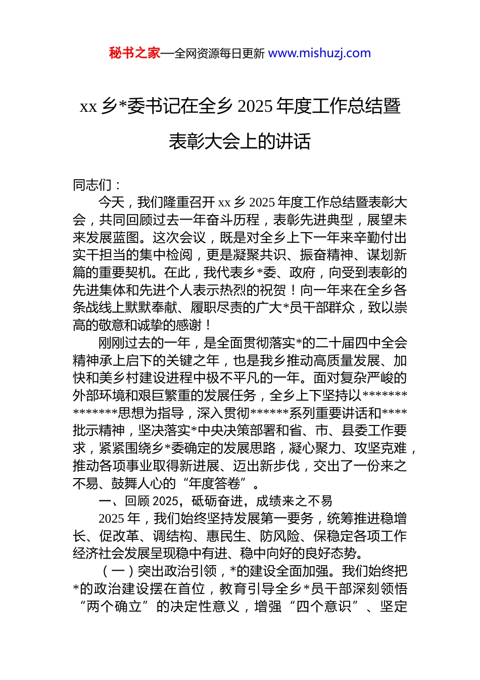 秘书之家—全网资源每日更新 www.mishuzj.comxx 乡*委书记在全乡 2025 年度工作总结暨表彰大会上的讲话同志们:今天,我们隆重召开 xx 乡 2025 年度工作总结暨表彰大会,共同回顾过去一年奋斗历程,表彰先进典型,展望未来发展蓝图。这次会议,既是对全乡上下一年来辛勤付出实干担当的集中检阅,更是凝聚共识、振奋精神、谋划新篇的重要契机。在此,我代表乡*委、政府,向受到表彰的先进集体和先进个人表示热烈的祝贺!向一年来在全乡各条战线上默默奉献、履职尽责的广大*员干部群众,致以崇高的敬意和诚挚的感谢!刚刚过去的一年,是全面贯彻落实*的二十届四中全会精神承上启下的关键之年,也是我乡推动高质量发展、加快和美乡村建设进程中极不平凡的一年。面对复杂严峻的外部环境和艰巨繁重的发展任务,全乡上下坚持以**************思想为指导,深入贯彻******系列重要讲话和****批示精神,坚决落实*中央决策部署和省、市、县委工作要求,紧紧围绕乡*委确定的发展思路,凝心聚力、攻坚克难,推动各项事业取得新进展、迈出新步伐,交出了一份来之不易、鼓舞人心的“年度答卷”。一、回顾 2025,砥砺奋进,成绩来之不易2025 年,我们始终坚持发展第一要务,统筹推进稳增长、促改革、调结构、惠民生、防风险、保稳定各项工作经济社会发展呈现稳中有进、稳中向好的良好态势。(一)突出政治引领,*的建设全面加强。我们始终把*的政治建设摆在首位,教育引导全乡*员干部深刻领悟“两个确立”的决定性意义,增强“四个意识”、坚定秘书之家—全网资源每日更新 www.mishuzj.com“四个自信”、做到“两个维护”。一是理论学习持续深化。坚持把学习贯彻**************思想作为首要政治任务,通过*委理论学习中心组学习、“三会一课”、主题*日、专题培训等多种形式,深入学习*的二十大精神及历次全会精神,学习******关于“三农”工作、乡村振兴、生态文明建设等重要论述和对青海工作的重大要求,推动*的创新理论入脑入心、指导实践。二是政治生态持续净化。坚决扛起全面从严治*主体责任,把严的主基调长期坚持下去。特别需要强调的是,我们将深入贯彻中央八项规定及其实施细则精神作为重要政治任务常抓不懈。一年来,我们组织全乡*员干部扎实开展深入贯彻中央八项规定精神学习教育,通过召开警示教育大会、观看专题片、学习典型案例通报、开展廉政谈话等多种形式,引导*员干部深刻认识“四风”问题的顽固性、反复性,锲而不舍落实中央八项规定精神,坚决防止形式主义、官僚主义滋生蔓延。我们健全完善了公务接待、公务用车、办公用房、会议活动等方面管理制度,扎紧制度笼子。乡领导班子成员带头严格执行,自觉接受监督,带动全乡干部作风持续向好。通过一系列扎实举措,广大*员干部的纪律意识、规矩意识进一步增强,崇尚实干、狠抓落实的氛围更加浓厚,为全乡各项事业发展提供了坚强的纪律和作风保障。三是基层基础持续夯实。深入推进*支部标准化规范化建设,扎实开展“乡土先锋”创建活动,选优配强村“两委”班子,充分发挥驻村工作队作用,基层*组织战斗堡垒作用和*员先锋模范作用在乡村振兴、基层治理一线得到有效发挥。(二)聚焦发展要务,经济实力稳步提升。我们紧扣“优化农业结构稳乡,提升乡村旅游活乡,扩大劳务输出富乡,狠抓项目建设强乡、守牢生态资源美乡”工作思路推动经济社会持续健康发展。一是现代农业提质增效。稳步推进农业产业结构调整,特色种植、生态养殖规模持续扩大,农产品品质和效益稳步提升。二是乡村旅游活力显秘书之家—全网资源每日更新 www.mishuzj.com现。深入挖掘乡土文化、生态资源,完善旅游基础设施,打造特色旅游节点,乡村旅游知名度、吸引力逐步增强。三是劳务经济成效显著。加强技能培训和就业服务,有序组织劳务输出,群众工资性收入稳步增长。四是项目建设扎实推进。积极争取和实施了一批基础设施、产业发展、民生改善类项目,发展后劲不断积蓄。(三)践行为民宗旨,民生福祉持续改善。始终坚持以人民为中心的发展思想,用心用情用力解决好群众急难愁盼问题。社会保障体系更加健全,教育、医疗、文化等公共服务水平稳步提升...