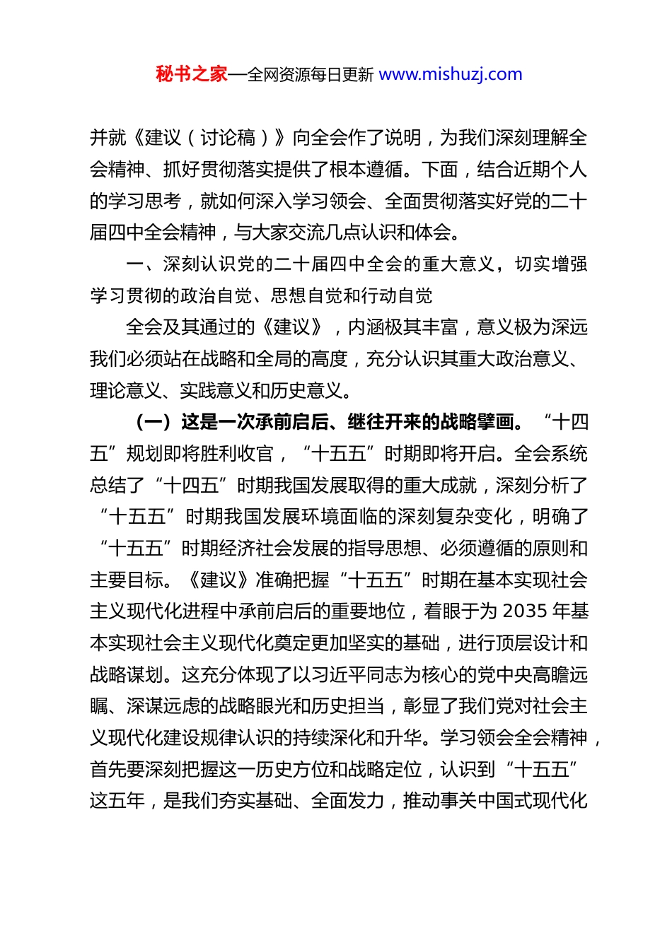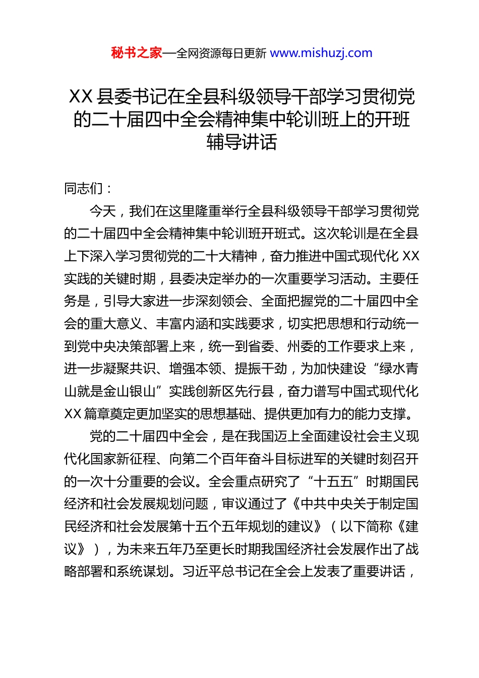 秘书之家—全网资源每日更新 www.mishuzj.comXX 县委书记在全县科级领导干部学习贯彻党的二十届四中全会精神集中轮训班上的开班辅导讲话同志们:今天,我们在这里隆重举行全县科级领导干部学习贯彻党的二十届四中全会精神集中轮训班开班式。这次轮训是在全县上下深入学习贯彻党的二十大精神,奋力推进中国式现代化 XX实践的关键时期,县委决定举办的一次重要学习活动。主要任务是,引导大家进一步深刻领会、全面把握党的二十届四中全会的重大意义、丰富内涵和实践要求,切实把思想和行动统一到党中央决策部署上来,统一到省委、州委的工作要求上来,进一步凝聚共识、增强本领、提振干劲,为加快建设“绿水青山就是金山银山”实践创新区先行县,奋力谱写中国式现代化XX 篇章奠定更加坚实的思想基础、提供更加有力的能力支撑。党的二十届四中全会,是在我国迈上全面建设社会主义现代化国家新征程、向第二个百年奋斗目标进军的关键时刻召开的一次十分重要的会议。全会重点研究了“十五五”时期国民经济和社会发展规划问题,审议通过了《中共中央关于制定国民经济和社会发展第十五个五年规划的建议》(以下简称《建议》),为未来五年乃至更长时期我国经济社会发展作出了战略部署和系统谋划。习近平总书记在全会上发表了重要讲话,秘书之家—全网资源每日更新 www.mishuzj.com并就《建议(讨论稿)》向全会作了说明,为我们深刻理解全会精神、抓好贯彻落实提供了根本遵循。下面,结合近期个人的学习思考,就如何深入学习领会、全面贯彻落实好党的二十届四中全会精神,与大家交流几点认识和体会。一、深刻认识党的二十届四中全会的重大意义,切实增强学习贯彻的政治自觉、思想自觉和行动自觉全会及其通过的《建议》,内涵极其丰富,意义极为深远我们必须站在战略和全局的高度,充分认识其重大政治意义、理论意义、实践意义和历史意义。(一)这是一次承前启后、继往开来的战略擘画。“十四五”规划即将胜利收官,“十五五”时期即将开启。全会系统总结了“十四五”时期我国发展取得的重大成就,深刻分析了“十五五”时期我国发展环境面临的深刻复杂变化,明确了“十五五”时期经济社会发展的指导思想、必须遵循的原则和主要目标。《建议》准确把握“十五五”时期在基本实现社会主义现代化进程中承前启后的重要地位,着眼于为 2035 年基本实现社会主义现代化奠定更加坚实的基础,进行顶层设计和战略谋划。这充分体现了以习近平同志为核心的党中央高瞻远瞩、深谋远虑的战略眼光和历史担当,彰显了我们党对社会主义现代化建设规律认识的持续深化和升华。学习领会全会精神,首先要深刻把握这一历史方位和战略定位,认识到“十五五”这五年,是我们夯实基础、全面发力,推动事关中国式现代化秘书之家—全网资源每日更新 www.mishuzj.com全局的战略任务取得重大突破的关键五年,必须以高度的历史责任感,肩负起时代赋予我们的光荣使命。(二)这是一篇指引方向、明确路径的行动纲领。《建议》紧扣“以中国式现代化全面推进中华民族伟大复兴”这个中心任务,统筹推进“五位一体”总体布局,协调推进“四个全面”战略布局,对“十五五”时期的经济建设、政治建设、文化建设、社会建设、生态文明建设等各方面作出了全面部署。从建设现代化产业体系到加快高水平科技自立自强,从建设强大国内市场到构建高水平社会主义市场经济体制,从扩大高水平对外开放到加快农业农村现代化,从优化区域经济布局到繁荣发展社会主义文化,从扎实推进共同富裕到建设美丽中国,从推进国家安全体系和能力现代化到高质量推进国防和军队现代化,提出了一系列新思想、新论断、新举措。这些部署既有宏观层面的指导思想,也有中观层面的战略任务,还有微观层面的政策举措,构成了一个系统完备、逻辑严密、相互支撑的科学体系,是指引我们沿着正确方向前进的“路线图”和“任务书”。学习领会全会精神,关键要准确把握这一系列战略部署的核心要义和内在逻辑,弄清楚我们要干什么、怎么干、达到什么目标。(三)这是一次统一思想、凝聚力量的全面动员。当前,世界百年变局加速演进,不确定难预料因素增多,国内改革...