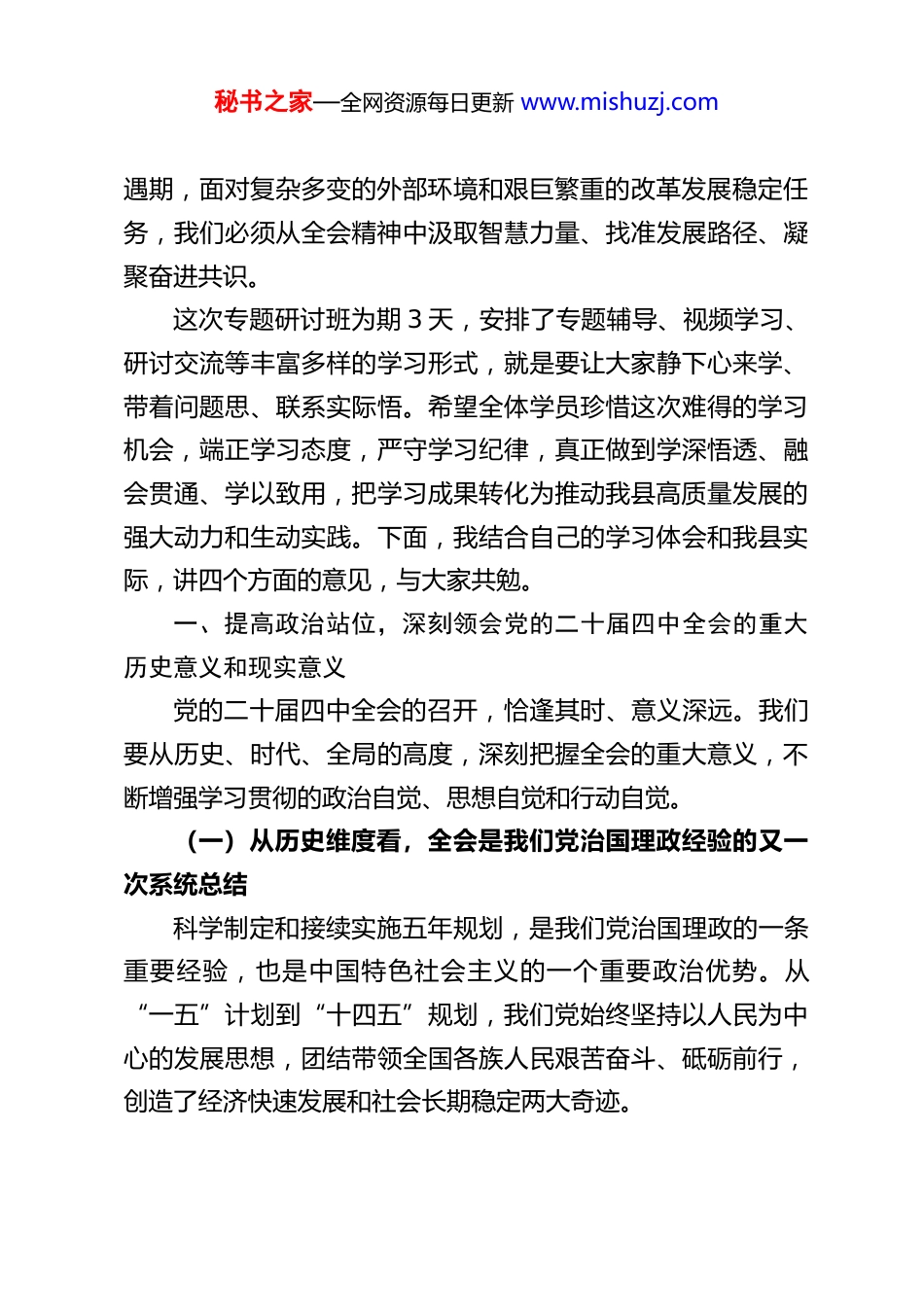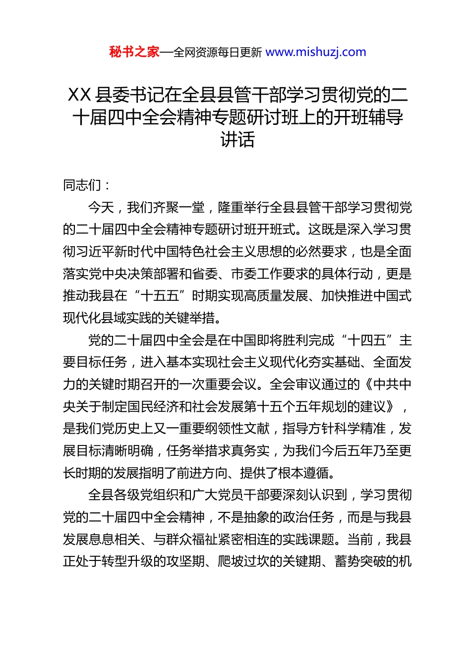 秘书之家—全网资源每日更新 www.mishuzj.comXX 县委书记在全县县管干部学习贯彻党的二十届四中全会精神专题研讨班上的开班辅导讲话同志们:今天,我们齐聚一堂,隆重举行全县县管干部学习贯彻党的二十届四中全会精神专题研讨班开班式。这既是深入学习贯彻习近平新时代中国特色社会主义思想的必然要求,也是全面落实党中央决策部署和省委、市委工作要求的具体行动,更是推动我县在“十五五”时期实现高质量发展、加快推进中国式现代化县域实践的关键举措。党的二十届四中全会是在中国即将胜利完成“十四五”主要目标任务,进入基本实现社会主义现代化夯实基础、全面发力的关键时期召开的一次重要会议。全会审议通过的《中共中央关于制定国民经济和社会发展第十五个五年规划的建议》,是我们党历史上又一重要纲领性文献,指导方针科学精准,发展目标清晰明确,任务举措求真务实,为我们今后五年乃至更长时期的发展指明了前进方向、提供了根本遵循。全县各级党组织和广大党员干部要深刻认识到,学习贯彻党的二十届四中全会精神,不是抽象的政治任务,而是与我县发展息息相关、与群众福祉紧密相连的实践课题。当前,我县正处于转型升级的攻坚期、爬坡过坎的关键期、蓄势突破的机秘书之家—全网资源每日更新 www.mishuzj.com遇期,面对复杂多变的外部环境和艰巨繁重的改革发展稳定任务,我们必须从全会精神中汲取智慧力量、找准发展路径、凝聚奋进共识。这次专题研讨班为期 3 天,安排了专题辅导、视频学习、研讨交流等丰富多样的学习形式,就是要让大家静下心来学、带着问题思、联系实际悟。希望全体学员珍惜这次难得的学习机会,端正学习态度,严守学习纪律,真正做到学深悟透、融会贯通、学以致用,把学习成果转化为推动我县高质量发展的强大动力和生动实践。下面,我结合自己的学习体会和我县实际,讲四个方面的意见,与大家共勉。一、提高政治站位,深刻领会党的二十届四中全会的重大历史意义和现实意义党的二十届四中全会的召开,恰逢其时、意义深远。我们要从历史、时代、全局的高度,深刻把握全会的重大意义,不断增强学习贯彻的政治自觉、思想自觉和行动自觉。(一)从历史维度看,全会是我们党治国理政经验的又一次系统总结科学制定和接续实施五年规划,是我们党治国理政的一条重要经验,也是中国特色社会主义的一个重要政治优势。从“一五”计划到“十四五”规划,我们党始终坚持以人民为中心的发展思想,团结带领全国各族人民艰苦奋斗、砥砺前行,创造了经济快速发展和社会长期稳定两大奇迹。秘书之家—全网资源每日更新 www.mishuzj.com党的二十届四中全会审议通过的“十五五”规划建议,是对我们党治国理政经验的进一步丰富和发展,是承前启后、继往开来的战略部署。回顾党的十八大以来的发展历程,在以习近平同志为核心的党中央坚强领导下,我们攻克了许多长期没有解决的难题,办成了许多事关长远的大事要事,推动党和国家事业取得历史性成就、发生历史性变革。“十四五”时期,我县也紧跟国家发展步伐,经济社会发展取得了显著成效,地区生产总值稳步增长,基础设施不断完善,民生福祉持续提升,生态环境更加优美,这些成就的取得,根本在于有习近平新时代中国特色社会主义思想的科学指引,在于党中央的坚强领导,在于全县上下的团结奋斗。站在新的历史起点上,党的二十届四中全会为我们擘画了“十五五”时期发展的宏伟蓝图,这是我们党带领人民在全面建设社会主义现代化国家新征程上的又一次总动员、总部署。我们要深刻认识到,只有始终坚持党的领导,始终遵循党的执政规律、社会主义建设规律、人类社会发展规律,才能确保我县发展始终沿着正确方向前进,才能在新的历史征程上不断续写新的辉煌。(二)从时代维度看,全会是应对风险挑战、赢得战略主动的必然要求当前,世界百年变局加速演进,国际力量对比深刻调整,世界变乱交织、动荡加剧,大国博弈更加复杂激烈,外部环境秘书之家—全网资源每日更新 www.mishuzj.com的不稳定、不确定性上升,风险挑战增多。从国内看,我国经济基础稳、优势多、韧性强、潜能大,长期向好的支撑条件和基本趋势没有变,但也面...