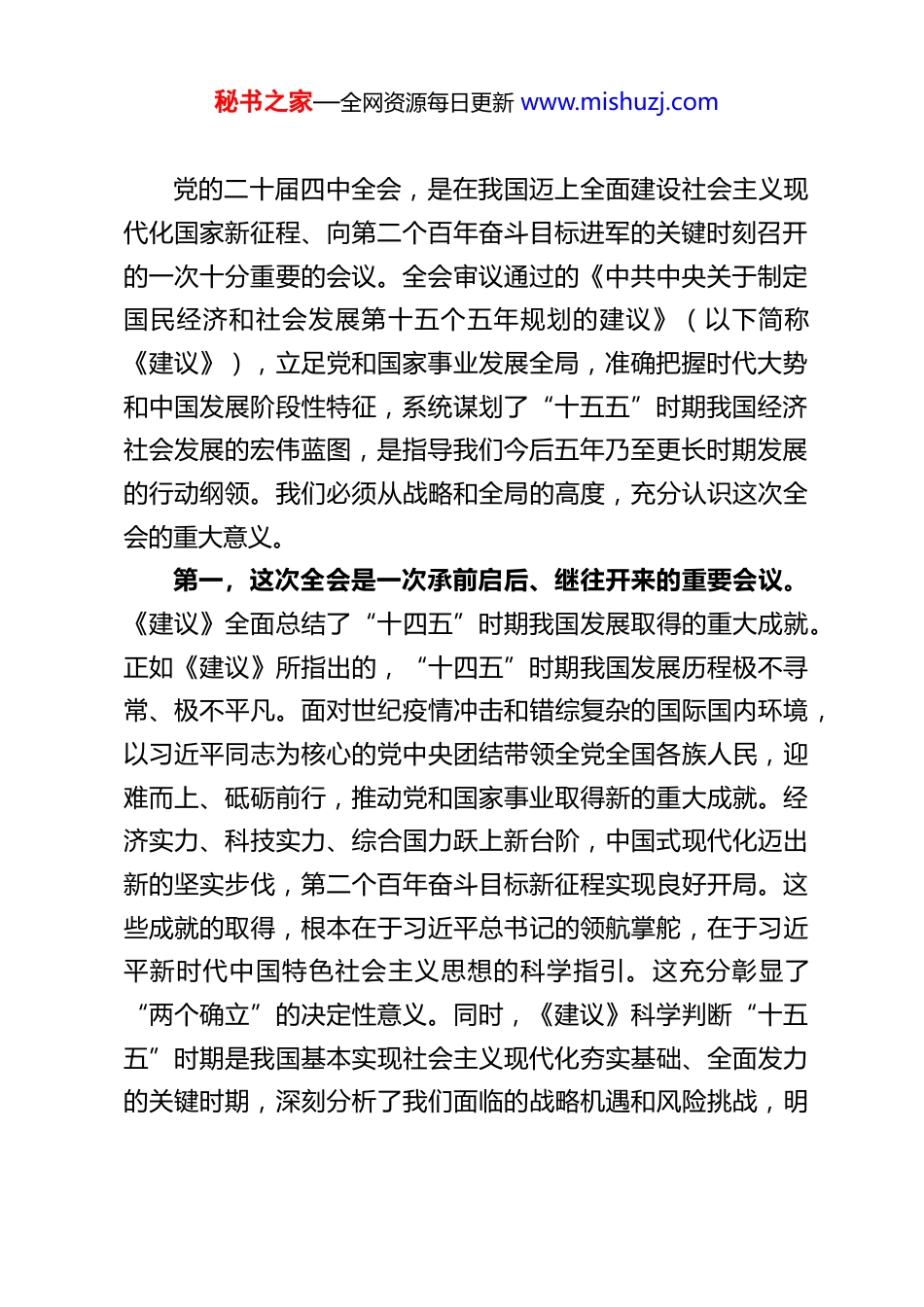 秘书之家—全网资源每日更新 www.mishuzj.comXX 县委书记在全县科级领导干部学习贯彻党的二十届四中全会精神集中轮训班上的开班辅导讲话同志们:今天,我们在这里隆重举行全县科级领导干部学习贯彻党的二十届四中全会精神集中轮训班开班式。这是县委着眼当前形势任务、加强干部队伍能力建设、推动党中央决策部署在 XX落地生根的一项重要举措。主要目的是通过集中学习研讨,引导大家进一步深刻领会、准确把握党的二十届四中全会的核心要义、精神实质和实践要求,特别是深刻理解《中共中央关于制定国民经济和社会发展第十五个五年规划的建议》这一纲领性文件,切实把思想和行动统一到党中央的决策部署上来,把智慧和力量凝聚到实现“十五五”规划确定的目标任务上来,以更加饱满的热情、更加昂扬的斗志、更加务实的作风,奋力谱写 XX 高质量发展新篇章,为全市、全省乃至全国发展大局作出应有贡献。下面,结合个人学习体会和 XX 实际,就深入学习贯彻党的二十届四中全会精神,抓好“十五五”时期各项工作,讲几点意见,与大家共同交流。一、提高政治站位,深刻认识党的二十届四中全会的重大意义,切实增强学习贯彻的思想自觉、政治自觉和行动自觉秘书之家—全网资源每日更新 www.mishuzj.com党的二十届四中全会,是在我国迈上全面建设社会主义现代化国家新征程、向第二个百年奋斗目标进军的关键时刻召开的一次十分重要的会议。全会审议通过的《中共中央关于制定国民经济和社会发展第十五个五年规划的建议》(以下简称《建议》),立足党和国家事业发展全局,准确把握时代大势和中国发展阶段性特征,系统谋划了“十五五”时期我国经济社会发展的宏伟蓝图,是指导我们今后五年乃至更长时期发展的行动纲领。我们必须从战略和全局的高度,充分认识这次全会的重大意义。第一,这次全会是一次承前启后、继往开来的重要会议。《建议》全面总结了“十四五”时期我国发展取得的重大成就。正如《建议》所指出的,“十四五”时期我国发展历程极不寻常、极不平凡。面对世纪疫情冲击和错综复杂的国际国内环境,以习近平同志为核心的党中央团结带领全党全国各族人民,迎难而上、砥砺前行,推动党和国家事业取得新的重大成就。经济实力、科技实力、综合国力跃上新台阶,中国式现代化迈出新的坚实步伐,第二个百年奋斗目标新征程实现良好开局。这些成就的取得,根本在于习近平总书记的领航掌舵,在于习近平新时代中国特色社会主义思想的科学指引。这充分彰显了“两个确立”的决定性意义。同时,《建议》科学判断“十五五”时期是我国基本实现社会主义现代化夯实基础、全面发力的关键时期,深刻分析了我们面临的战略机遇和风险挑战,明秘书之家—全网资源每日更新 www.mishuzj.com确了“十五五”时期经济社会发展的指导思想、必须遵循的原则和主要目标。这为我们立足新起点、开启新征程指明了前进方向、提供了根本遵循。我们要深刻认识到,“十五五”时期是 XX 发展至关重要的五年,能否抓住机遇、应对挑战,能否在新的历史起点上实现更大发展,直接关系到我们能否为2035 年基本实现社会主义现代化奠定坚实基础。全县各级领导干部必须增强历史使命感和责任感,切实把学习贯彻全会精神作为当前和今后一个时期的重大政治任务抓紧抓实。第二,这次全会是一次擘画蓝图、指引方向的战略部署。《建议》紧紧围绕以中国式现代化全面推进中华民族伟大复兴这一中心任务,对“十五五”时期经济社会发展作出了全面系统部署。从建设现代化产业体系到加快高水平科技自立自强,从建设强大国内市场到构建高水平社会主义市场经济体制,从扩大高水平对外开放到加快农业农村现代化,从优化区域经济布局到激发文化创新活力,从保障改善民生到建设美丽中国,从统筹发展和安全到推进国防军队现代化,涵盖了经济社会发展的方方面面。这些部署既有宏观战略指引,又有具体任务要求;既体现了对发展规律的深刻把握,又回应了人民群众的新期待;既坚持了问题导向,补齐短板弱项,又突出了优势再造,塑造新动能。我们要深刻领会《建议》所蕴含的战略思维、系统观念和创新精神,自觉把 XX 的发展放在全国、全省、全市...