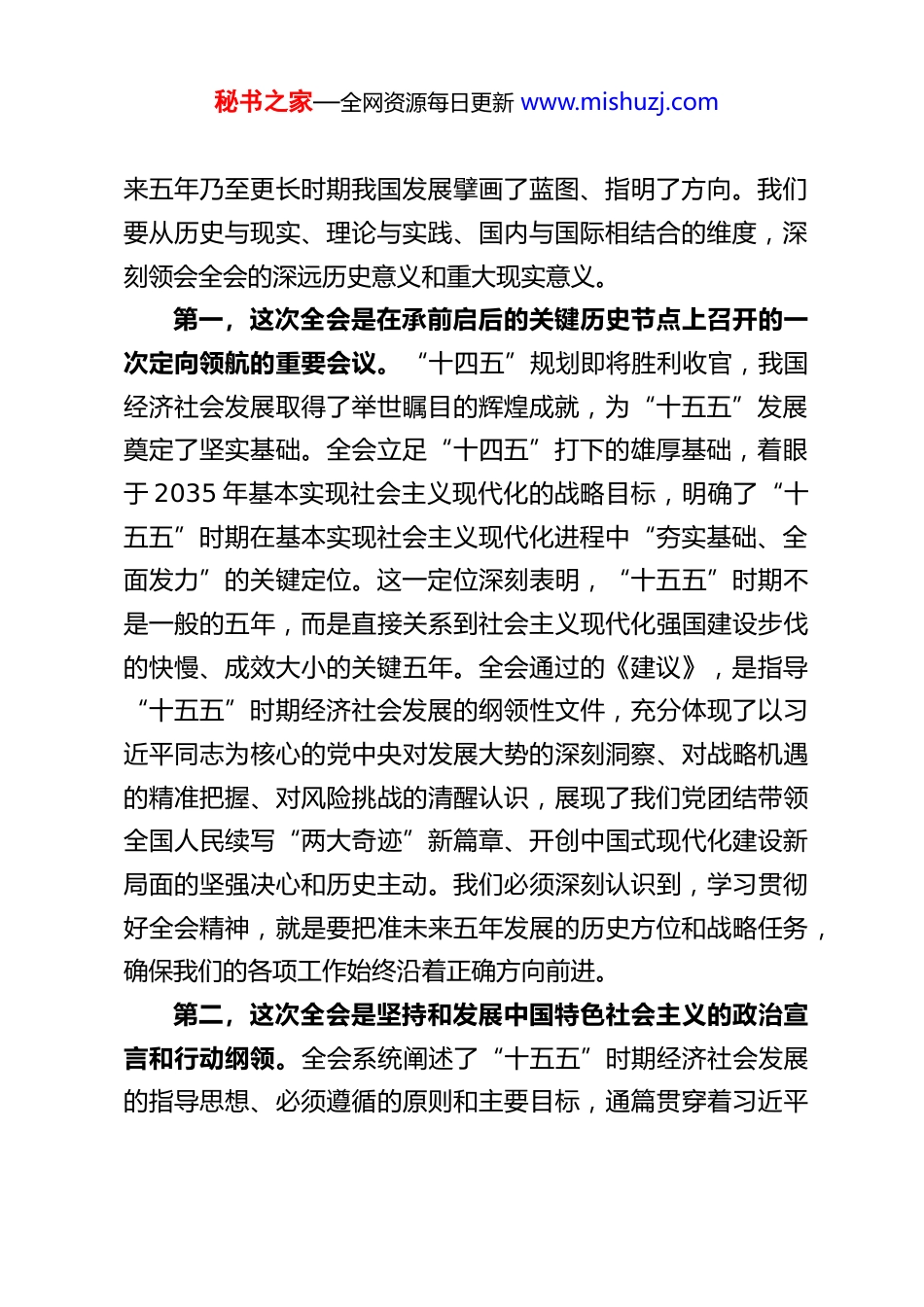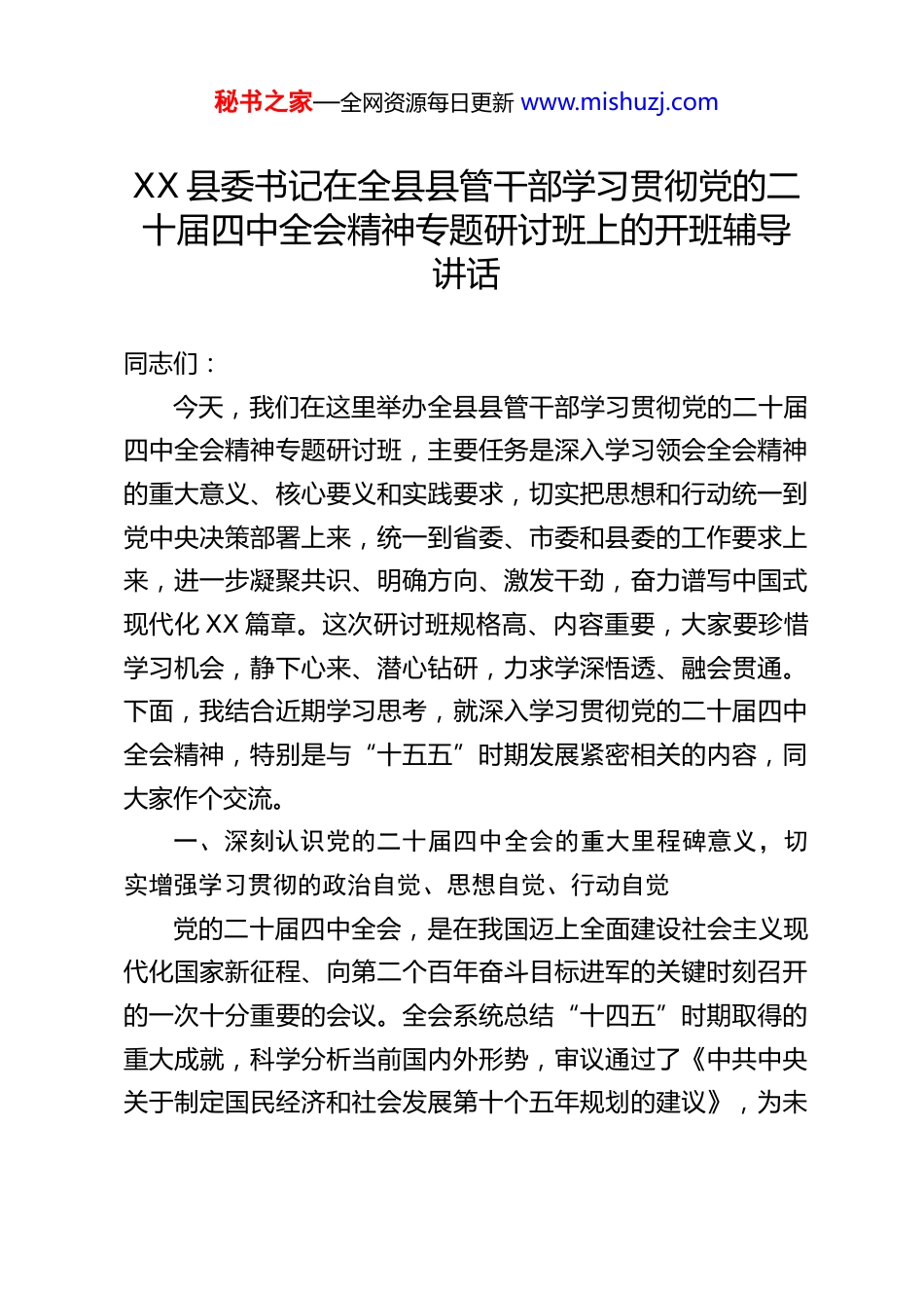 秘书之家—全网资源每日更新 www.mishuzj.comXX 县委书记在全县县管干部学习贯彻党的二十届四中全会精神专题研讨班上的开班辅导讲话同志们:今天,我们在这里举办全县县管干部学习贯彻党的二十届四中全会精神专题研讨班,主要任务是深入学习领会全会精神的重大意义、核心要义和实践要求,切实把思想和行动统一到党中央决策部署上来,统一到省委、市委和县委的工作要求上来,进一步凝聚共识、明确方向、激发干劲,奋力谱写中国式现代化 XX 篇章。这次研讨班规格高、内容重要,大家要珍惜学习机会,静下心来、潜心钻研,力求学深悟透、融会贯通。下面,我结合近期学习思考,就深入学习贯彻党的二十届四中全会精神,特别是与“十五五”时期发展紧密相关的内容,同大家作个交流。一、深刻认识党的二十届四中全会的重大里程碑意义,切实增强学习贯彻的政治自觉、思想自觉、行动自觉党的二十届四中全会,是在我国迈上全面建设社会主义现代化国家新征程、向第二个百年奋斗目标进军的关键时刻召开的一次十分重要的会议。全会系统总结“十四五”时期取得的重大成就,科学分析当前国内外形势,审议通过了《中共中央关于制定国民经济和社会发展第十个五年规划的建议》,为未秘书之家—全网资源每日更新 www.mishuzj.com来五年乃至更长时期我国发展擘画了蓝图、指明了方向。我们要从历史与现实、理论与实践、国内与国际相结合的维度,深刻领会全会的深远历史意义和重大现实意义。第一,这次全会是在承前启后的关键历史节点上召开的一次定向领航的重要会议。“十四五”规划即将胜利收官,我国经济社会发展取得了举世瞩目的辉煌成就,为“十五五”发展奠定了坚实基础。全会立足“十四五”打下的雄厚基础,着眼于 2035 年基本实现社会主义现代化的战略目标,明确了“十五五”时期在基本实现社会主义现代化进程中“夯实基础、全面发力”的关键定位。这一定位深刻表明,“十五五”时期不是一般的五年,而是直接关系到社会主义现代化强国建设步伐的快慢、成效大小的关键五年。全会通过的《建议》,是指导“十五五”时期经济社会发展的纲领性文件,充分体现了以习近平同志为核心的党中央对发展大势的深刻洞察、对战略机遇的精准把握、对风险挑战的清醒认识,展现了我们党团结带领全国人民续写“两大奇迹”新篇章、开创中国式现代化建设新局面的坚强决心和历史主动。我们必须深刻认识到,学习贯彻好全会精神,就是要把准未来五年发展的历史方位和战略任务,确保我们的各项工作始终沿着正确方向前进。第二,这次全会是坚持和发展中国特色社会主义的政治宣言和行动纲领。全会系统阐述了“十五五”时期经济社会发展的指导思想、必须遵循的原则和主要目标,通篇贯穿着习近平秘书之家—全网资源每日更新 www.mishuzj.com新时代中国特色社会主义思想的世界观和方法论,彰显了中国特色社会主义制度的显著优势。比如,《建议》强调“坚持党的全面领导”是根本保证,“坚持人民至上”是根本立场,“坚持高质量发展”是主题,“坚持全面深化改革”是根本动力,“坚持有效市场和有为政府相结合”是重要手段,“坚持统筹发展和安全”是重要保障。这些原则既是对长期以来我国发展实践经验的深刻总结,也是应对前进道路上风险挑战的制胜法宝。全会作出的各项部署,无论是建设现代化产业体系、加快科技自立自强,还是构建新发展格局、促进共同富裕,都深刻体现了对共产党执政规律、社会主义建设规律、人类社会发展规律认识的深化。我们要通过学习,深刻感悟党的创新理论的真理力量和实践伟力,不断增强对中国特色社会主义的信念信心,更加自觉地做共产主义远大理想和中国特色社会主义共同理想的坚定信仰者和忠实实践者。第三,这次全会为我们在新征程上抢抓机遇、应对挑战提供了根本遵循。当前,世界百年变局加速演进,不确定难预料因素增多,我国发展进入战略机遇和风险挑战并存、不确定难预料因素增多的时期。全会《建议》对国际国内形势作出了科学判断,既指出了我国发展具有的多方面显著优势和有利条件,也深刻剖析了面临的问题和挑战。比如,国内有效需求不足、国内大循环存在卡点堵点、重点领域风险隐患...