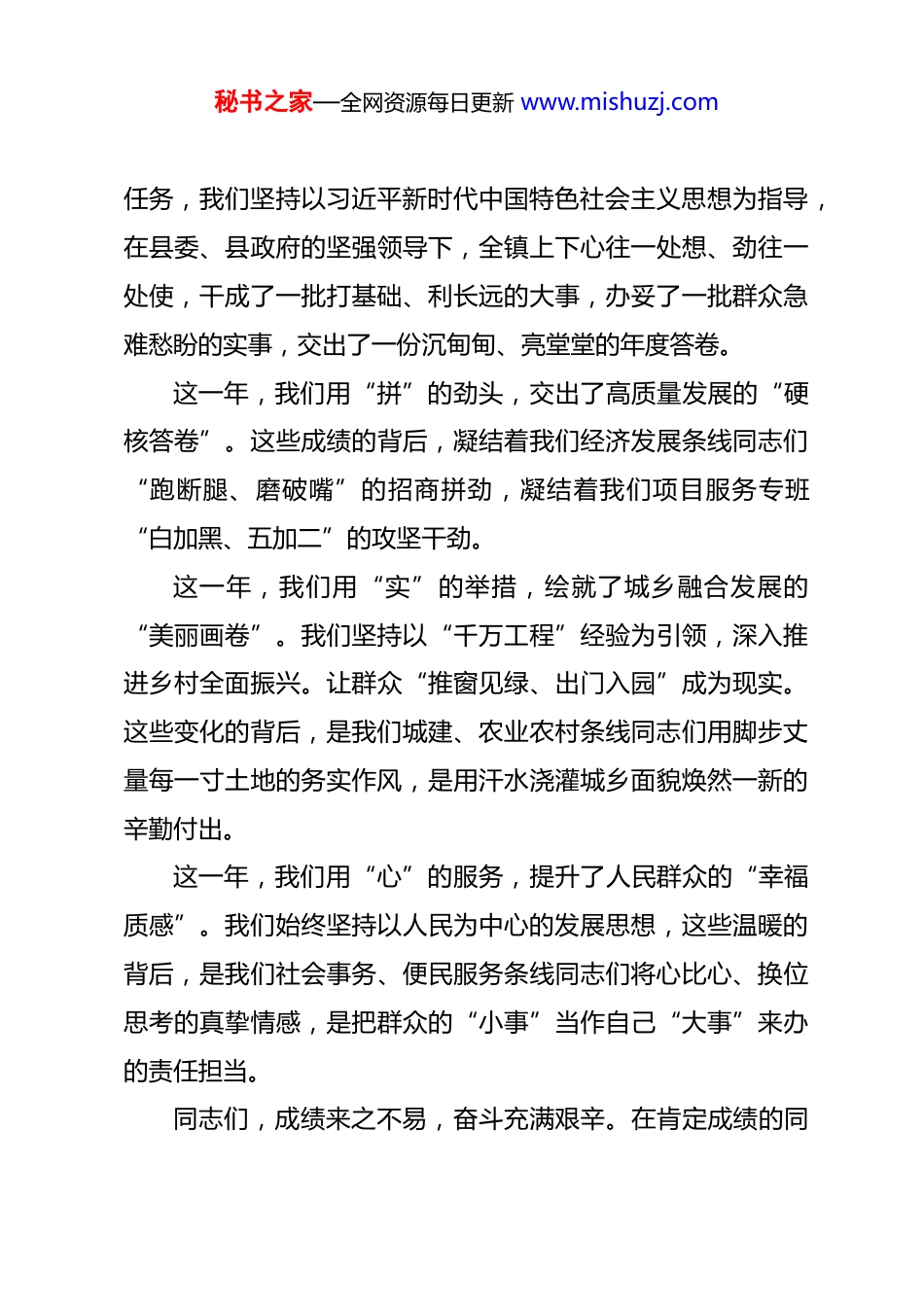 秘书之家—全网资源每日更新 www.mishuzj.com在 2026 年春节放假前全镇机关干部会议上的讲话 同志们:“东风随春归,发我枝上花。”伴随着冬日的暖阳和渐浓的年味,我们即将迎来中华民族最隆重、最喜庆的传统佳节——春节。今天,我们在这里召开春节放假前全镇机关干部会议,主要目的有三个:一是共同回望我们携手走过的、极不平凡的2025 年,为大家的辛勤付出点赞、喝彩;二是就春节期间的重点工作进行再强调、再部署,确保全镇人民度过一个欢乐祥和、平安幸福的新春佳节;三是借此机会,给大家提个醒、鼓个劲,让我们以更加饱满的精神状态,迎接充满希望和挑战的 2026 年。在此,我谨代表镇党委、政府,向在座的各位同志,并通过你们,向一年来辛勤工作在全镇各条战线的广大干部职工、村(社)“两委”干部、网格员、志愿者,以及所有关心、支持镇发展的社会各界朋友们,致以最诚挚的感谢和最崇高的敬意!回首 2025 年,是全面贯彻落实党的二十届四中全会精神的深化之年,也是我镇在高质量发展道路上克难求进、砥砺前行的一年。面对复杂严峻的外部环境和艰巨繁重的改革发展稳定秘书之家—全网资源每日更新 www.mishuzj.com任务,我们坚持以习近平新时代中国特色社会主义思想为指导,在县委、县政府的坚强领导下,全镇上下心往一处想、劲往一处使,干成了一批打基础、利长远的大事,办妥了一批群众急难愁盼的实事,交出了一份沉甸甸、亮堂堂的年度答卷。这一年,我们用“拼”的劲头,交出了高质量发展的“硬核答卷”。这些成绩的背后,凝结着我们经济发展条线同志们“跑断腿、磨破嘴”的招商拼劲,凝结着我们项目服务专班“白加黑、五加二”的攻坚干劲。这一年,我们用“实”的举措,绘就了城乡融合发展的“美丽画卷”。我们坚持以“千万工程”经验为引领,深入推进乡村全面振兴。让群众“推窗见绿、出门入园”成为现实。这些变化的背后,是我们城建、农业农村条线同志们用脚步丈量每一寸土地的务实作风,是用汗水浇灌城乡面貌焕然一新的辛勤付出。这一年,我们用“心”的服务,提升了人民群众的“幸福质感”。我们始终坚持以人民为中心的发展思想,这些温暖的背后,是我们社会事务、便民服务条线同志们将心比心、换位思考的真挚情感,是把群众的“小事”当作自己“大事”来办的责任担当。同志们,成绩来之不易,奋斗充满艰辛。在肯定成绩的同秘书之家—全网资源每日更新 www.mishuzj.com时,我们更要感谢每一位为镇发展贡献了智慧和力量的奋斗者。在此,我想再次向大家道一声:辛苦了!谢谢大家!“雄关漫道真如铁,而今迈步从头越。”春节假期既是休整加油的“驿站”,也是谋划新篇的“起点”。越是喜庆祥和的时刻,越要保持清醒的头脑;越是阖家团圆的日子,越要绷紧安全的弦。下面,我重点就春节期间的工作,讲三点意见。一、绷紧“安全弦”,守护万家灯火,确保度过一个平安祥和的春节安全是发展的前提,是民生的头等大事,更是人民幸福安康的基本保障。春节期间,人流、物流、车流高度集中,各类风险隐患交织叠加,安全稳定工作面临重大考验。全镇上下必须牢固树立“万无一失、一失万无”的底线思维,以“时时放心不下”的责任感,把安全责任扛在肩上、抓在手上。一是要把安全生产的责任压得更实。各分管领导、各部门负责人要严格落实“党政同责、‘一岗双责’、齐抓共管、失职追责”和“三管三必须”的要求,亲自带队,立即在全镇范围内开展一次拉网式、地毯式的安全生产大检查、大整治。要紧盯烟花爆竹、危化品、建筑施工、工贸企业等重点行业领域,聚焦“九小场所”、多业态混合生产经营场所、人员密集场所等重点部位,全面排查整治消防、燃气、用电等各类安全隐患。秘书之家—全网资源每日更新 www.mishuzj.com对检查中发现的问题,要建立台账、限期整改、闭环销号,坚决杜绝“走过场”“一阵风”。对于节日期间正常生产经营的企业,要督促其严格落实主体责任,加强员工安全培训和应急演练,确保安全生产万无一失。二是要把社会面稳定的防线筑得更牢。综治、公安、司法等部门要加强联动,加大对重点区域、重点路段的巡逻防控力度,严厉打击盗窃、诈骗等各类...