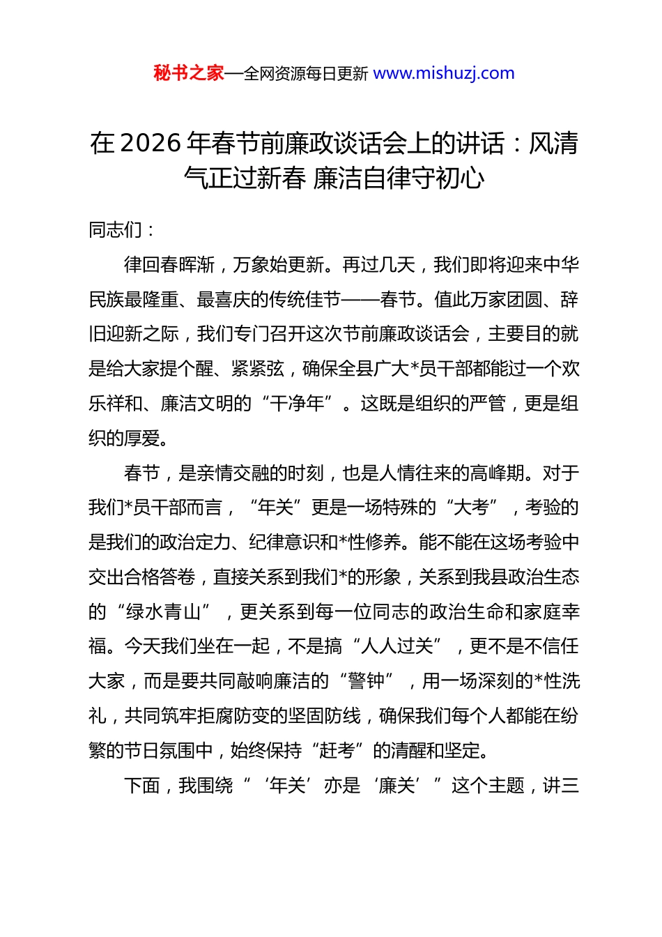 秘书之家—全网资源每日更新 www.mishuzj.com在 2026 年春节前廉政谈话会上的讲话:风清气正过新春 廉洁自律守初心同志们:律回春晖渐,万象始更新。再过几天,我们即将迎来中华民族最隆重、最喜庆的传统佳节——春节。值此万家团圆、辞旧迎新之际,我们专门召开这次节前廉政谈话会,主要目的就是给大家提个醒、紧紧弦,确保全县广大*员干部都能过一个欢乐祥和、廉洁文明的“干净年”。这既是组织的严管,更是组织的厚爱。春节,是亲情交融的时刻,也是人情往来的高峰期。对于我们*员干部而言,“年关”更是一场特殊的“大考”,考验的是我们的政治定力、纪律意识和*性修养。能不能在这场考验中交出合格答卷,直接关系到我们*的形象,关系到我县政治生态的“绿水青山”,更关系到每一位同志的政治生命和家庭幸福。今天我们坐在一起,不是搞“人人过关”,更不是不信任大家,而是要共同敲响廉洁的“警钟”,用一场深刻的*性洗礼,共同筑牢拒腐防变的坚固防线,确保我们每个人都能在纷繁的节日氛围中,始终保持“赶考”的清醒和坚定。下面,我围绕“‘年关’亦是‘廉关’”这个主题,讲三秘书之家—全网资源每日更新 www.mishuzj.com点意见,与同志们共勉。一、提高政治站位,深刻把握“廉关”失守的极端危害性,始终做到心中有*、心中有民“廉者,政之本也。”廉洁自律,从来不是个人小节,而是检验*员干部是否对*忠诚、不负人民负责的“试金石”。在节日期间守不住“廉关”,看似是一时糊涂、一念之差,实则是*性不纯、宗旨动摇的集中体现,其危害是全局性的、根本性的。(一)守不住“廉关”,就是对政治忠诚的背叛衡量一名干部是否做到“两个维护”,不仅要看他说了什么,更要看他在关键时刻、在无人监督时做了什么。节假日,恰恰是这样一个最能检验干部政治成色的“关键时刻”。中央反复强调,全面从严治*永远在路上,*的自我革命永远在路上。如果我们嘴上喊着向中央看齐,行动上却在“过节”这个具体问题上打了折扣、搞了变通,收点礼品、吃顿宴请就觉得“问题不大”,这就是典型的“口是心非”,是政治上的“两面人”。这种行为,看似是收了一点“小意思”,实际上是动摇了信仰的“大根基”,损害的是*的集中统一领导,侵蚀的是*的执政根基。我们必须清醒认识到,任何形式的节日腐败,都是对 dj 国法的公然挑战,都是对*员干部忠诚干净担当政治品秘书之家—全网资源每日更新 www.mishuzj.com格的严重亵渎。(二)守不住“廉关”,就是对发展成果的践踏过去一年,我们全县上下凝心聚力、攻坚克难,经济社会发展取得了来之不易的成绩。地区生产总值预计突破*亿元大关,一批重大项目落地生根,城乡面貌日新月异,民生福祉持续改善。这些成绩的取得,是全县人民共同奋斗的结果,也凝聚着在座各位同志的心血和汗ت。然而,我们要时刻警惕,腐败是发展的最大毒瘤。一个贪腐案例,就可能毁掉一个团队多年的努力;一桌不该吃的饭,就可能带坏一个单位的风气;一份不该收的礼,就可能让一项惠民政策在执行中变了味。人民群众最痛恨的就是腐败现象,如果我们不能在廉洁问题上做出表率,就会严重挫伤干部群众干事创业的积极性,就会让我们辛辛苦苦取得的发展成果付诸东流。守护好发展成果,就必须先守护好我们自身的廉洁底线,用我们的清廉指数,换取人民的幸福指数和信任指数。(三)守不住“廉关”,就是对家庭幸福的透支*员干部也是普通人,也有家庭、有亲人。过节,图的就是家庭和睦、幸福团圆。但我们必须明白,廉洁才是家庭最稳固的“幸福基石”,纪法才是家人最可靠的“护身符”。很多落马干部的忏悔录中,都充满了对家庭的愧疚。他们曾经也想为秘书之家—全网资源每日更新 www.mishuzj.com家庭创造更好的条件,却因为一时的贪念,最终不仅毁了自己,也毁了整个家庭,让亲人蒙羞、抬不起头。同志们,我们一定要算好人生“七笔账”——政治账、经济账、名誉账、家庭账、亲情账、自由账、健康账。任何时候都不要抱有侥幸心理,不要以为自己的“小动作”神不知鬼不觉。天网恢恢,疏而不漏。为了自己和家人的长久幸福,我们必须时刻自重、自省、自警、自励,用清廉的家风,守...
