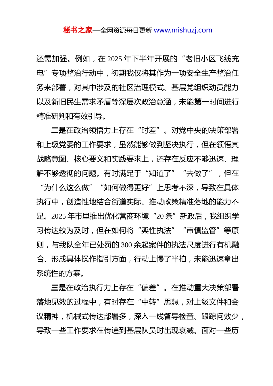 秘书之家—全网资源每日更新 www.mishuzj.com2025 年度民主生活会“五个带头”个人对照检查材料 根据**区纪委、区委组织部关于召开 2025 年度党员领导干部民主生活会的通知要求,我紧扣本次民主生活会主题,在深入学习领会党的二十届三中、四中全会精神和习近平总书记重要讲话精神,特别是关于作风建设的重要论述的基础上,通过群众提、自己找、上级点、互相帮等多种方式,广泛征求意见建议,并与班子成员、分管领域同志深入开展谈心谈话。在此基础上,我严格对照“五个带头”的具体要求,紧密联系个人思想、工作和生活实际,深入查摆自身存在的突出问题,深刻剖析问题产生的根源,并明确了今后的努力方向和整改措施。现将个人对照检查情况报告如下。一、存在的问题(一)在带头强化政治忠诚、提高政治能力方面一是在政治判断力上存在“温差”。对“国之大者”的理解和把握尚不够系统、深入,未能完全做到从政治高度审视和推进综合行政执法工作。有时在处理复杂敏感的执法案件时,更多地从法律条款、业务流程和维稳角度去考量,对背后可能蕴含的政治风险、意识形态动向等问题的政治敏锐性和鉴别力秘书之家—全网资源每日更新 www.mishuzj.com还需加强。例如,在 2025 年下半年开展的“老旧小区飞线充电”专项整治行动中,初期我仅将其作为一项安全生产整治任务来部署,对其中涉及的社区治理模式、基层党组织动员能力以及新旧民生需求矛盾等深层次政治意涵,未能第一时间进行精准研判和有效引导。二是在政治领悟力上存在“时差”。对党中央的决策部署和上级党委的工作要求,虽然能够做到坚决执行,但在领悟其战略意图、核心要义和实践要求上,还存在反应不够迅速、理解不够透彻的问题。有时满足于“知道了”“去做了”,但在“为什么这么做”“如何做得更好”上思考不深,导致在具体执行中,创造性地结合街道实际、推动政策精准落地的能力不足。2025 年市里推出优化营商环境“20 条”新政后,我组织学习传达较为及时,但在如何将“柔性执法”“审慎监管”等原则,与我队全年已处罚的 300 余起案件的执法尺度进行有机融合、形成具体操作指引方面,行动上慢了半拍,未能迅速拿出系统性的方案。三是在政治执行力上存在“偏差”。在推动重大决策部署落地见效的过程中,有时存在“中转”思想,对上级文件和会议精神,机械式传达部署多,深入一线督导检查、跟踪问效少,导致一些工作要求在传递到基层队员时出现衰减。面对一些历秘书之家—全网资源每日更新 www.mishuzj.com史遗留的“硬骨头”问题,如**路段长期存在的跨门营业现象,虽然组织了多轮集中整治,开具了近 50 份《责令改正通知书》,但由于缺乏“一竿子插到底”的韧劲和多部门联动破解难题的巧劲,问题至今仍有反复,反映出我在破解难题、推动工作闭环上,政治执行的穿透力有待提升。(二)在带头固本培元、增强党性方面一是以学铸魂的系统性不足。思想上存在“以干代学”的倾向,认为执法工作千头万绪,抓好业务就是最大的讲政治,对习近平新时代中国特色社会主义思想的系统学习不够。学习方式较为单一,多以参加集体学习、阅读文件为主,静下心来读原著、学原文、悟原理的时间较少。2025 年全年,我个人牵头处理的各类执法案卷超过 60 宗,处理群众来电来访投诉 400余人次,繁杂的事务性工作挤占了理论学习时间,导致理论素养的提升速度跟不上事业发展的需要,运用党的创新理论指导实践、破解执法难题的能力有待增强。二是以学正风的自觉性不够。对党章党规党纪的学习理解,有时停留在“知其然”的层面,对其精神实质和深刻内涵的“所以然”领悟不深,未能完全将纪律规矩的要求内化为思想自觉和行动自觉。在日常工作中,对一些队员中出现的“老好人”思想、工作标准不高等苗头性、倾向性问题,有时碍于情秘书之家—全网资源每日更新 www.mishuzj.com面,多以提醒谈话为主,批评教育的“辣味”不足,未能时时处处以党性原则来衡量和约束言行。这实质上是自我革命精神有所弱化,未能将全面从严治党的要求贯穿于队伍管理的每一个细节。三是以学促干的转化率不高。在理论联系实际上,存在一定的“两张皮”现...